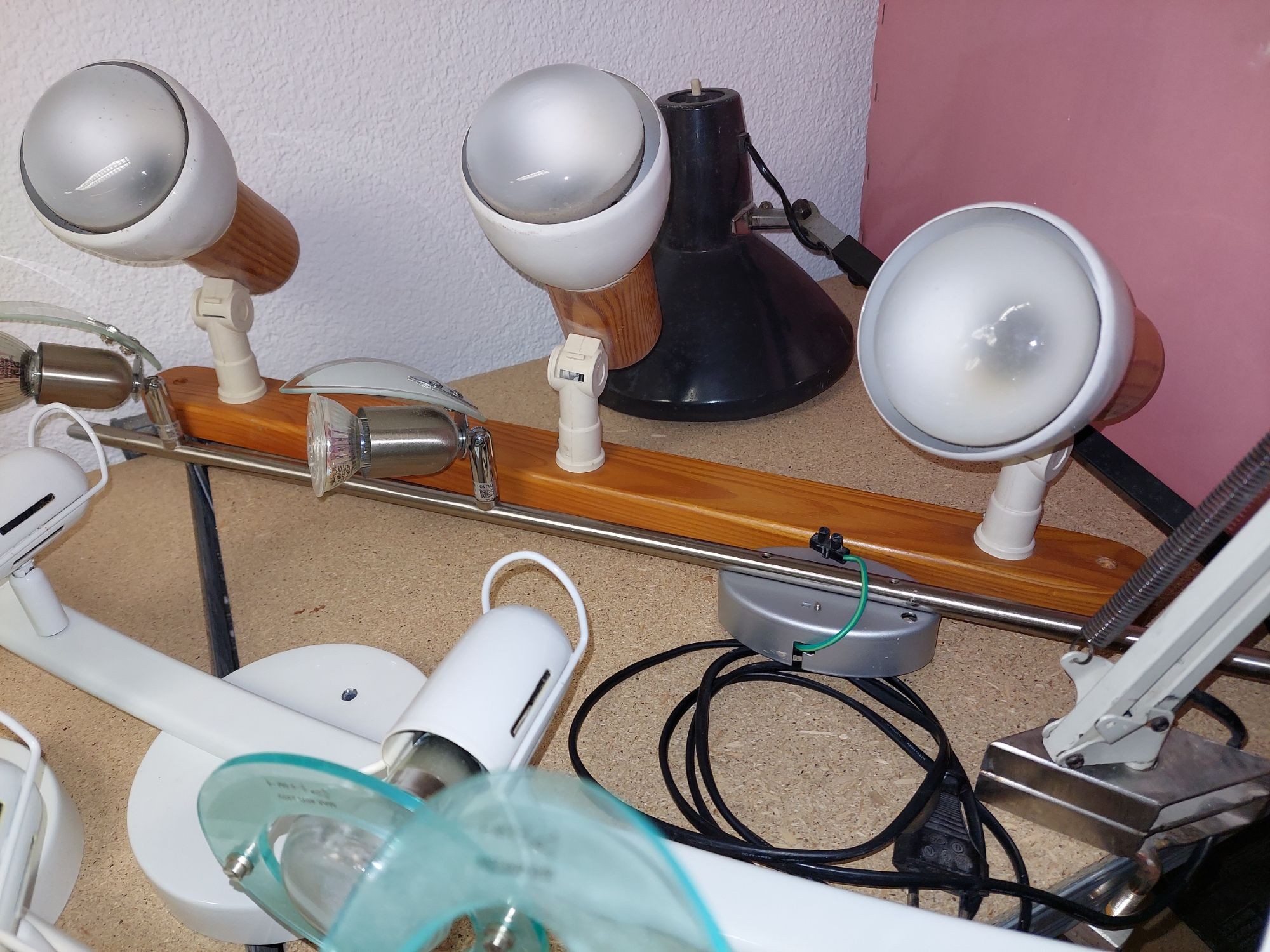 2 Deckenleuchten (Holz und Niro) mit 3–4 Strahlern, div.