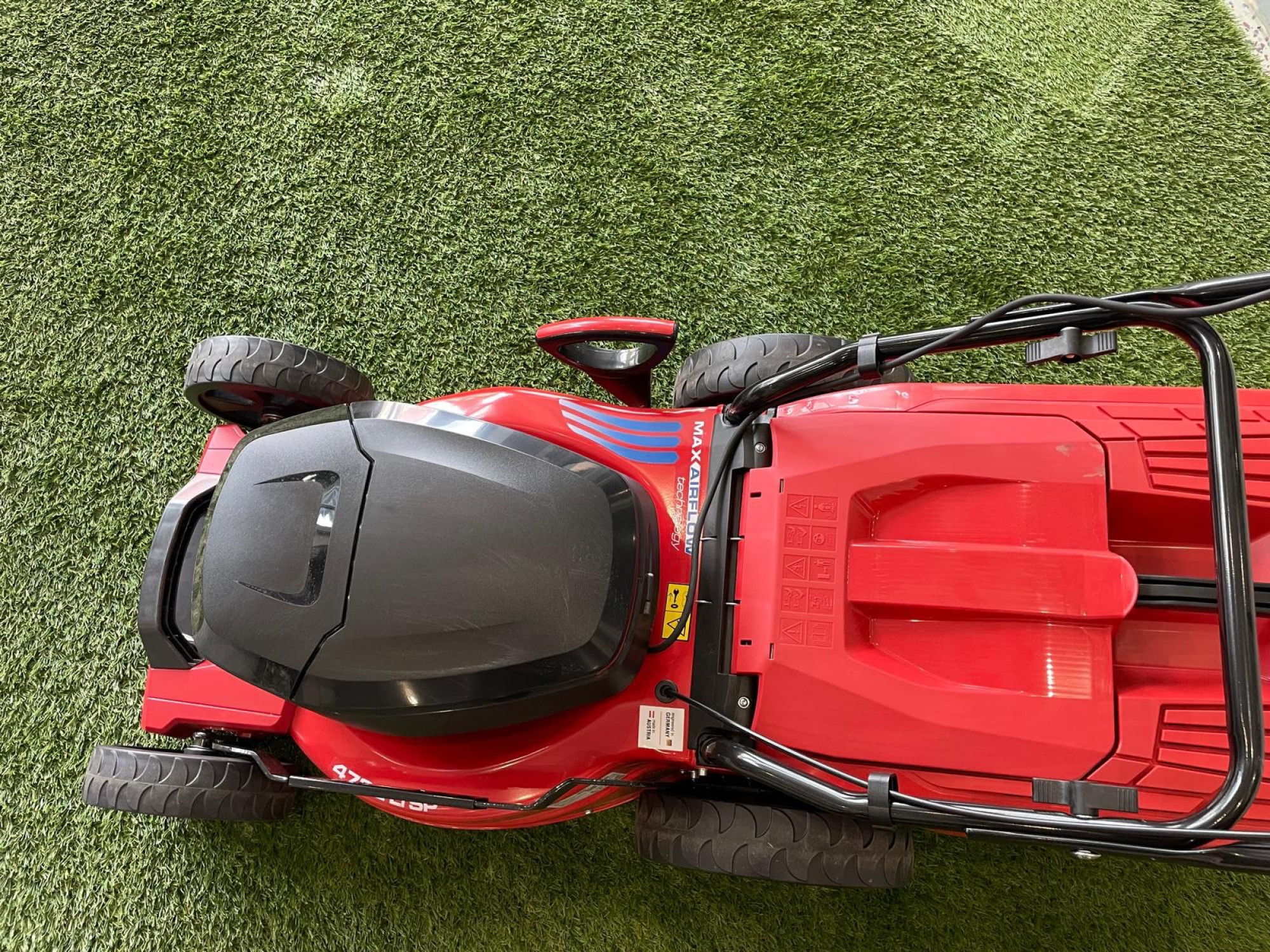36 V Lithium-Ionen-Akku (Akku und Ladegerät nicht im Lieferumfang), stabile Gewebe-/Kunststoff-Box mit Boxzunge und Boxfüllstandsanzeige, bequeme 7-fache zentrale Schnitthöhenverstellung, klappbarer Holm und Fronttragegriff für leichten Transport und platzsparende Aufbewahrung, Akkufach für bis zu zwei Akkus, kraftsparender 1-Gang Radantrieb
