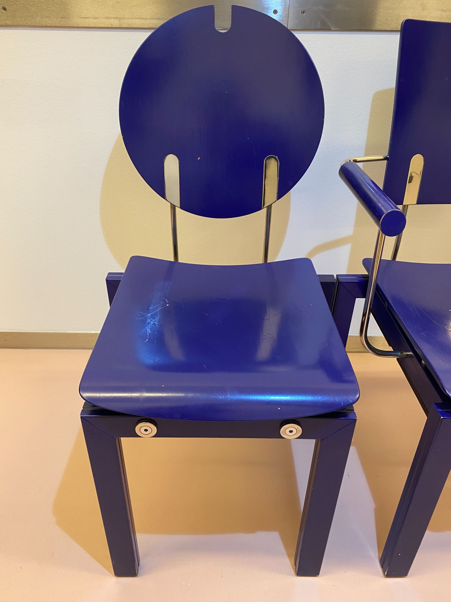 viereckige und runde Lehne, stapelbar, durch Schieber unter der Sitzfläche verbindbar