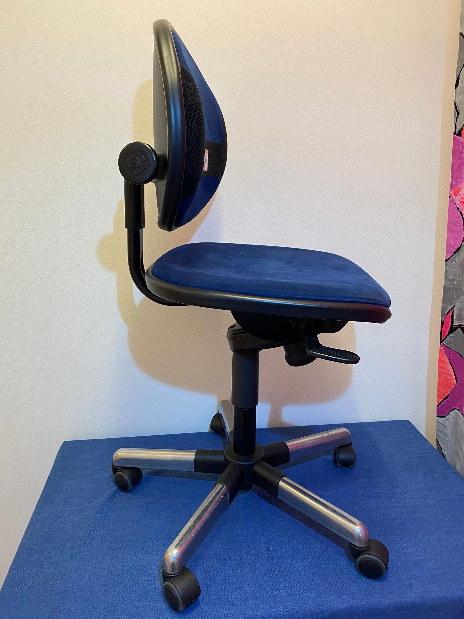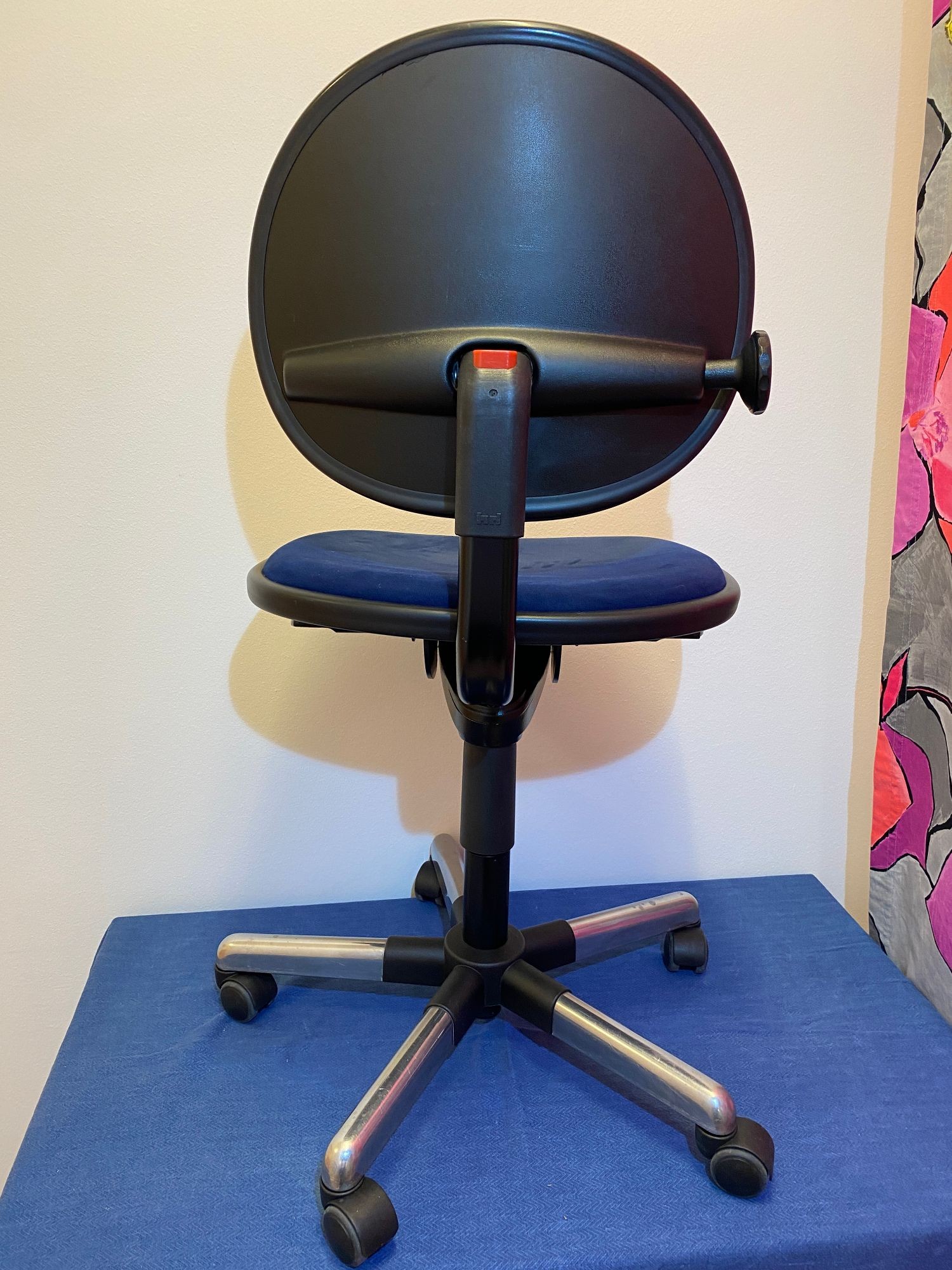 Rollen für Hartboden, höherverstellbar, Lehne verstellbar, dunkelblauer Bezug, kleiner Fleck