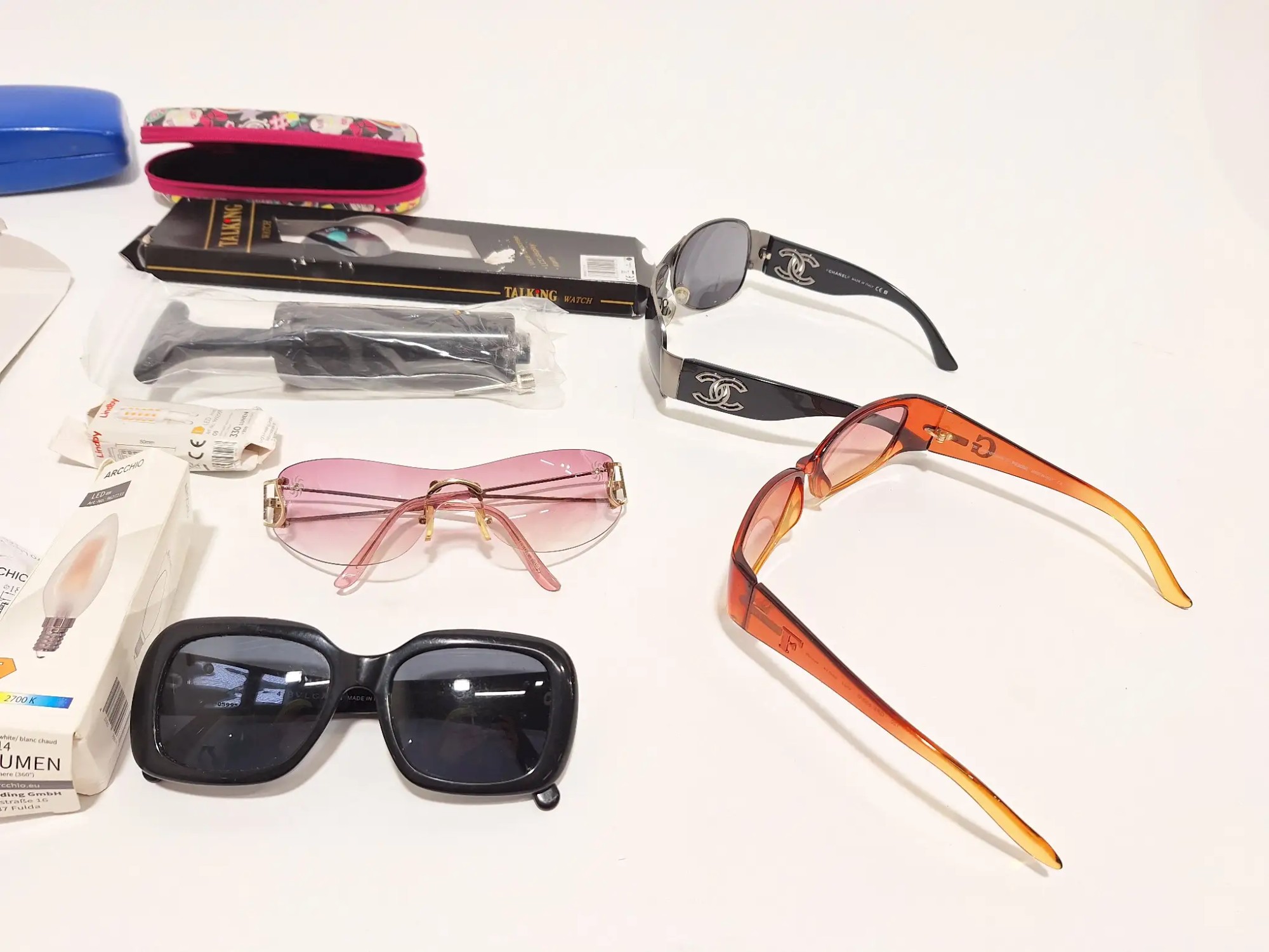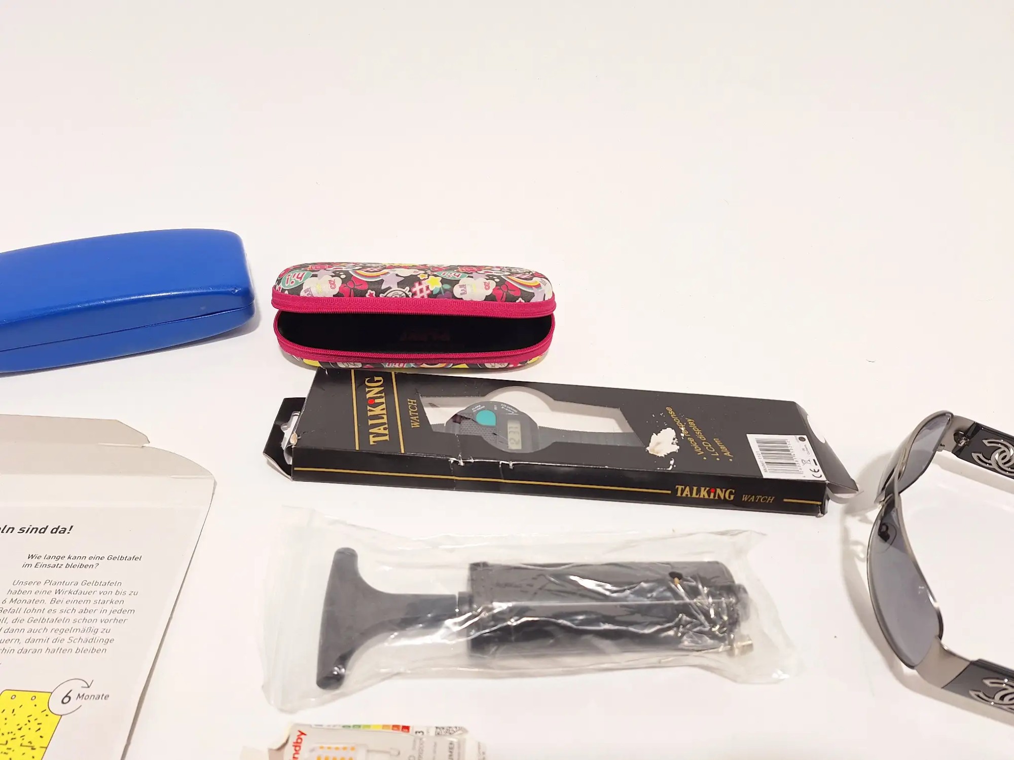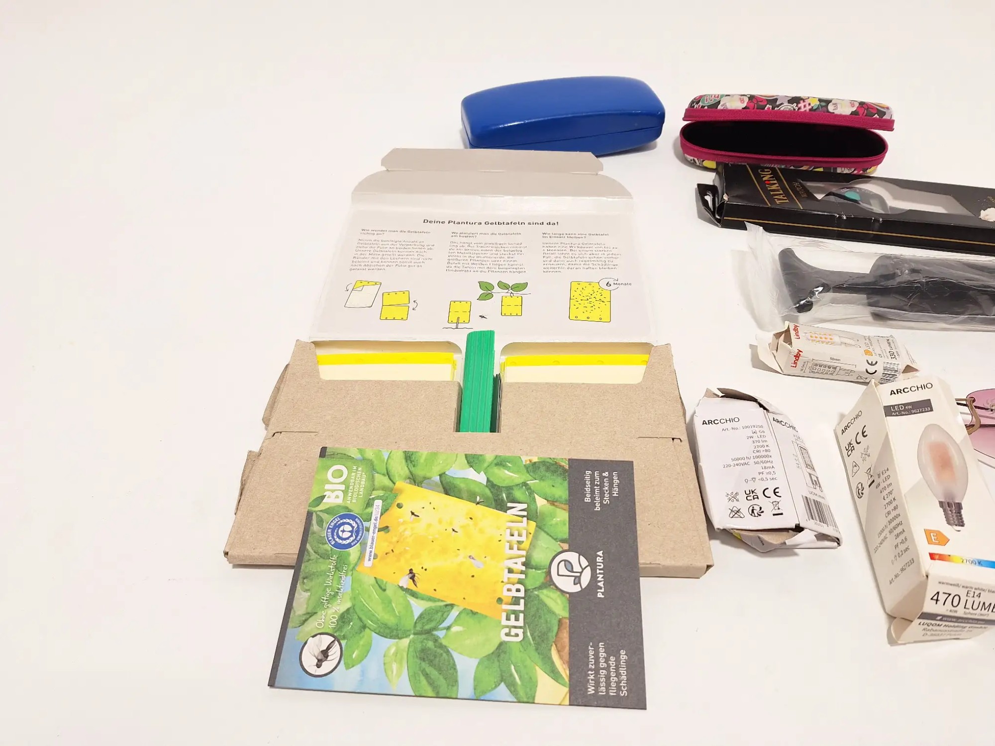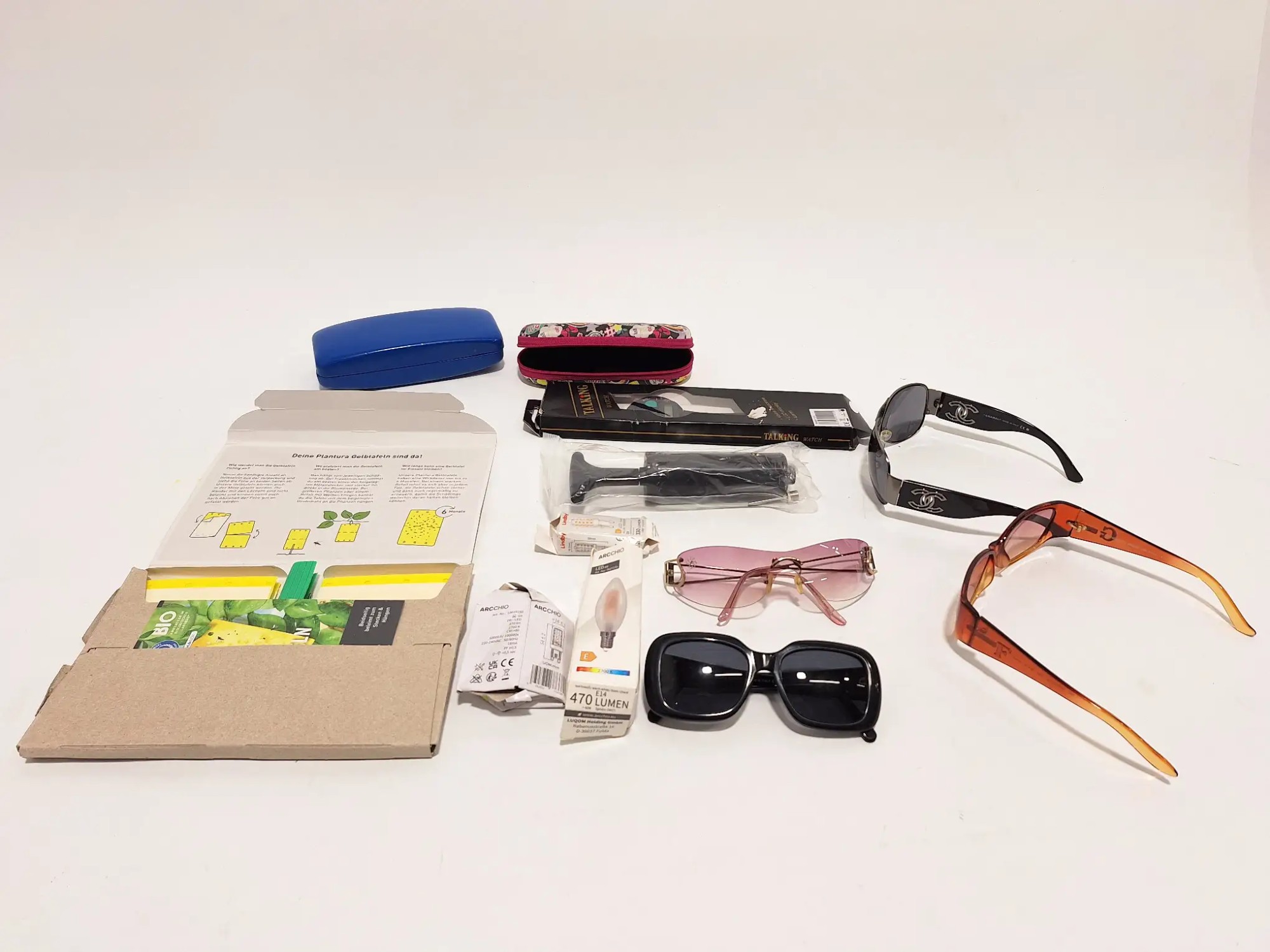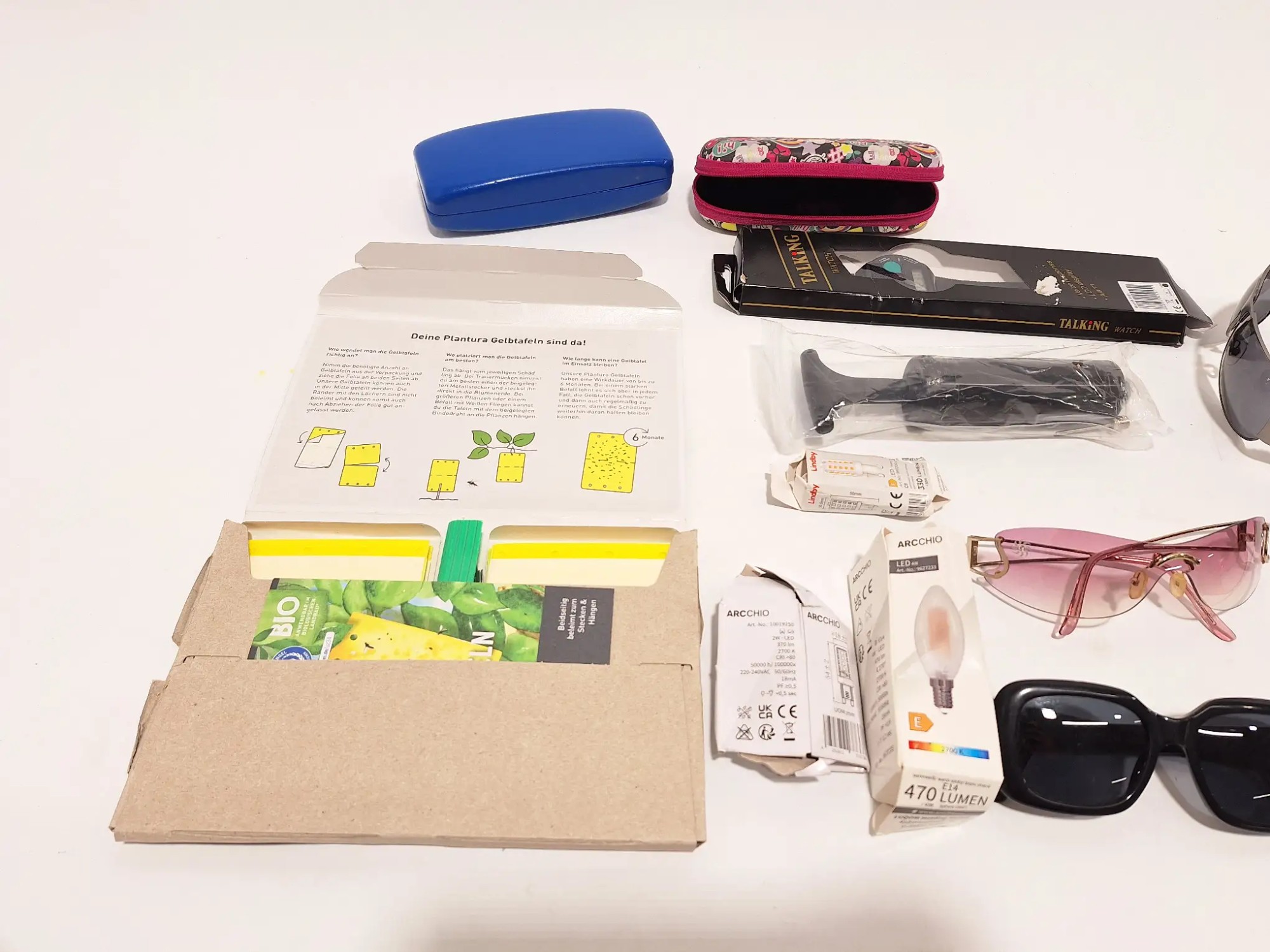 Gelb­ta­feln, Son­nen­bril­len, Luft­pum­pe, Uhr, Etuis, Leucht­mit­tel