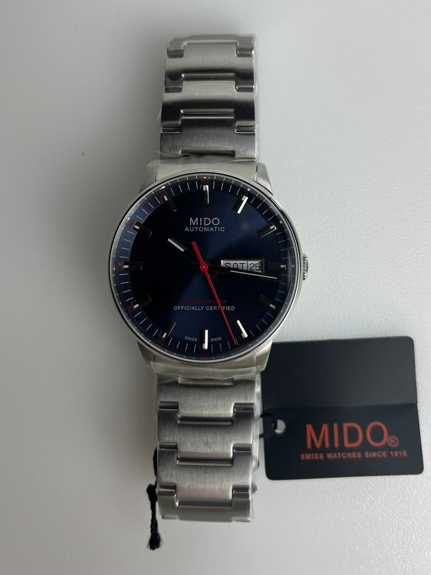 Neu OVP 2 Jahre Garantie M021.431.11.041.00 Diese Commander Uhr passt das ikonische Stück an die modernen Erwartungen an. Sie ist mit dem neuesten MIDO-Logo und einem abgestuften Zifferblatt sowie einem abgeschrägten Saphirglas versehen. Ihr Automatikwerk ist Chronometer-zertifiziert und bietet bis zu 80 Stunden Gangreserve. Kollektion Commander Wasserdichtigkeit 5 bar (50 m / 165 ft) Gewicht (g) 137 Gehäuseform Rund Gehäusematerial Edelstahl Glas Saphirglas Transparenter Gehäuseboden Länge (mm) 40.00 Breite (mm) 40.00 Gehäusehöhe (gesamt) (mm) 11.3 Bandanstoß (mm) 21.00 Zifferblattfarbe Blau Ziffern Indexe Uhrwerk MIDO Automatik Chronometer ETA Funktionen Datum, Tag, Silizium, Chronometer COSC Gangreserve bis zu 80 Stunden Zertifizierter Chronometer (COSC) Ja Band-Bezeichnung M605014391 Band Edelstahl Schließe Faltschließe