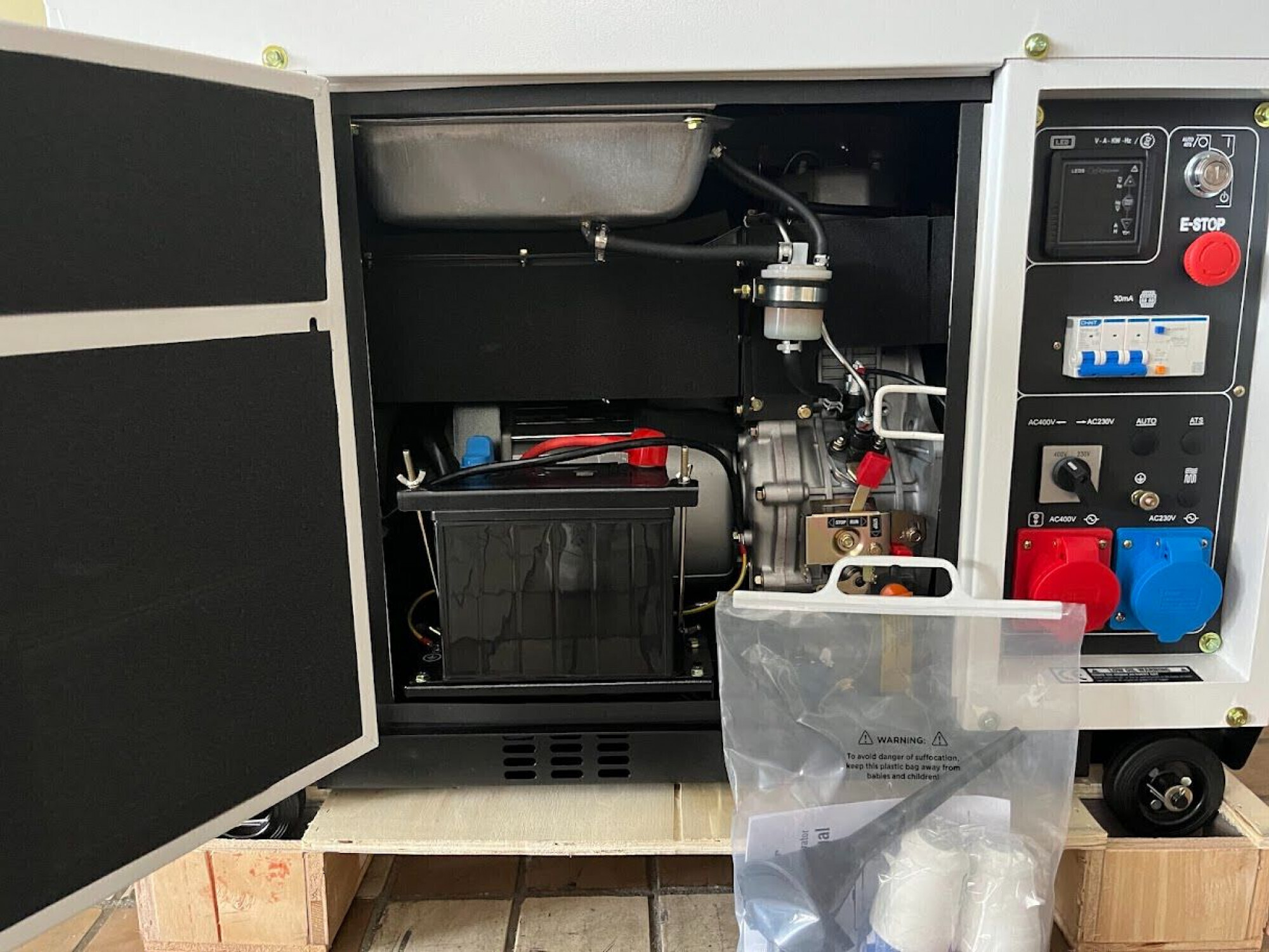 Maximalleistung: 7,9 kVA. Ungebraucht und originalverpackt. Volle Leistung auf 230 V und 400 V. 180 Grad öffenbare und versperrbare Tür. Gedämmter Schallschutzverbau. AVR-geregelt. Ca. 3000 U/min. Komfort-Elektrostart. LxBxH: 92 x 52 x 72 cm