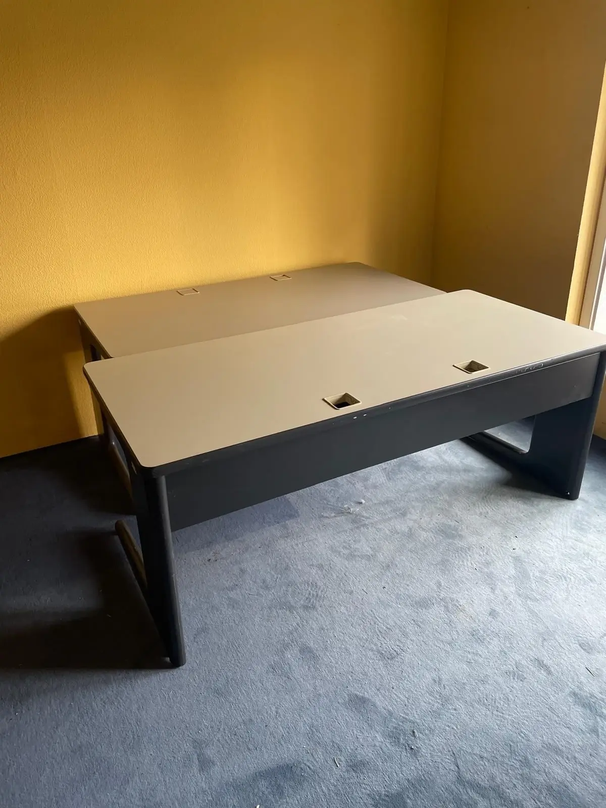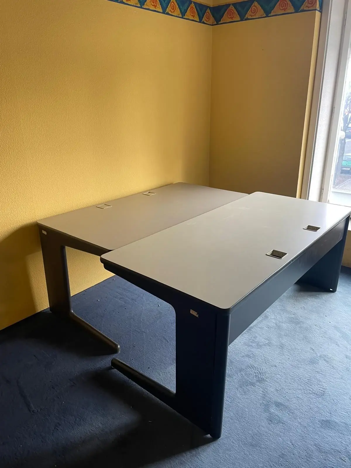 Bürotische mit Kabelkanal und 2 Kabelauslässen an der Arbeitsfläche mit robusten Metallfüßen. 2 verschiedene Längen: 180x81x72cm und 160x81x72cm.