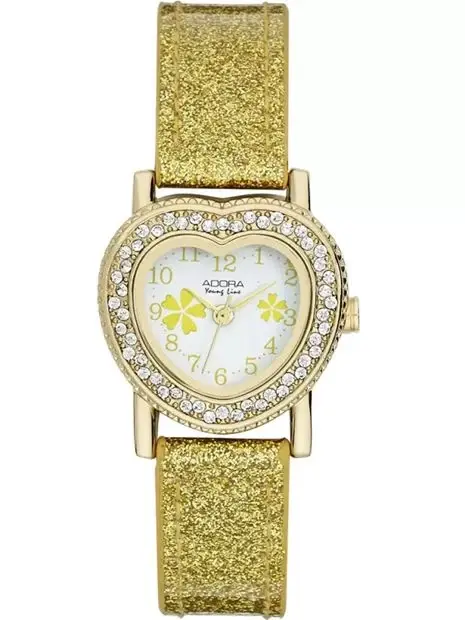 !NEUWARE! Neupreis: 32,52 €, Kinderuhr Adora Youngline mit Zirkonia in Gold. Die glitzernde Uhr in Herzform kommt an einem Armband aus Kunstleder mit rosa Riemen. Das kleine Gehäuse und das bequeme, verstellbare, gepolsterte Armband eignen sich für Kinder im Alter von 5–10 Jahren und halten den täglichen Herausforderungen stand. Sie verfügt über ein hochwertiges Quarzuhrwerk, eine langlebige, austauschbare japanische Batterie und eine spritzwassergeschützte Konstruktion.