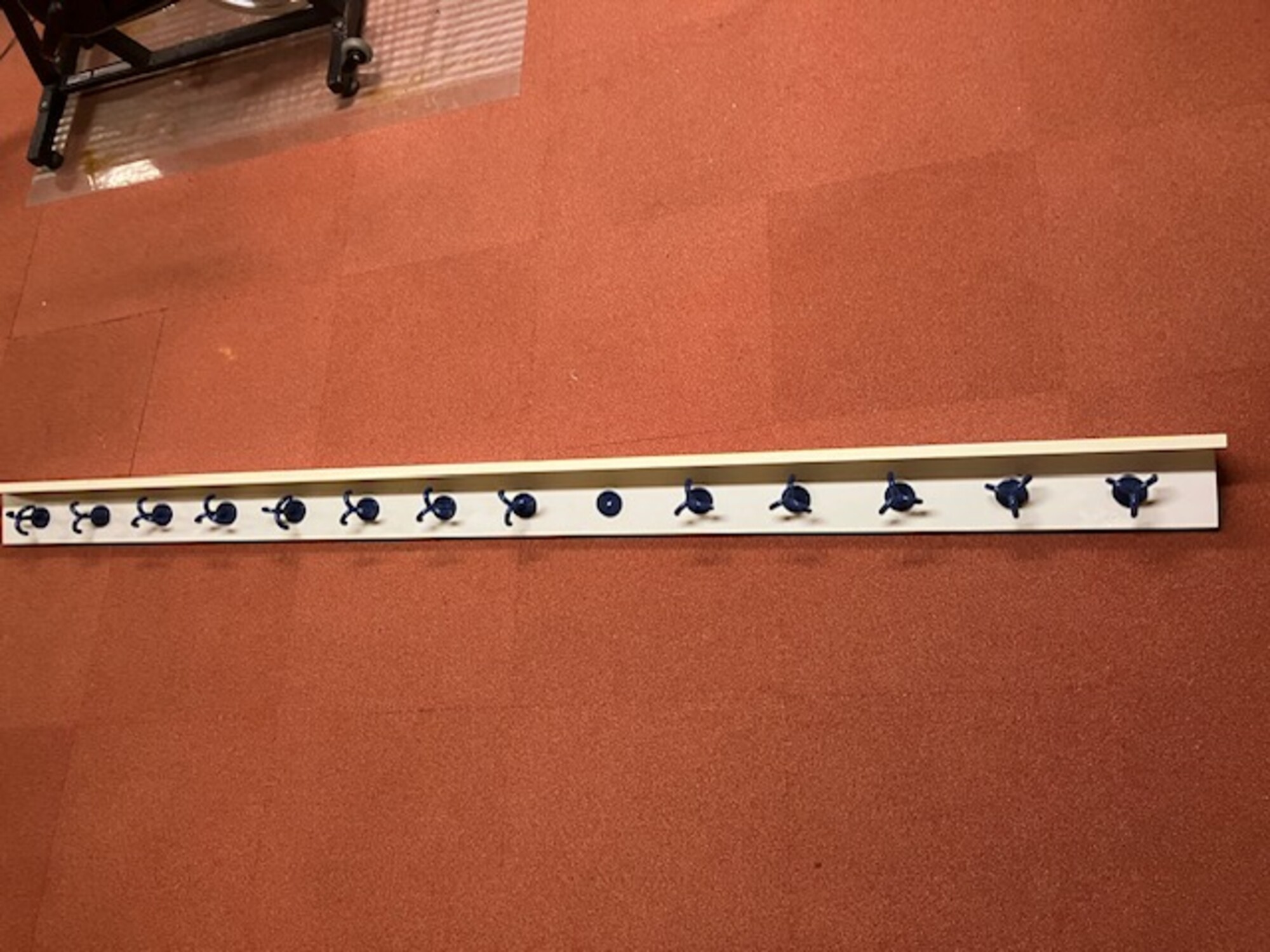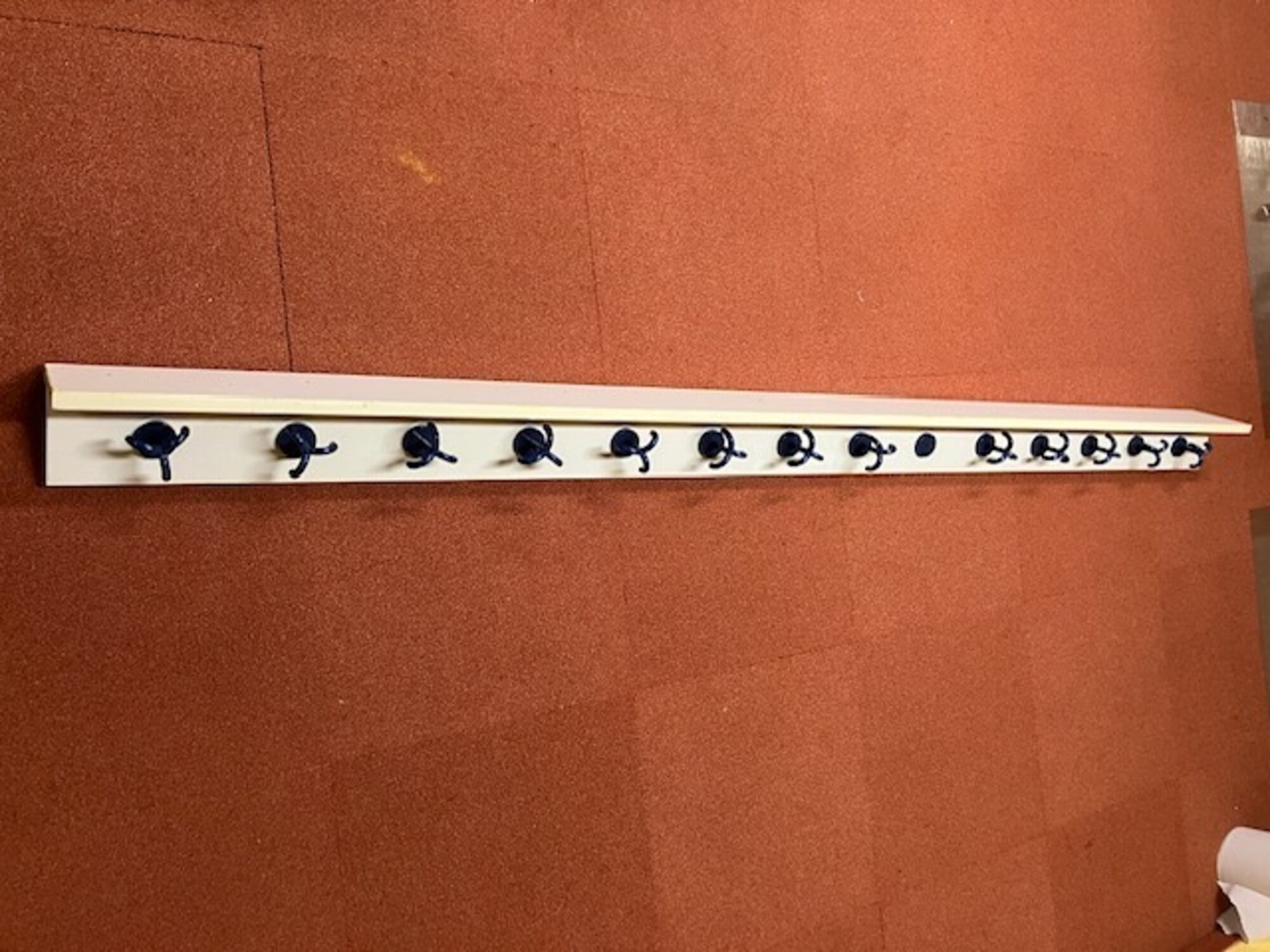 Garderobeleiste aus Holz mit 13 Haken. Länge ca. 2,20 m