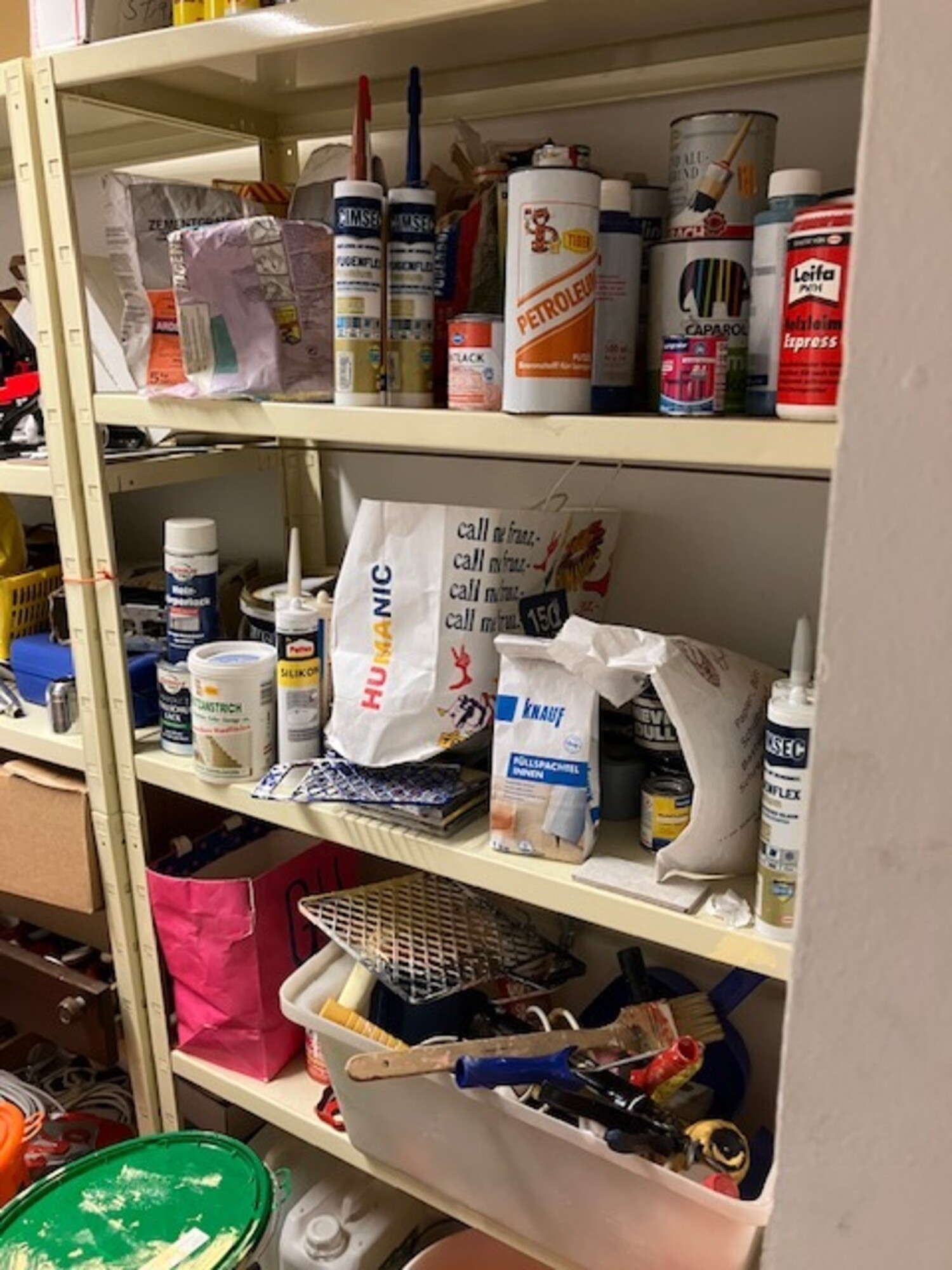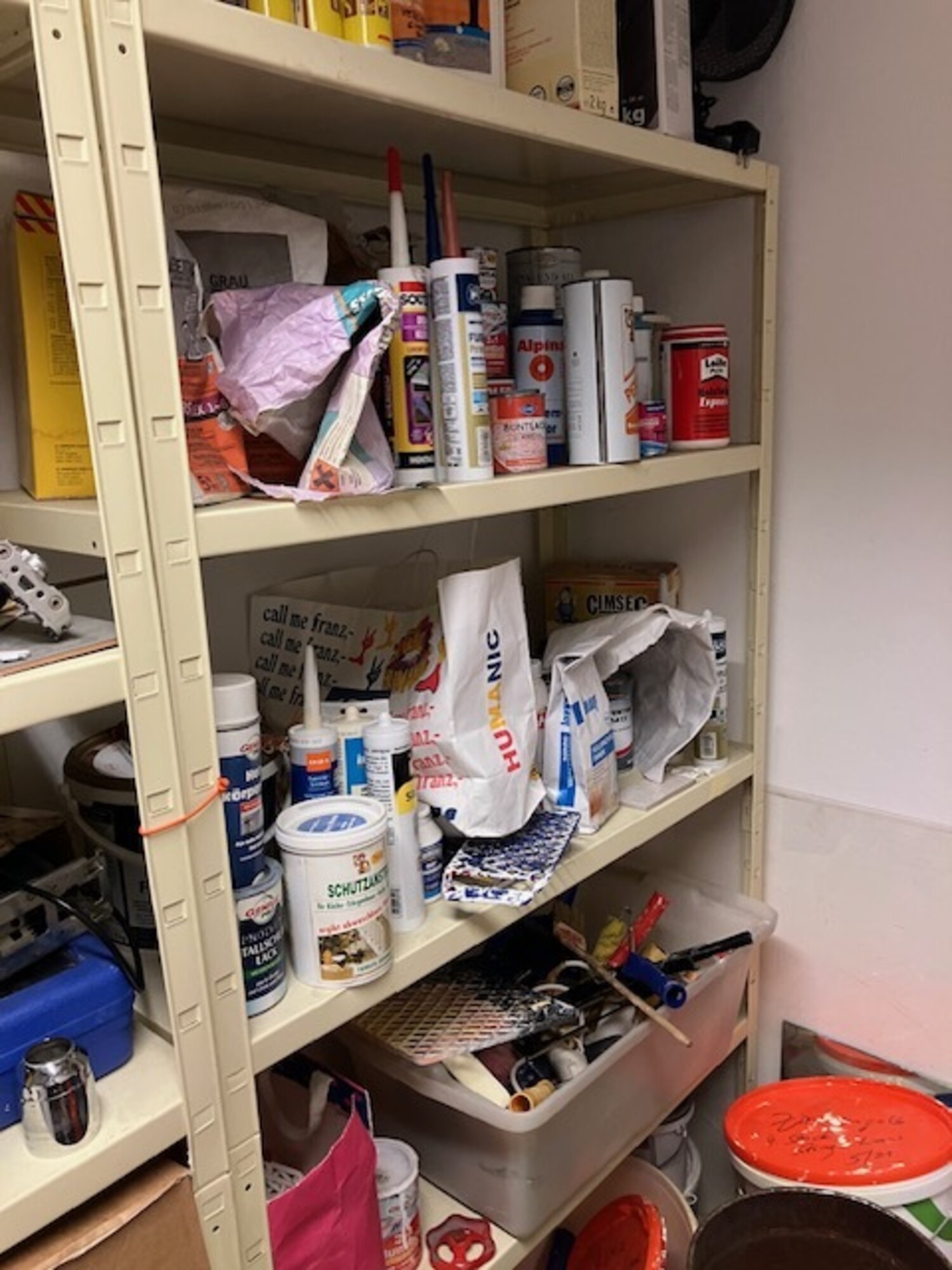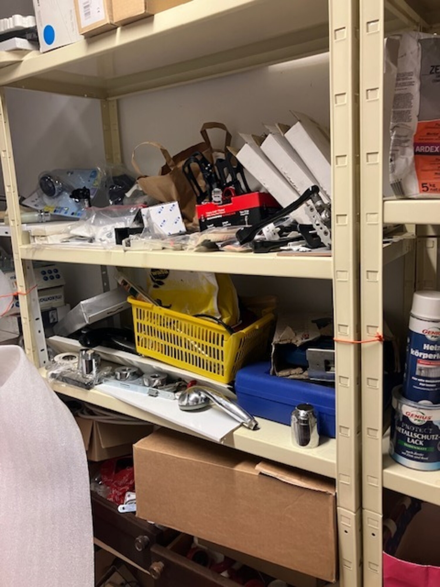 3 Regalzonen mit Ersatzteilen, diverse Elektrik, Sanitär, Farben, Türgriffe