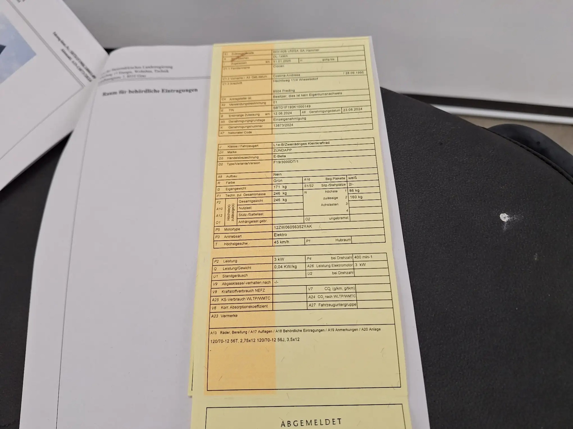 E-Bella, Eigengewicht 171 kg, 45 km/h, 3 kW, ohne Ladestecker, inklusive Einzelgenehmigung, 1 x Schlüssel