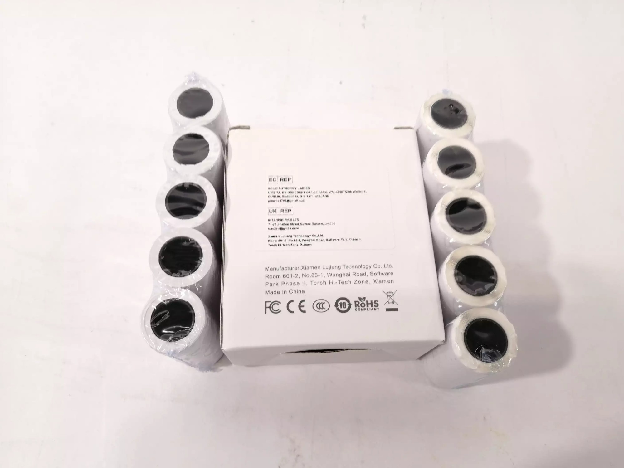 Mit Papierrollen und Etikettenrollen