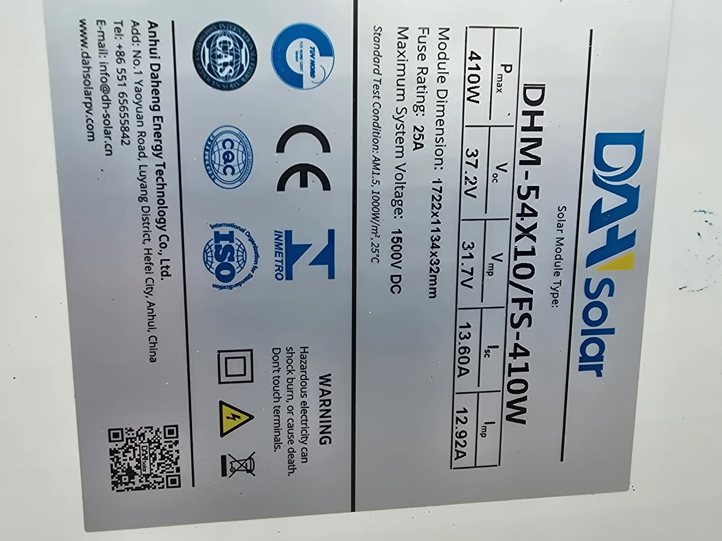 410 W, 37,2 V; Ab­mes­sun­gen (Lx­BxT): 127 x 113 x 32 cm, Max Volt 1500 V, ca. 24 Plat­ten