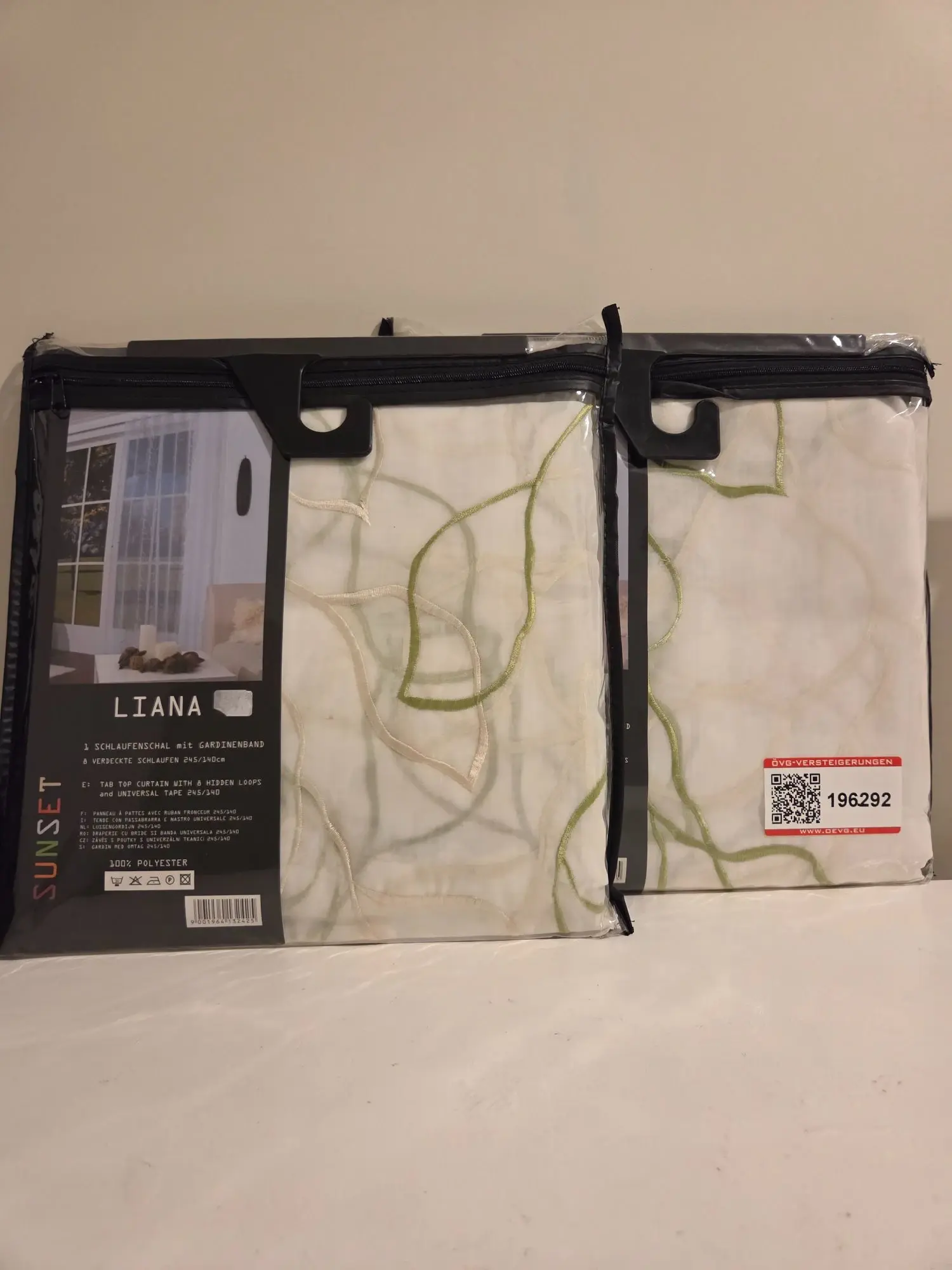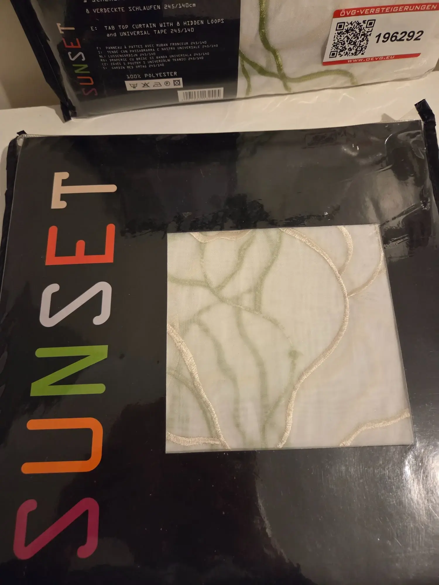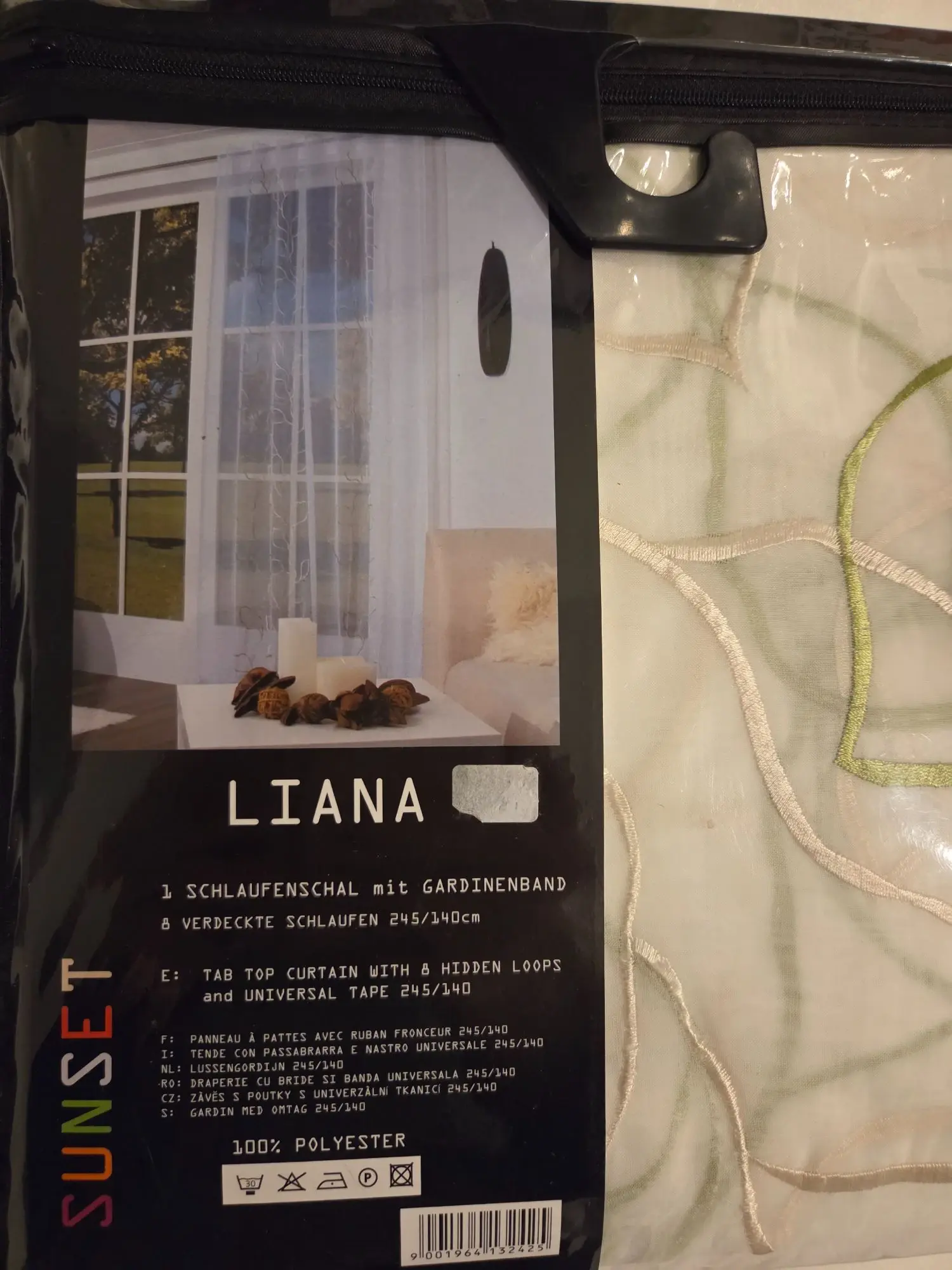 mit Gardinenband, 245x140 cm, weiße Gardine mit hellbeige/grünem Muster