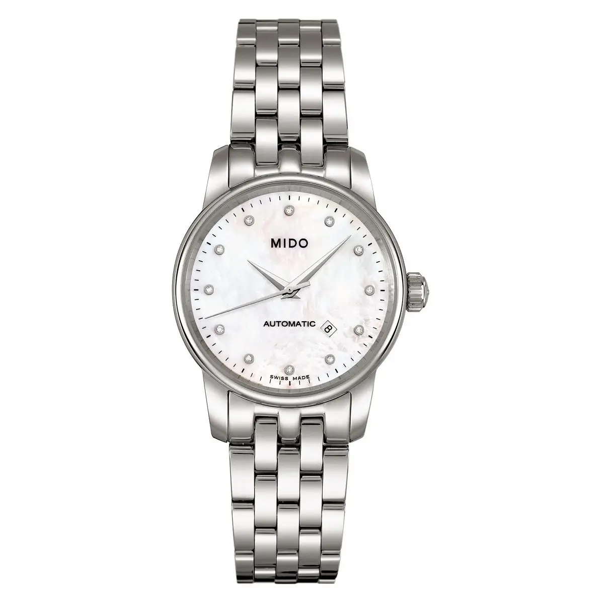 NEU OVP 2 Jahre Garantie UVP: 980€ Mido Baroncelli M7600.4.69.1 -Swiss Made- Funktion: Minuten, Stunden, Sekunden, Datum Uhrwerk: Damenarmbanduhr automatischer Aufzug Automatik ETA 2671 in Elaboré-Qualität Incabloc-Stoßsicherung Nivaflex-Zugfeder, gebläute Schrauben 25 Lagersteine, 28.800 A/h Gangreserve mehr als 38 Stunden Gehäuse: Edelstahl 316L, 4-fach verschraubter Glassichtboden Durchmesser 29,0 mm Höhe 8,65 mm wasserdicht: 5 Bar / 50 Meter Zifferblatt: Perlmutt, hell vollständige Minuterie 12 aufgesetzte Indizes mit Diamant, zus. 0,03 ct Zeiger: silberfarben, poliert Glas: beidseitig entspiegeltes Saphirglas Krone: Edelstahl, Logogravur Armband: Edelstahl, fünfreihig Doppelfaltschließe, Logogravur Gewicht: 77 Gramm