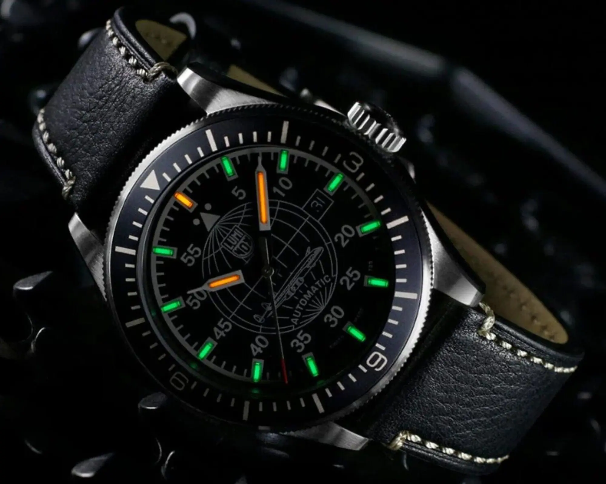 Luminox Constellation Automatic 9600 Series Die elegante Constellation Automatik mit schwarzem 42-mm-Zifferblatt und Saphirglas wird mit einem schwarzen Lederarmband mit Luminox-Schnalle geliefert und ist damit ein Zeitmesser für jeden Anlass. Beschreibung Luminox Air Automatic Constellation Pilotenuhr mit schwarzem Lederband. Die stromunabhängige Beleuchtung zeigt die Zeit auf einen Blick, unabhängig von den Lichtverhältnissen, ohne Aufladung durch das Tageslicht, ohne Knopfdruck. Swiss Made Automatikuhr (Sellita SW 200-1), Edelstahlgehäuse, Durchmesser ca. 42 mm, Höhe ca. 14 mm, verschraubter Gehäuseboden, verschraubte Krone mit Doppeldichtung und Kronenschutz, zweiseitig rotierende Lünette mit schwarzer Skala, schwarzes Zifferblatt mit Datumsanzeige, weiße Ziffern, Saphirglas mit Antireflexbeschichtung, schwarzes Lederarmband mit Dornschließe, Anstoßbreite: 22 mm, Gewicht ca. 105 g, wasserdicht bis 10 bar. Luminox Die Einsatzuhr mit vielen Referenzen: Bear Grylls, U.S. Navy SEALs, Icelandic Association for Search and Rescue, Sea Wolves Unlimited and Undersea Voyager Project, Lockheed Martin, Heliswiss, U.S. Air Force F-117 Nighthawk Stealth Jet Pilots, Federal Bureau of Investigation (FBI), U.S. Coast Guard, U.S. Secret Service, U.S. Border Patrol, U.S. Marshals...