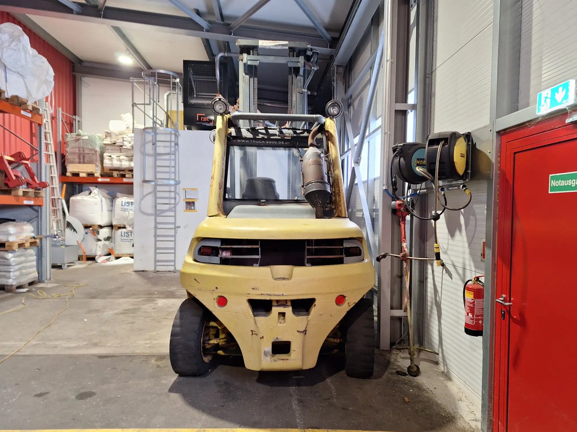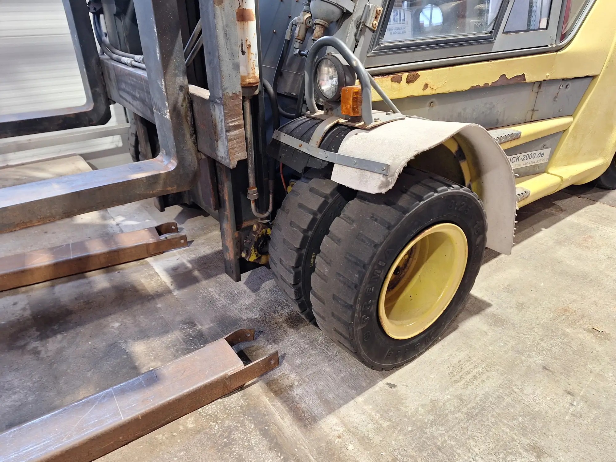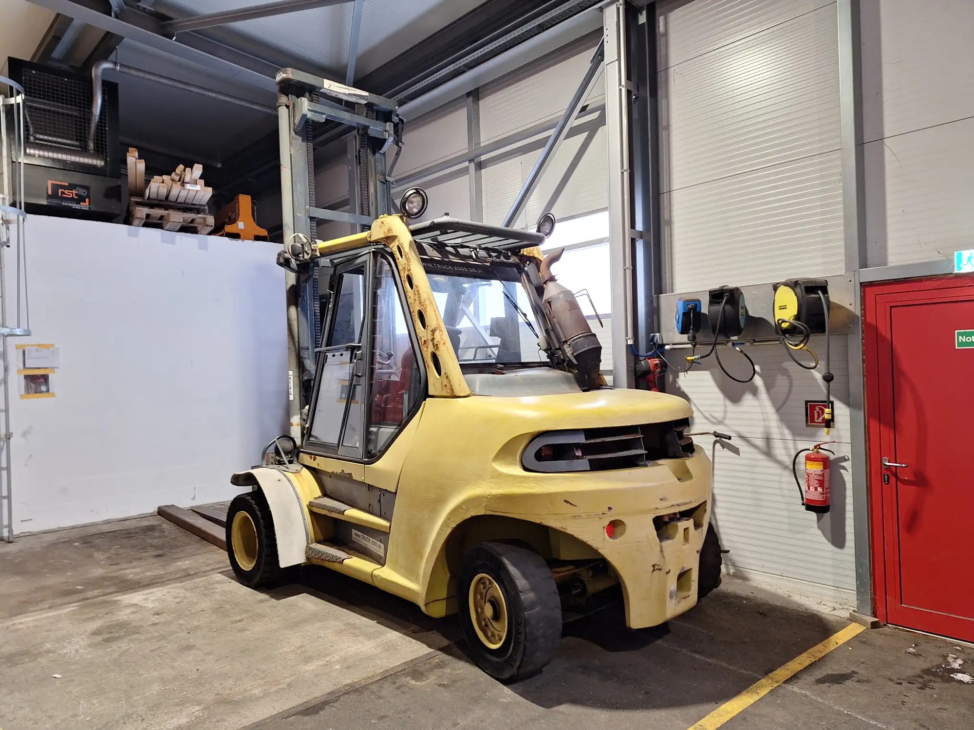 H80D, 900-2,Diesel,SN:E1X353N00913, Tragkraft 8000 kg, Eigengewicht 14080 kg hydraulischer Seitenverschub Duplexmast, Hubhöhe ca 8000 mm inklusive Gabelverlängerungen hubmast ca 4170 mm, Gabellänge 200 cm, Gabel Verlängerung 250 cm