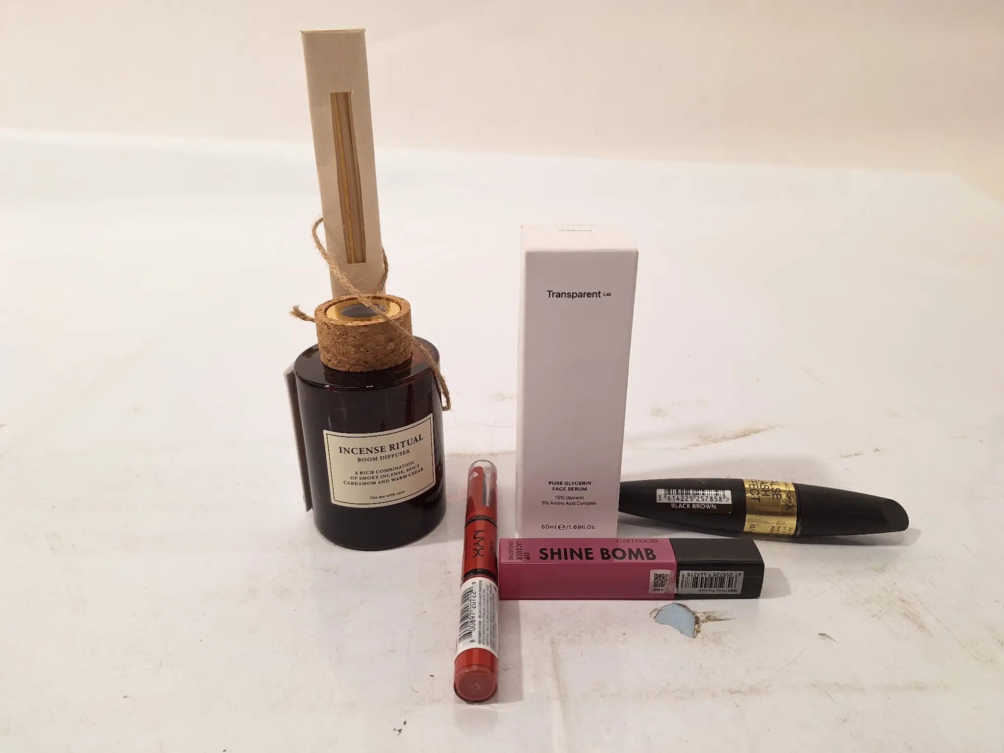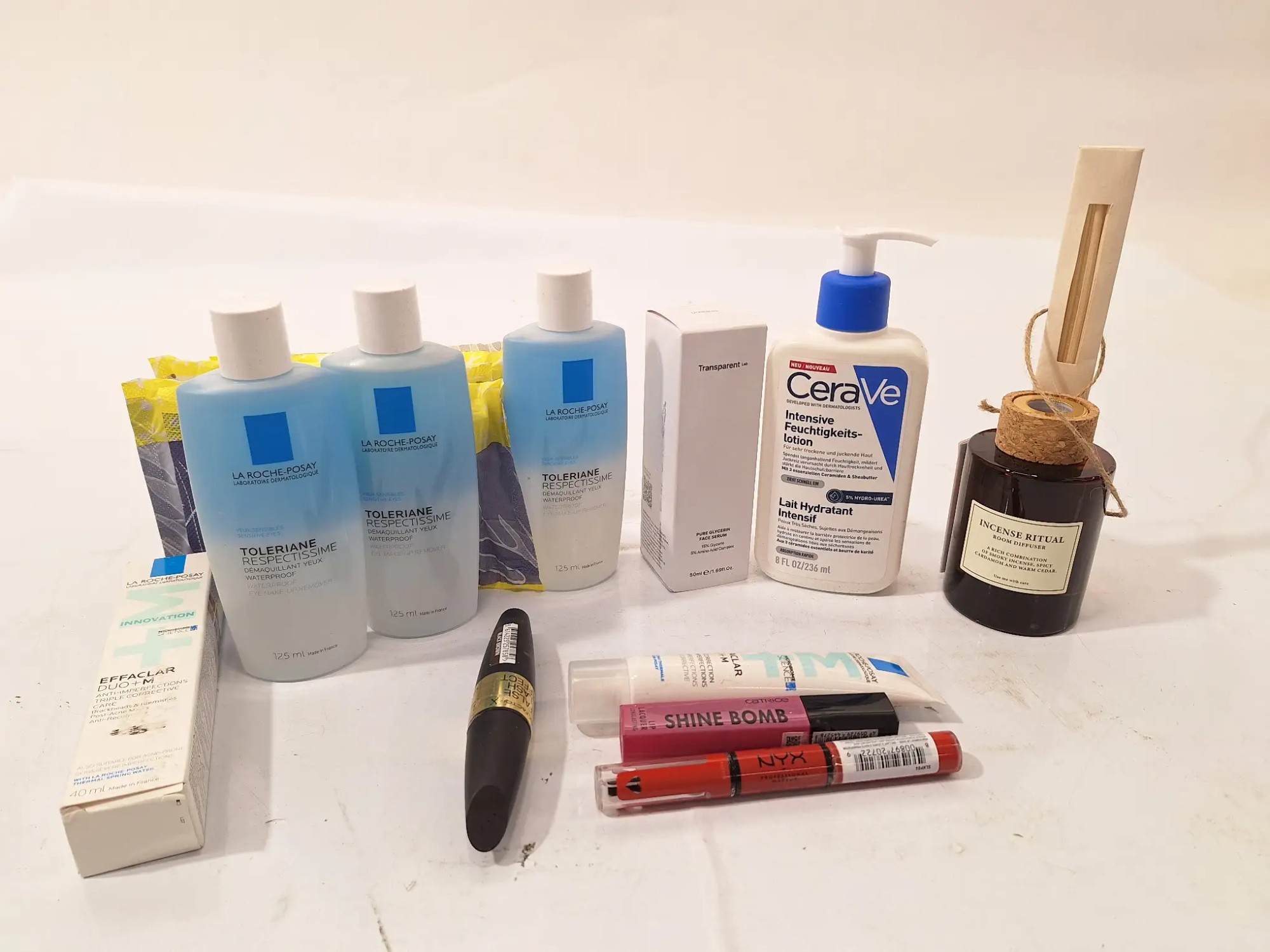 3x 125 ml Abschminkmittel, 1x 236 ml Feuchtigkeitslotion, 2x 40 ml Gesichtscreme, 1x 50 ml Gesichtsserum, Makeup, Raumduft