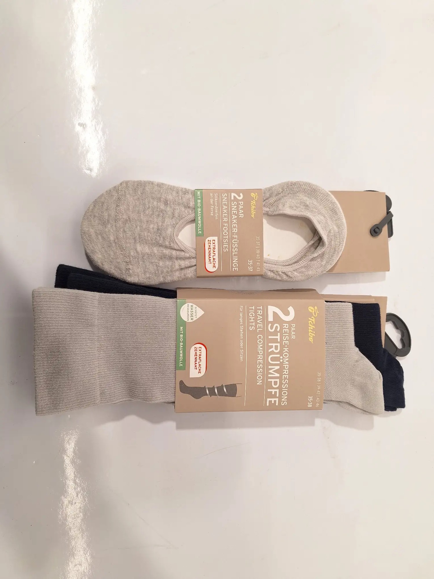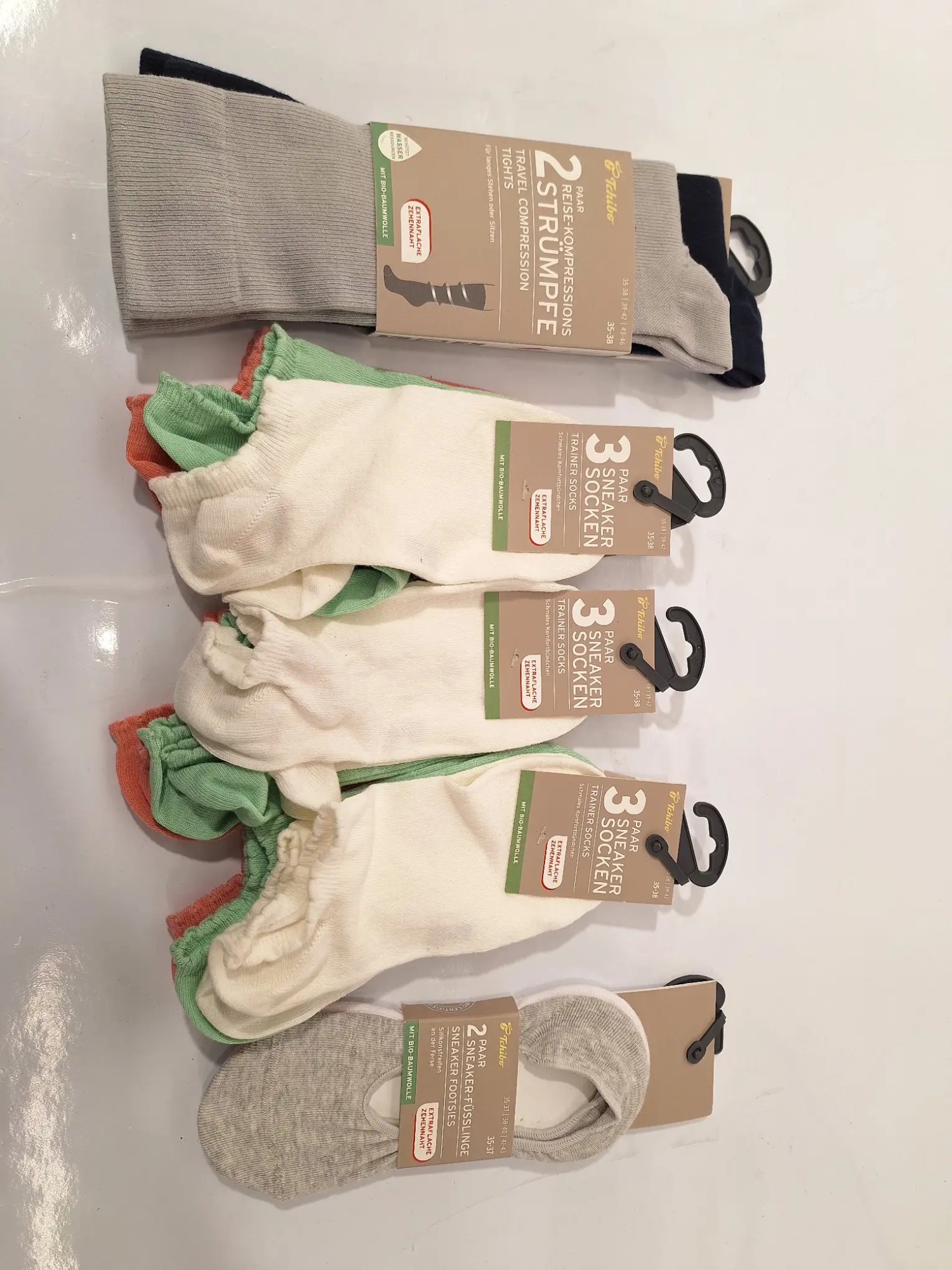 1x 2 Paar Rei­se-Kom­pres­si­ons­strümp­fe Grö­ße 35-38 3x 3 Paar Snea­ker So­cken Grö­ße 35-38 1x 2 Paar Snea­ker Fü­ß­lin­ge Grö­ße 35-37