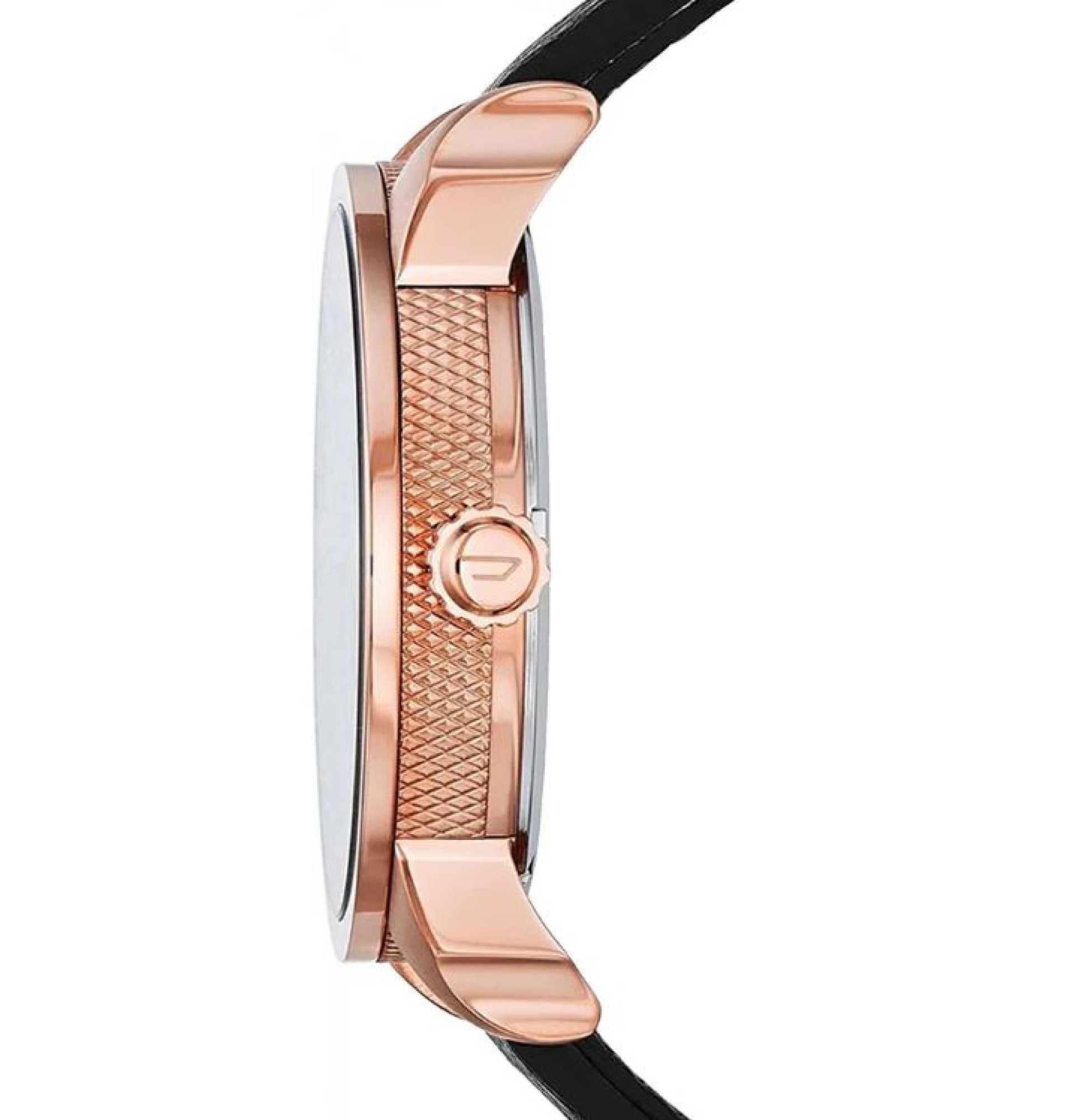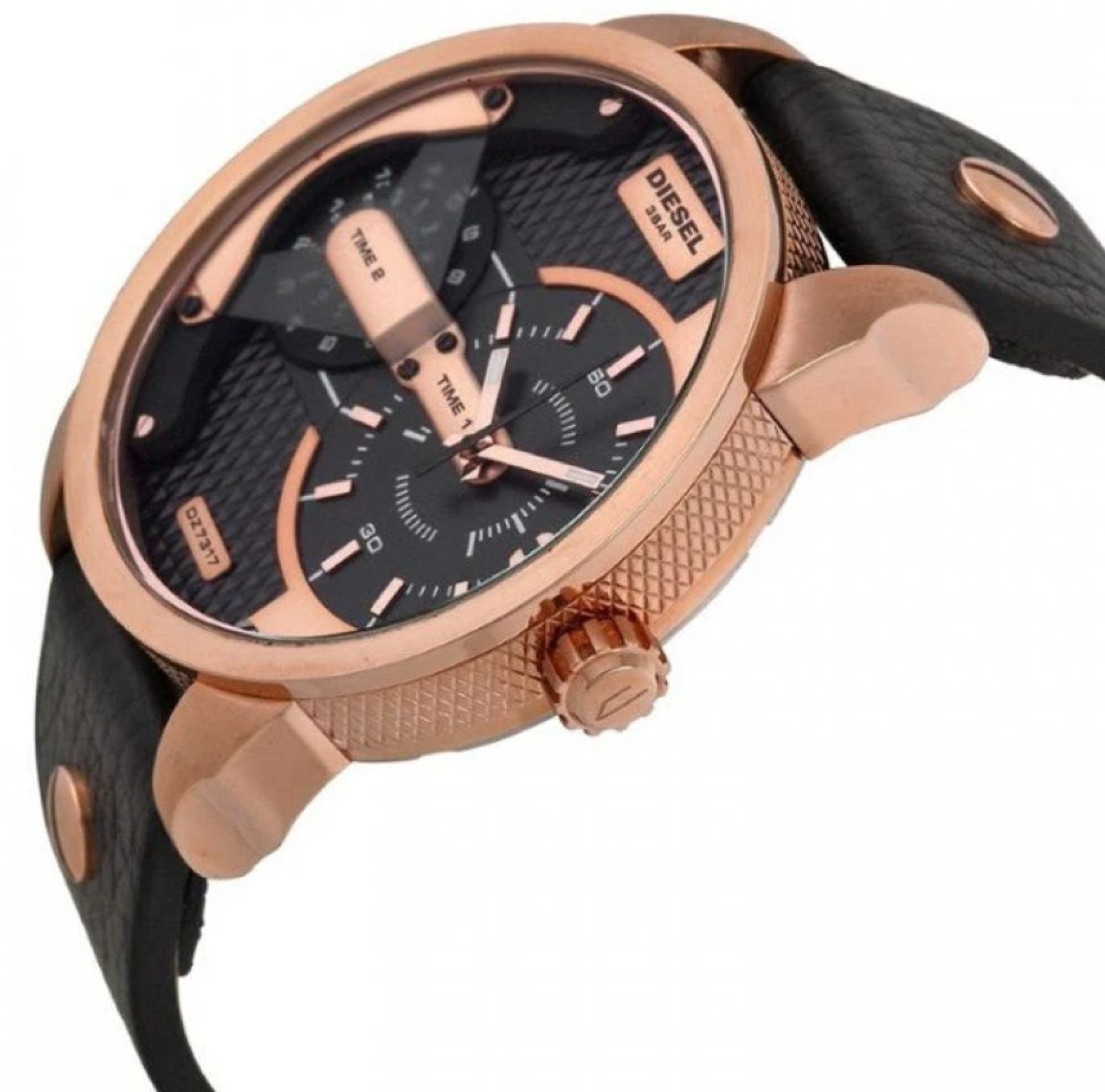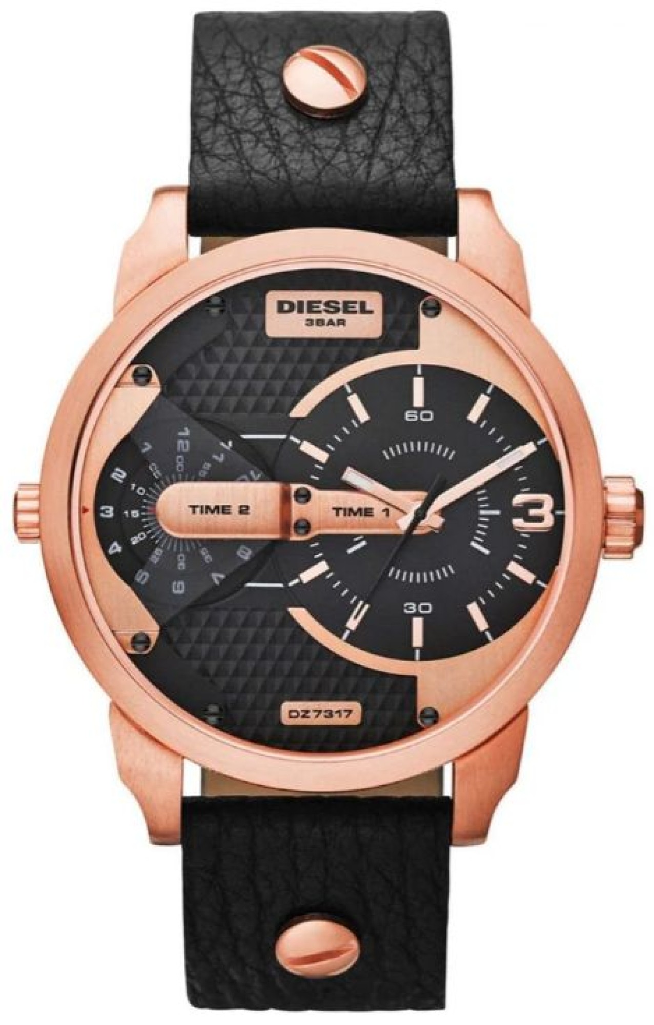 NEU OVP DZ7317 DIESEL MINI DADDY Lässige präzise Uhr mit Quarzuhrwerk Zifferblatt mehrteilig angeordnet mit unterlegter gekachelter schwarzer Fläche, zweite Farbe ist rosé und zieht sich quer über das Ziffernblatt verteilt Zwei Uhrwerke pochen im Herz des ionenplatierten roséfarbenen Gehäuses und ermöglichen das Einstellen von zwei unterschiedlichen Zeiten, welche über zwei griffige Kronen am Gehäuse einzustellen sind Der schwarz - rosé Kontrast überzeugt auch im hochwertigen Lederarmband, welches mit Zierschrauben ausgestattet ist und von einer Dornschließe geschlossen wird Wasserdicht bis zu einem Druck von 3 bar (30 Meter) Durchmesser 46mm.
