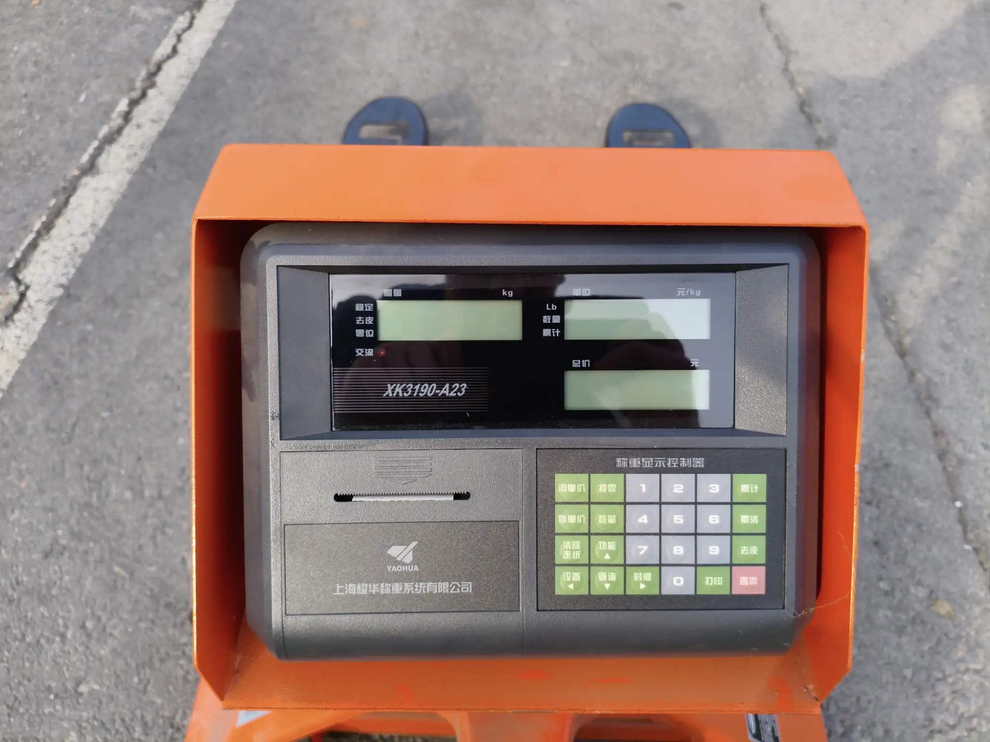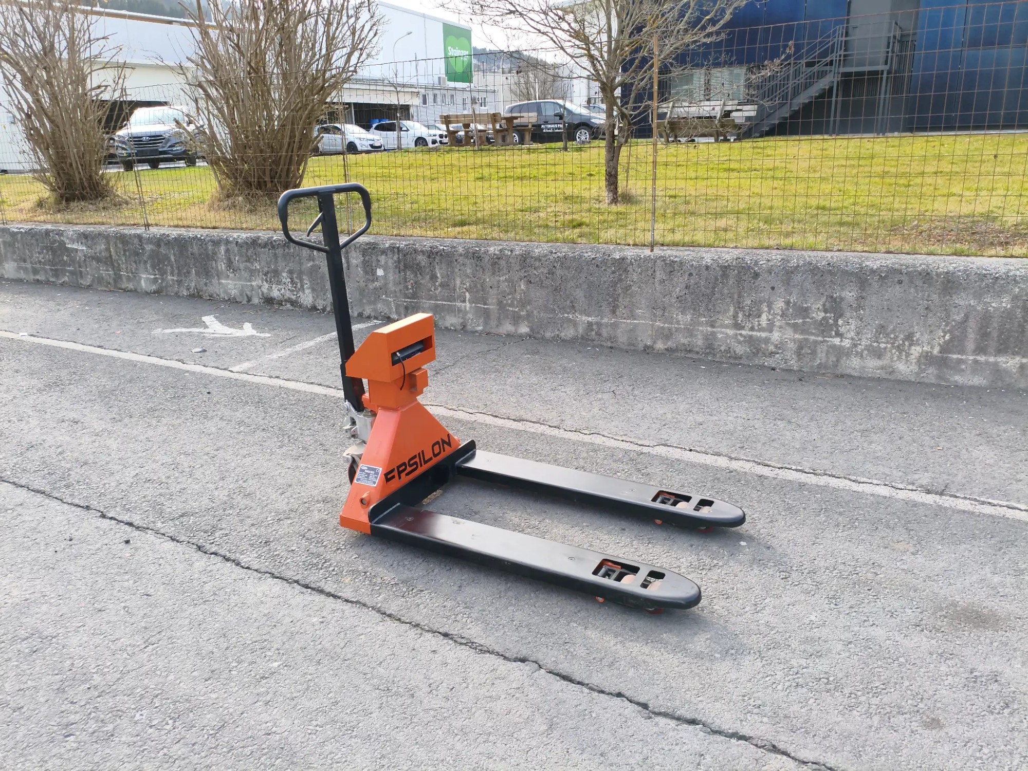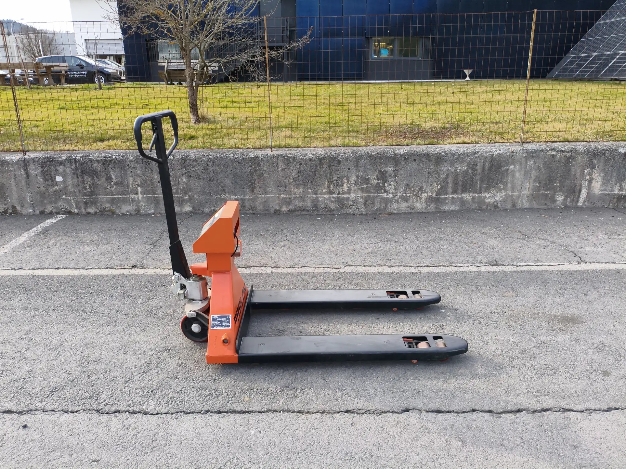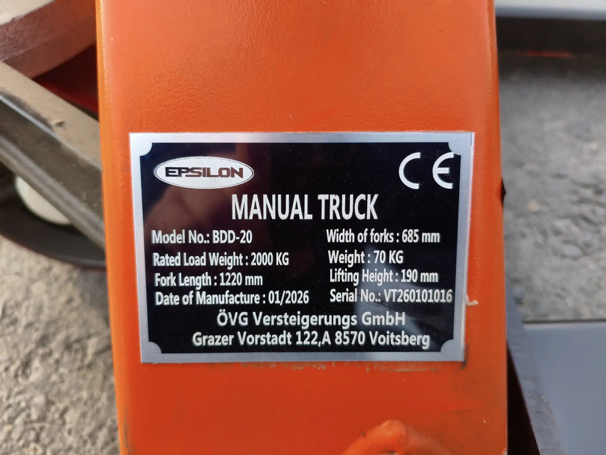mit Waa­ge, Mo­dell: BDD-20, max. La­de­ge­wicht: 2000 kg, Ga­bel­län­ge: 1220 mm, Ga­bel­ab­stand: 685 mm, max. Hub­hö­he: 190 mm, Ei­gen­ge­wicht: 70 kg
