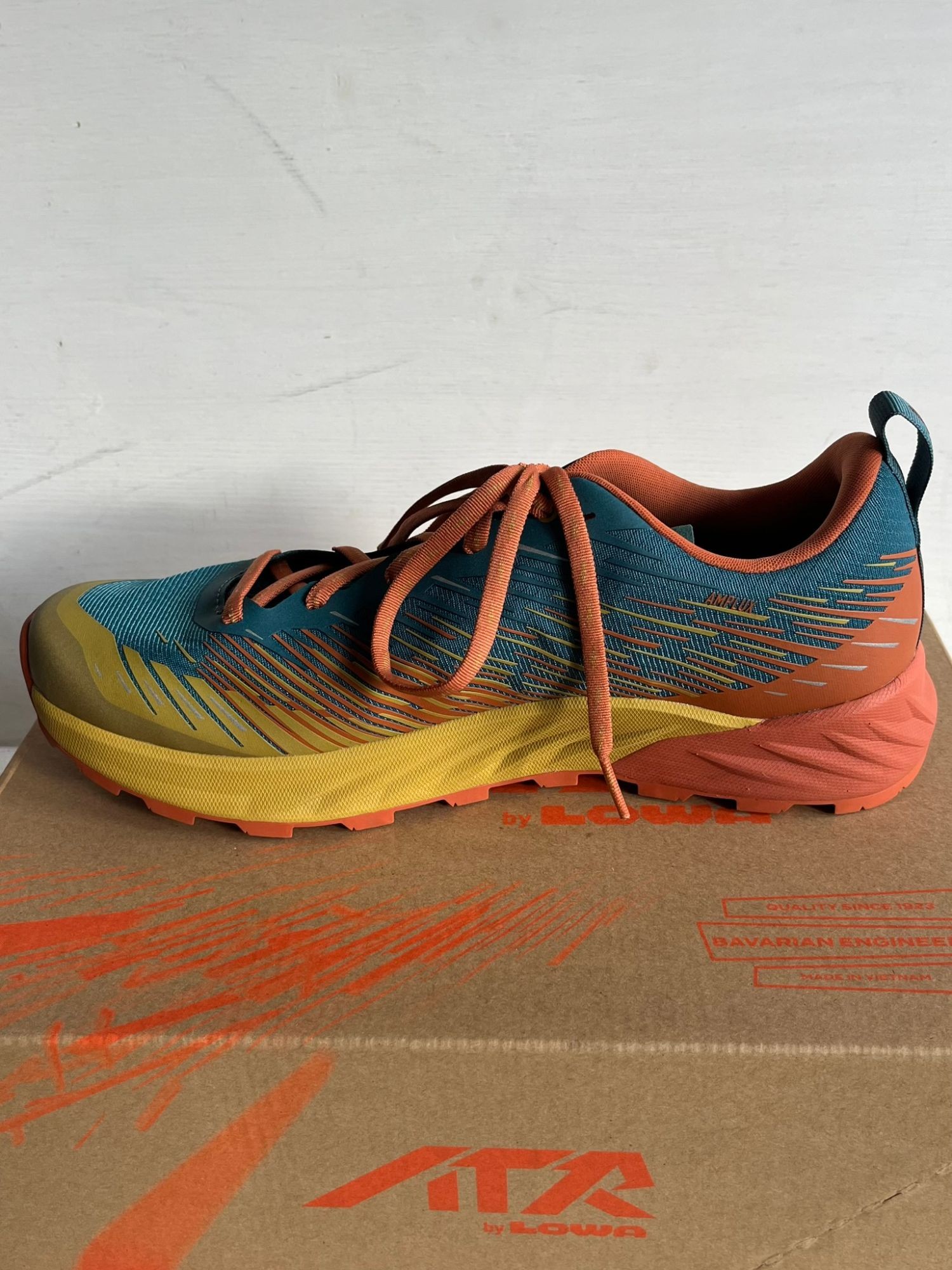 Neuware in OVP 310965-4474 UVP: 180 € LOWA Amplux. Der LOWA Amplux ist ein leichter Trailrunningschuh, der speziell für anspruchsvolle Einsätze auf verschiedensten Untergründen wie steinigen Trails, schmalen Graten und nassen Wiesen entwickelt wurde. Mit einem Gewicht von nur circa 560 Gramm pro Paar und einer 6-mm-Sprengung bietet er sowohl auf kurzen als auch auf mittleren und langen Distanzen hohen Tragekomfort. Die flexible Schuhsteifigkeit unterstützt das natürliche Abrollverhalten des Fußes. Für maximalen Grip sorgt die robuste LOWA TRAC AGILITY-Außensohle mit bidirektional ausgerichteten Stollen, die schnellere Beschleunigung und kontrolliertes Bremsen ermöglichen. Das Obermaterial besteht zu 100 % aus synthetischem Material, das Innenfutter aus Textil, was für ein angenehmes Fußklima sorgt. Dank der ausgeklügelten Sohlenkonstruktion eignet sich der Schuh sowohl für das Cross-Country-Training als auch für Wettkämpfe. Die normale Leistenweite sorgt für eine gute Passform. Insgesamt verbindet der LOWA Amplux hohe Funktionalität und Komfort für Trailrunner, die in verschiedenstem Gelände zuverlässige Performance suchen. Merkmale: leichter Trailrunningschuh, 6-mm-Sprengung, bidirektionale Stollen, synthetisches Obermaterial, flexible Schuhsteifigkeit. Vorteile: maximaler Tragekomfort, hervorragender Grip für kurze bis lange Distanzen, unterstützt natürliches Abrollen, robuste Sohlenkonstruktion.