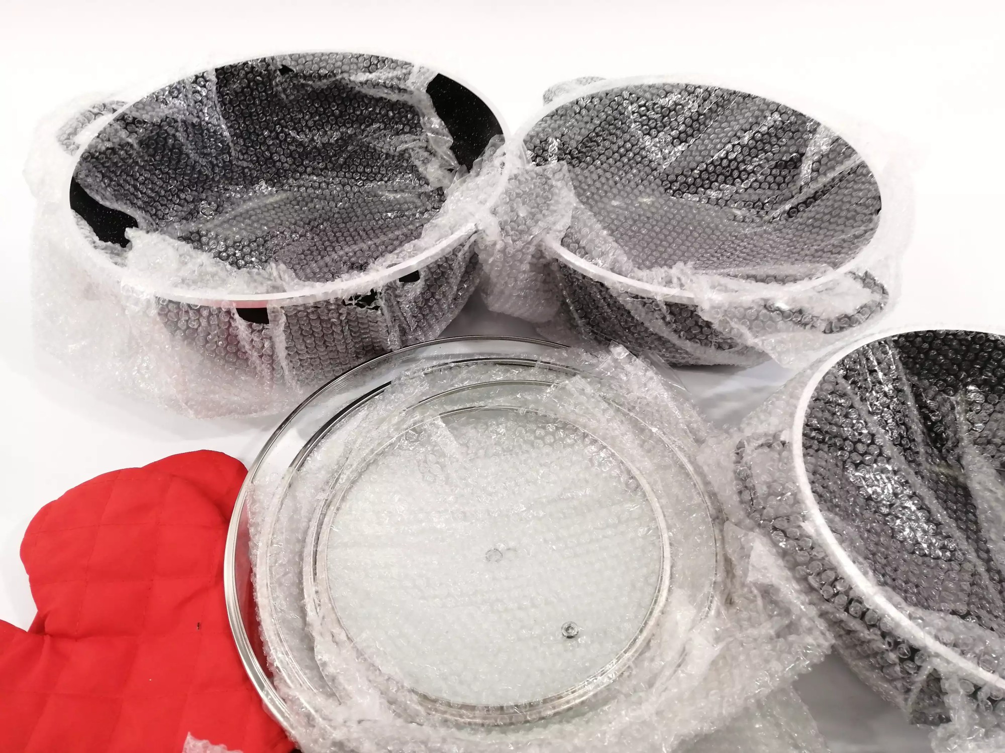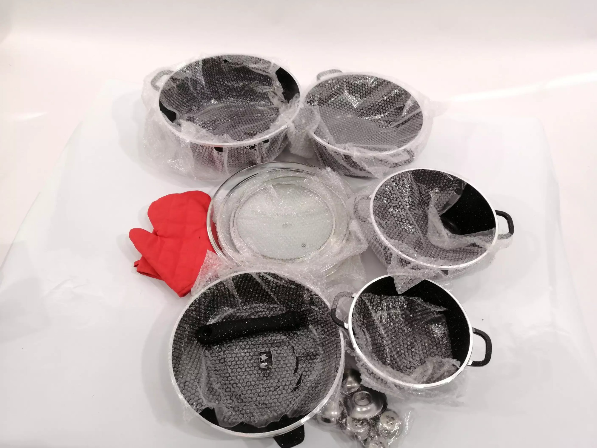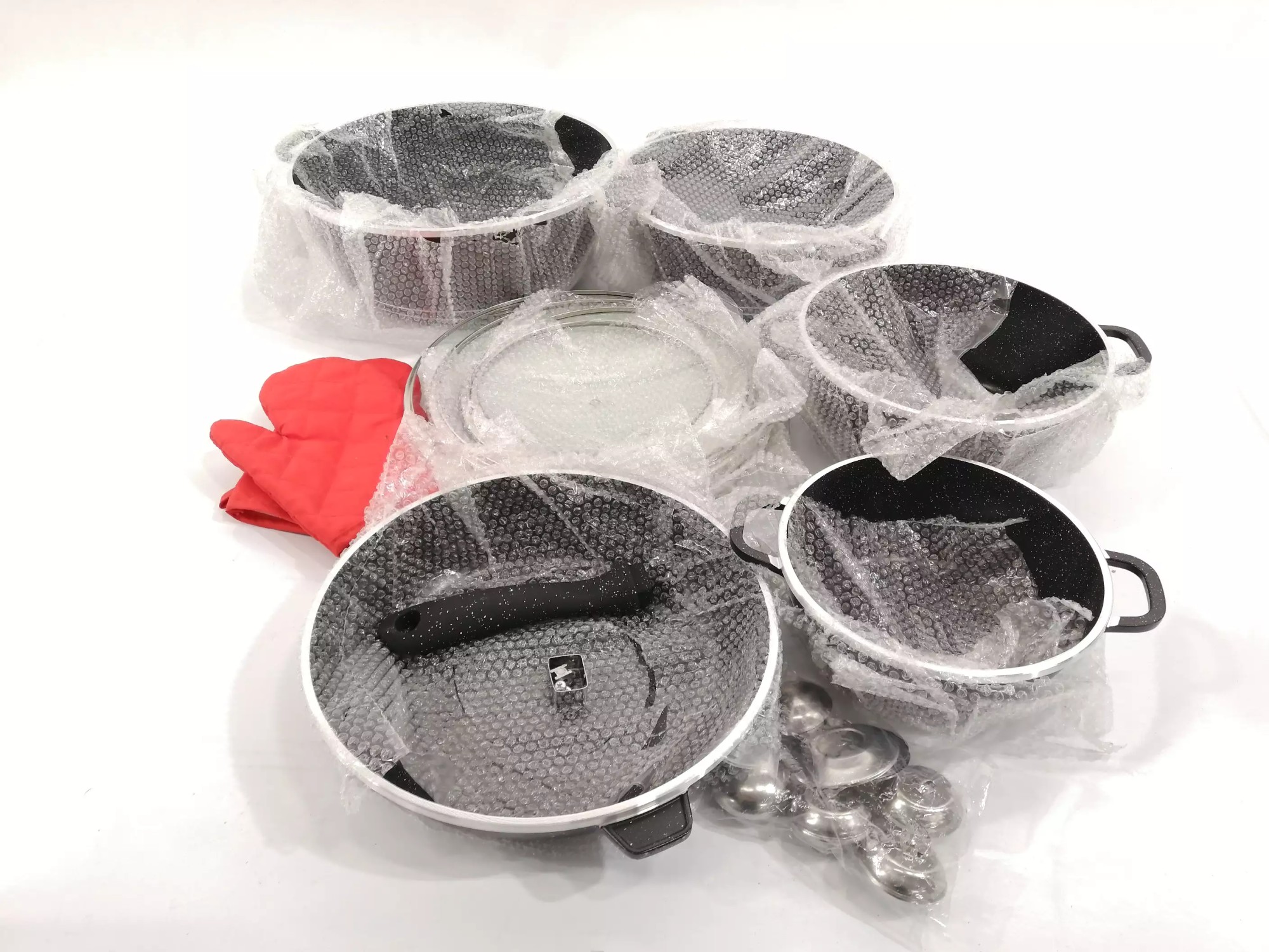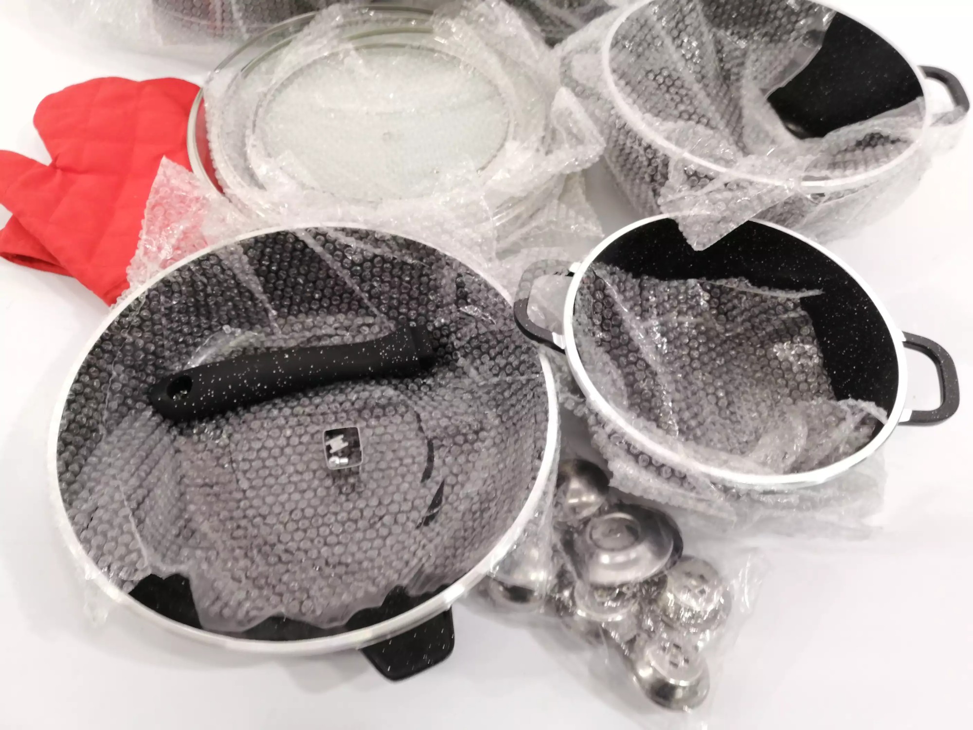 Durchmesser Töpfe 20 cm, 24 cm, 28 cm, 32 cm, eine tiefe Bratpfanne, Durchmesser 28 cm