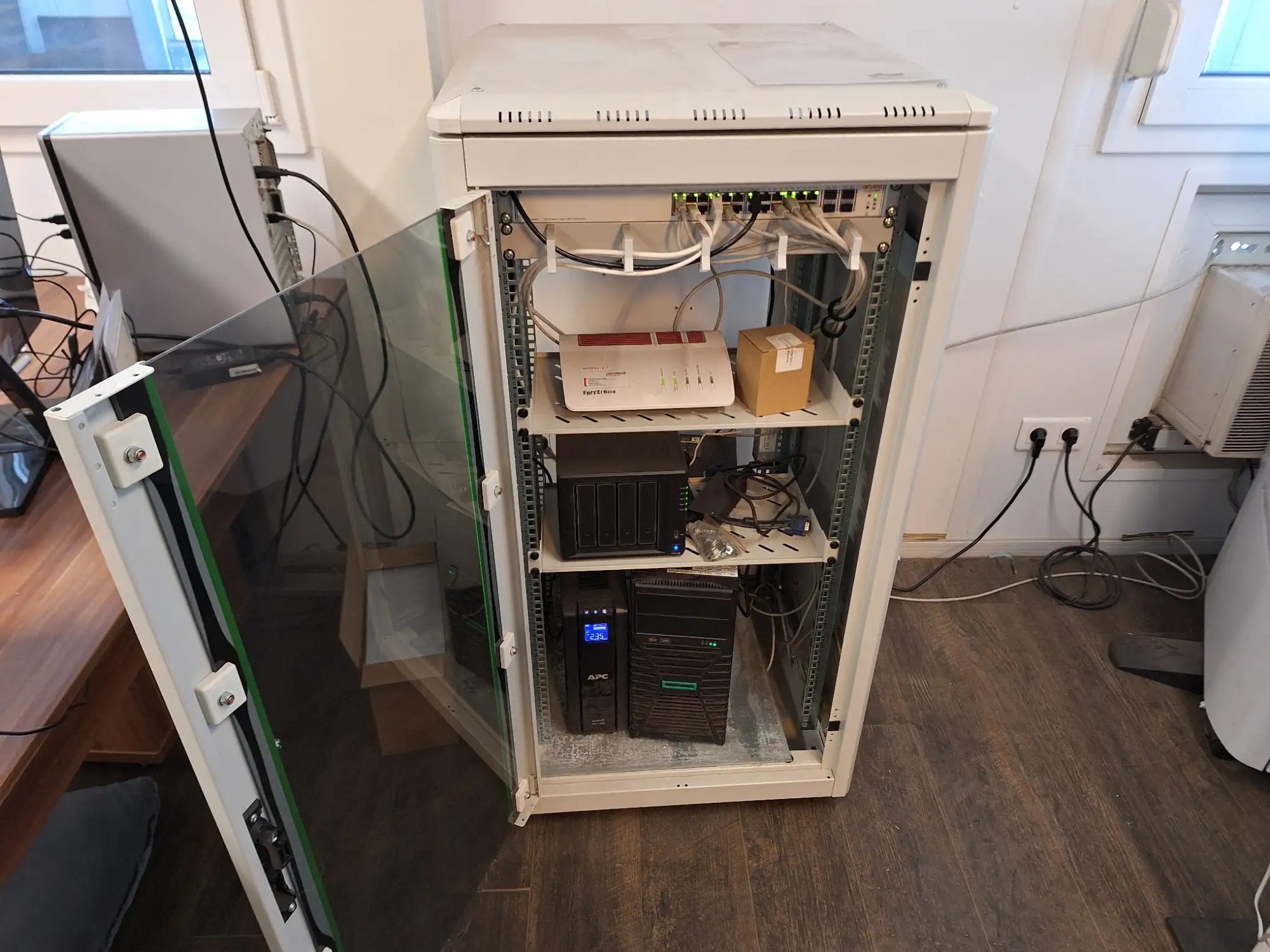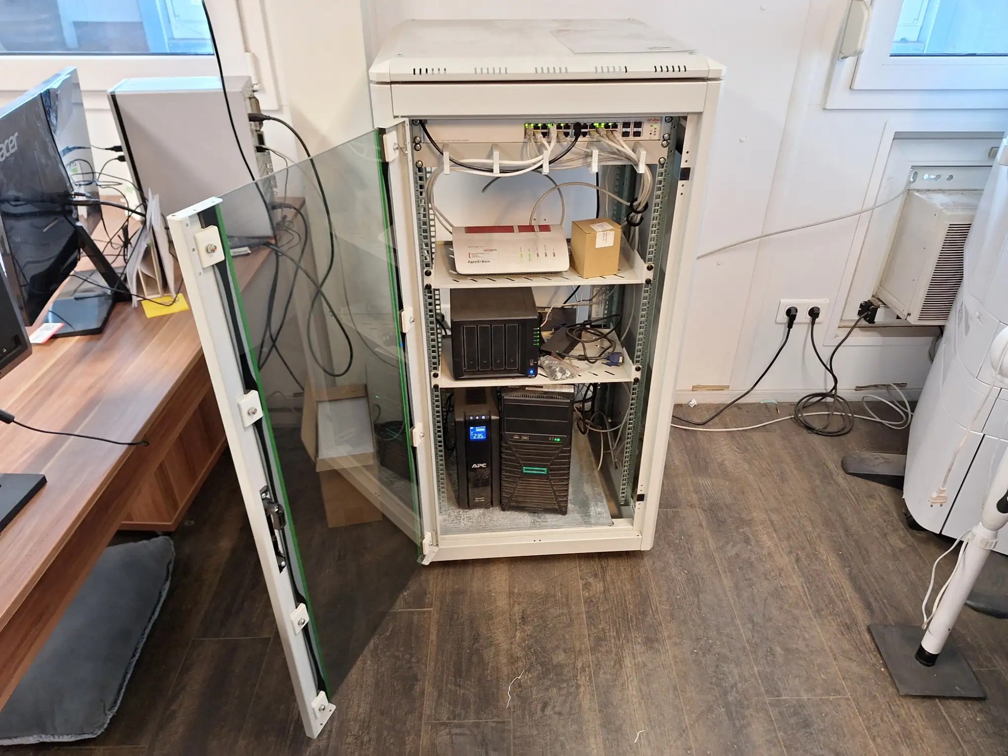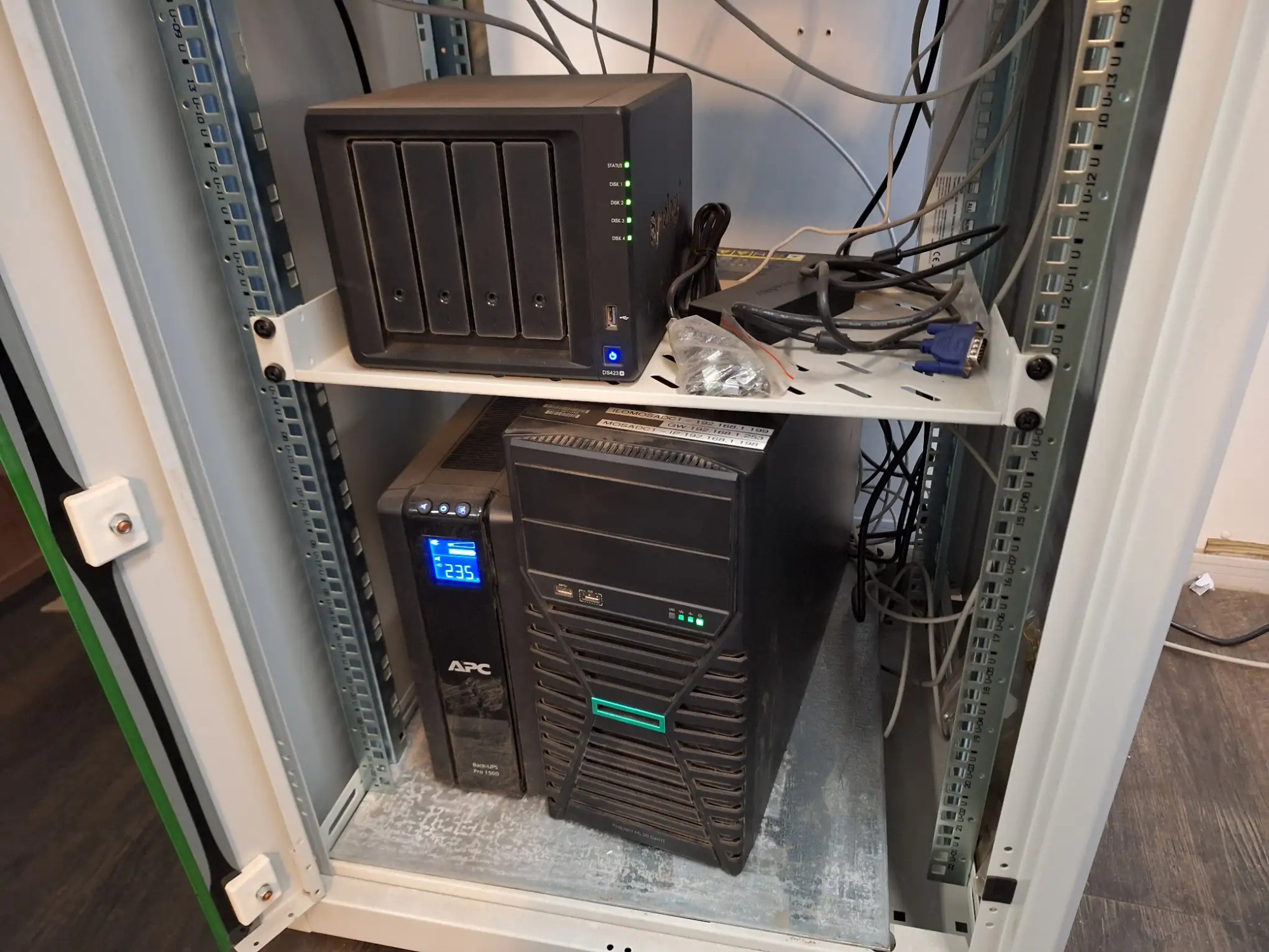 Abmessungen (BxHxT): 60x120x60 [cm] bestehend aus Netzwerkschrank mit Server PC HPE, USV Anlage, APC Smart UPS pro 1500 NAS Synology DS 423, ohne Festplatte