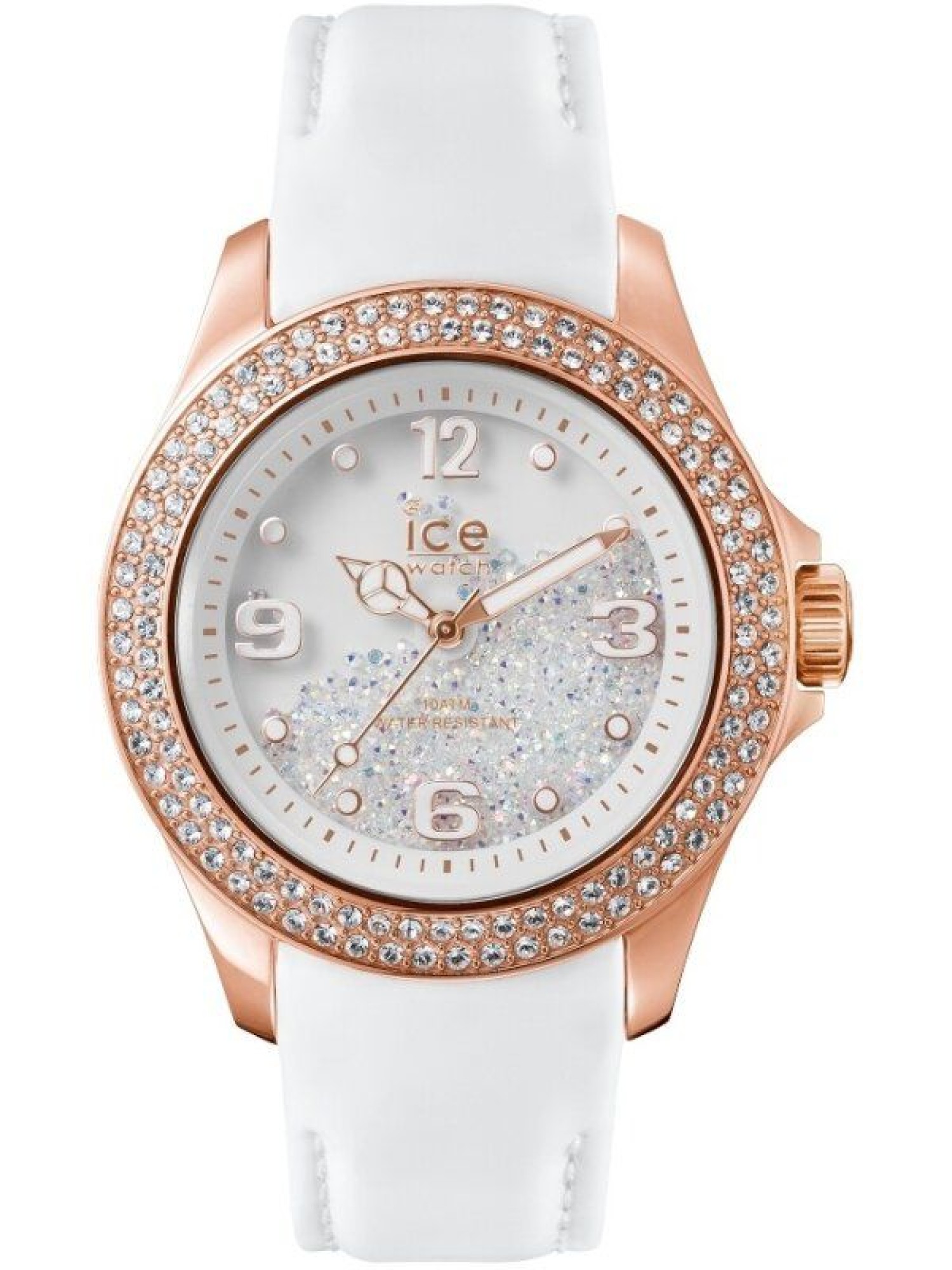 CY.RGW.U.L.14 Neu OVP, Batterie leer. Ice-Watch Ice-Crystal Rose White Werk: Präzises Quarzwerk Miyota 203A Funktionen: Anzeige von Stunde, Minute und Sekunde Zifferblatt: Weißes Zifferblatt, roségoldfarbene Ziffern und Indexe, vollständige Minuterie, roségoldfarbene, polierte Stunden-, Minuten- und Sekundenzeiger, alle Zeiger mit weißer Leuchteinlage, Ice-Watch-Logo, frei bewegliche Swarovski-Kristalle Gehäuse: Hochwertiges rosévergoldetes Edelstahlgehäuse, kratzunempfindliches Mineralglas, griffige Krone mit Flankenschutz Wasserdicht: Geprüft bis 100 Meter / 10 ATM Armband: Weiß glänzendes Lederband mit Dornschließe Durchmesser: 43 mm