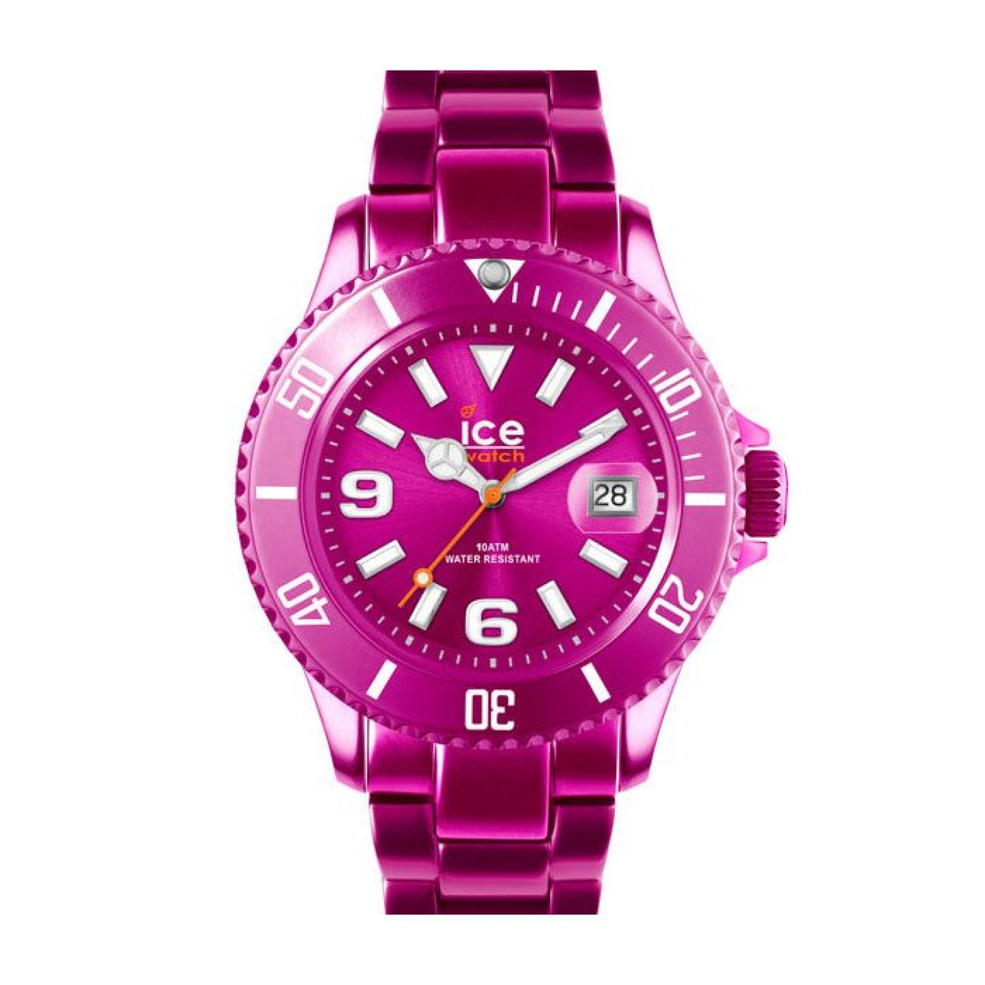 AL.PK.U.A.12 NEU OVP Batterie leer. Ice-Watch steht für knallige Farben, passend zur aktuellen Modekollektion. Sie sind bekannt aus Film und Fernsehen. Die Ice-Alu Pink, in der Größe Unisex, ist, wie der Name schon sagt, komplett aus lilafarbenem Aluminium gefertigt. Auf dem klaren, farbigen Zifferblatt sind die weißen Zahlen silbern umrandet, und zusätzlich ist ein weißes Balkenindex darum. Die filigranen Zeiger sind ebenfalls silbern und nachleuchtend. Nur der Sekundenzeiger ist farbig hervorgehoben in Orange. Das Ice-Logo ist auf dem Zifferblatt sowie auf der Krone und dem verschraubten Gehäuseboden geprägt. Ebenfalls weiße Markierungen zieren die Lünette; sie hat ein Datumsfenster auf 3 Uhr, und das leichte Aluminiumgliederarmband wird mit einer Faltschließe geschlossen. Sie ist wasserdicht und mit einem Miyota 2035 Quarzuhrwerk ausgestattet. Jede Ice-Watch ist in einer farbig passenden Würfelbox verpackt, die auch als Spardose verwendet werden kann, und sie können wie Bausteine übereinander gestapelt werden.