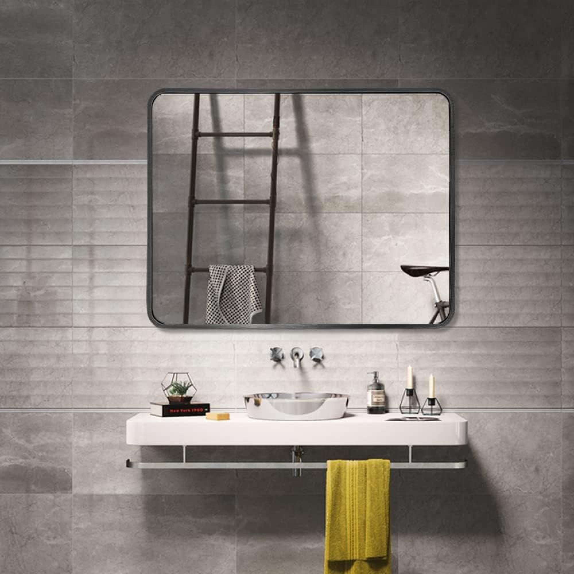 Neu OVP Der Spiegel kann nur einzeln versendet werden. Dieser Spiegel macht nicht nur im Badezimmer eine gute Figur! Badezimmerspiegel für die Wand, 55,9 x 71,1 cm, rechteckiger Aluminium-Metallrahmen mit runden Ecken, Wandmontage mit Glasscheibe, Schminktisch zur Dekoration, vertikal/horizontal aufgehängt. Einfach zu installieren: Die meisten schwarzen rechteckigen Spiegel oder schwarzen Rahmenspiegel haben kleine Haken, die präzise Löcher erfordern. Keine einfache Aufgabe. Unsere mattschwarzen Spiegel werden mit Ultra-Premium-Halterungen geliefert, die viel Platz für die Anpassung ermöglichen. Montage von zwei Personen empfohlen. Premium-Design: Unsere Spiegel verwenden Premium-Metallrahmen, handglasiertes Glas, benutzerdefinierte Nähte und hochwertige stabile Halterungen, die ein Leben lang halten. Alles ist im Lieferumfang enthalten: Alle erforderlichen schwarzen, matten Spiegel-Wand-Aufhängungen sind im Lieferumfang enthalten. Jeder Spiegel ist in Spezialkarton und Luftpolsterfolie verpackt. Andere auf den Fotos ersichtliche Gegenstände werden nicht verkauft.