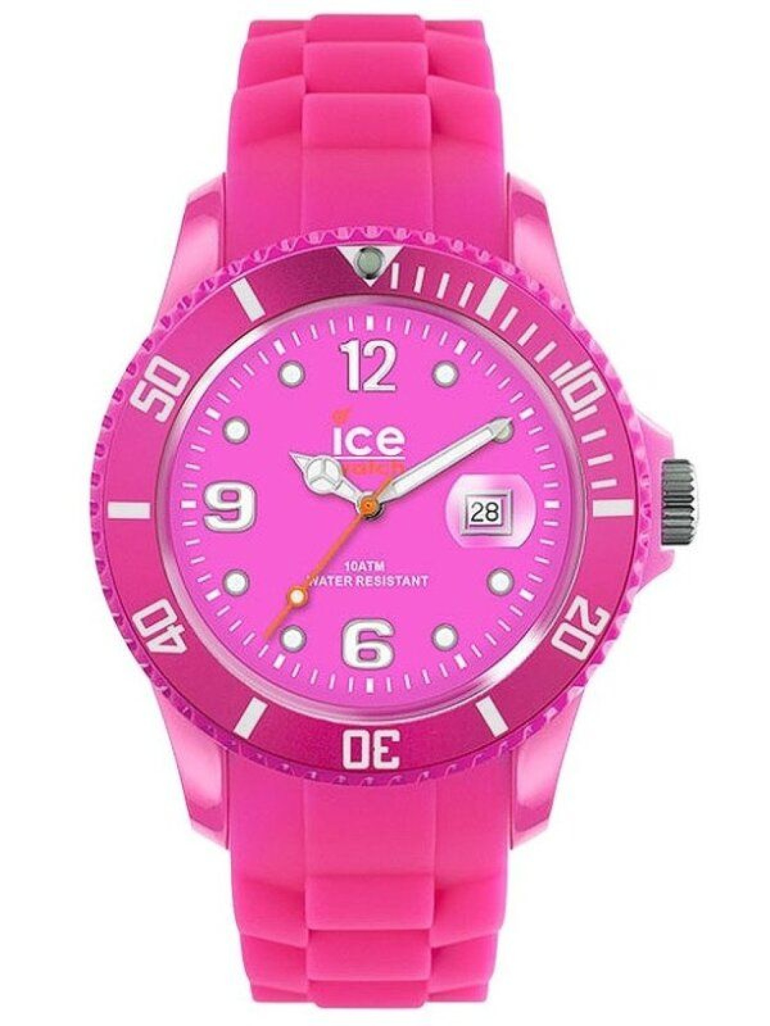 SS.NPE.B.S.12 Neu OVP, Batterie leer, Kunststoff der OVP klebt. Ice-Watch Ice-Summer - Neon Purple - Big Werk: Präzises Quarzwerk Miyota 2115 Funktionen: Anzeige von Stunde, Minute, Sekunde und Datum Zifferblatt: Neonpinkes Zifferblatt, silberne Ziffern und Punktindexe mit weißer Leuchteinlage, vollständige Minuterie, silberpolierte Stunden- und Minutenzeiger, orangefarbener Sekundenzeiger, alle Zeiger mit weißer Leuchteinlage, Datum weiß hinterlegt, Ice-Watch-Logo Gehäuse: Hochwertiges Polyceramic-Gehäuse, neonpink, drehbare, gekerbte Lünette mit Leuchtpunkt, kratzunempfindliches Mineralglas mit Lupe über dem Datum, verschraubter Gehäuseboden aus Edelstahl, griffige Krone mit Flankenschutz und Ice-Watch-Logo Wasserdicht: Geprüft bis 100 Meter / 10 ATM Armband: Hautfreundliches und feuchtigkeitsbeständiges Silikonarmband in Gliederbandoptik, neonpink Schließe: Polierte Edelstahl-Dornschließe