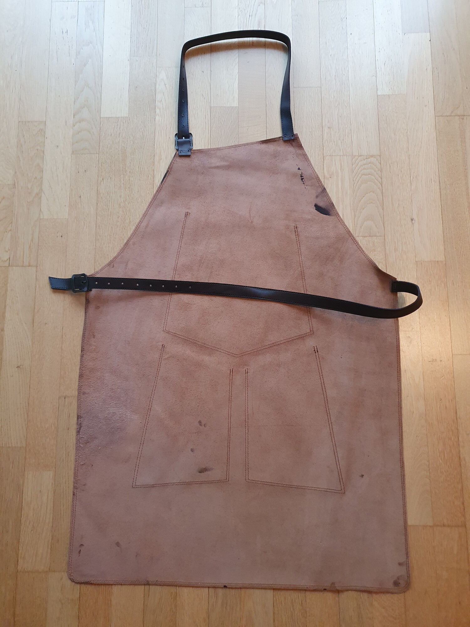Lederschürze/Grillschürze. Vorne 3 Taschen; Metallverschlüsse für Hüft- und Nackengurt; Schürze aus ca. 1 mm Leder, daher wenig Gewicht und hoher Tragekomfort; Gurte aus ca. 3 mm Leder (verstärkt) für lange Lebensdauer.