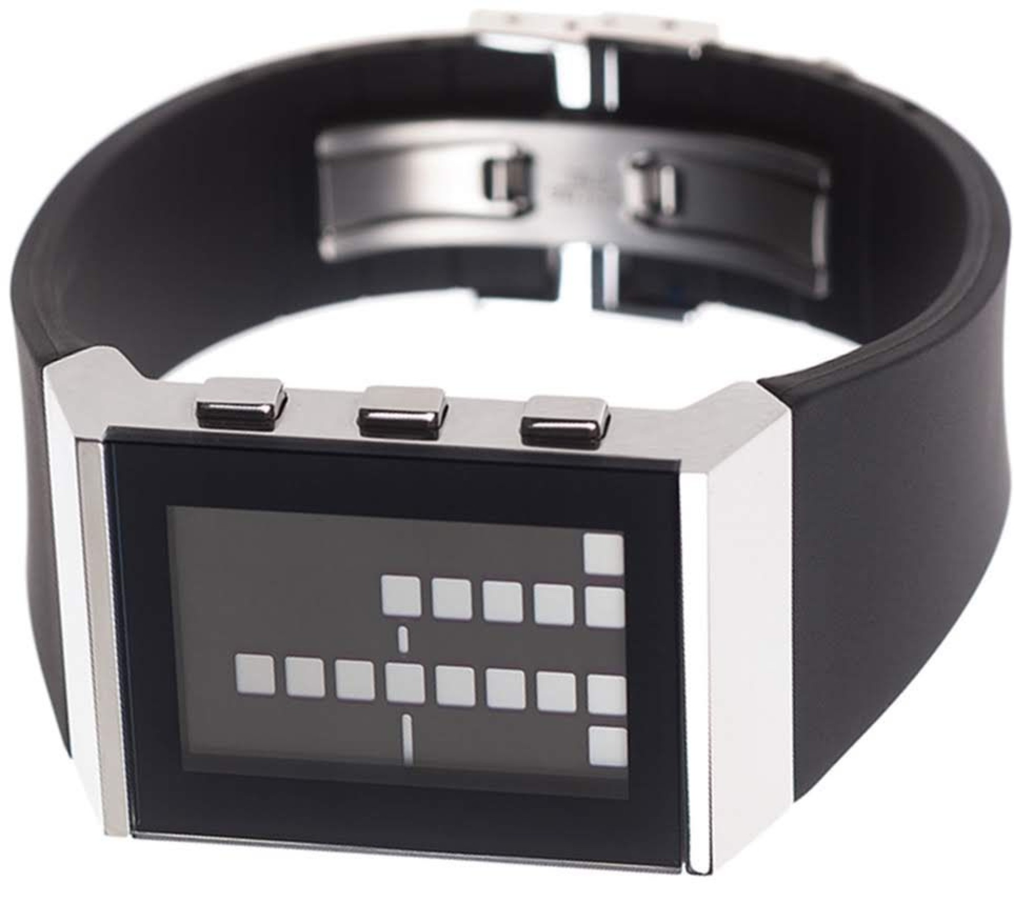 E8 Brieuc du Roscoät entwarf mit der Armbanduhr E8 WATCH ein einzigartiges Designerstück. Helle Balken auf schwarzem Grund weisen Benutzern bei dieser Armbanduhr für Damen und Herren die Zeit. Das Gehäuse der patentierten optischen Uhr ist aus robustem Stahl gefertigt, das Armband wurde aus Silikon konzipiert, was eine Langlebigkeit der Armbanduhr verspricht. Auf dem hinterleuchteten LCD-Display finden Sie zudem eine Datumsanzeige sowie die Alarmfunktion verzeichnet. Die Armbanduhr E8 WATCH ist weiterhin bis 3 Atmosphären wasserresistent. Kaufen Sie diese Armbanduhr, wenn Sie eine nur 175 g leichte Orientierungshilfe am Handgelenk suchen. Die Armbanduhr E8 WATCH wird mit erneuerter Varta-Batterie geliefert. Anhand der Blöcke auf der Uhr errechnet man die aktuelle Uhrzeit. Diese revolutionäre Designer-Uhr hat nicht nur einen einzigartigen Sinn und zeitgenössischen Stil, sondern ist auch noch ein toller Gesprächsstarter. Chrom-Finish - patentierte optische Lesung Watch - hintergrundbeleuchtete LCD