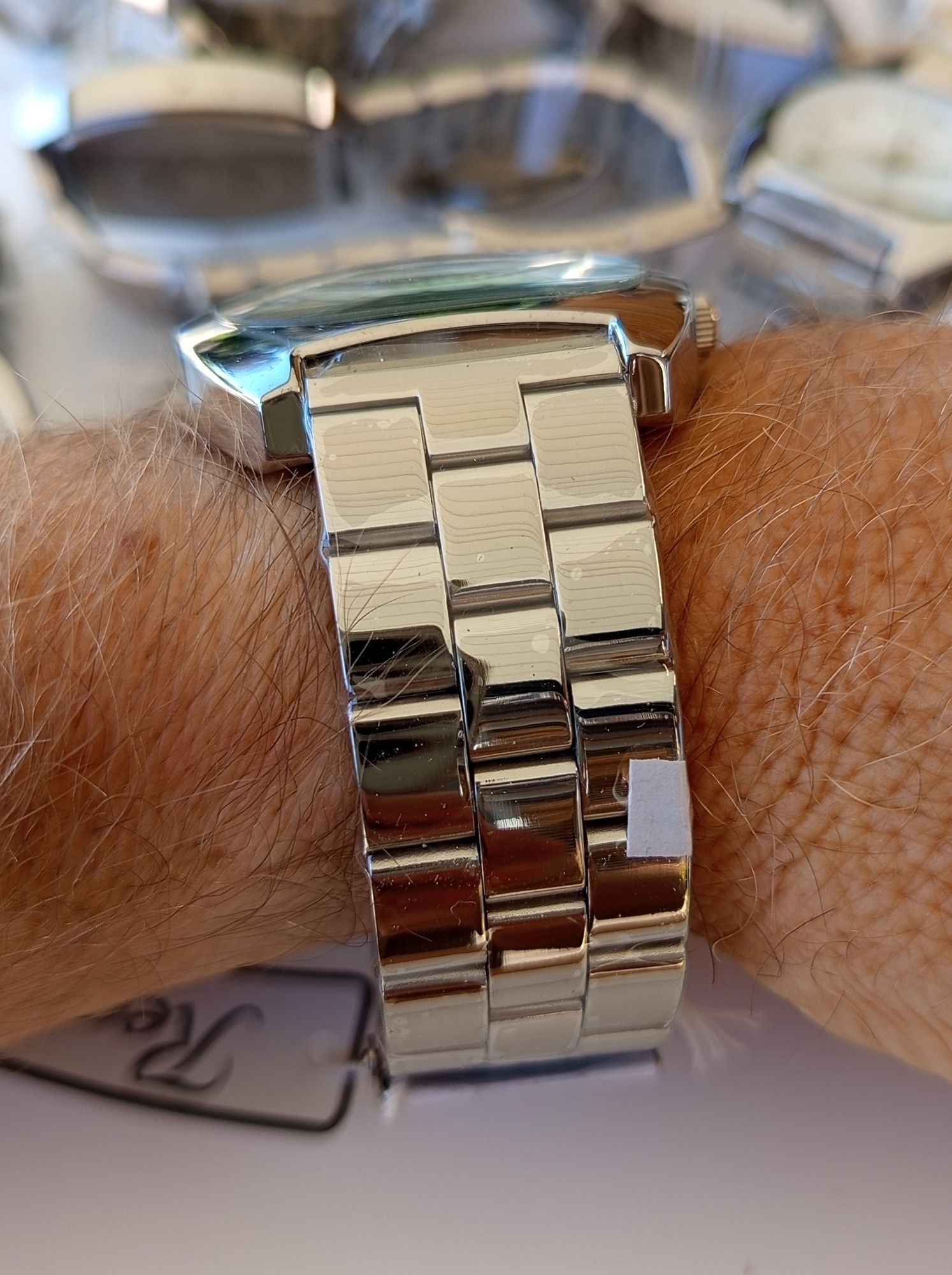 067 Ehemaliger VP in der Schweiz 399 CHF (39,90 CHF/Stück). Sie erhalten 10 Stück. 1 Uhr befindet sich in der OVP, 9 Uhren werden ohne Verpackung geliefert. Die Batterie (AG4) ist leer. Die Uhren stammen aus der Sortimentsauflösung der Handelskette Migros Schweiz. Preis ausgezeichnet in CHF. Daten Uhrwerk: Miyota Quarzwerk Zeitanzeige: Analoges 3-Zeiger-Zeitsystem mit Leuchtzeiger Gehäuse: Stahl mit verchromter edler Oberfläche Mineralglas: Extra gehärtetes Uhrenglas Armband: Stahl mit verchromter edler Oberfläche und Doppelfaltschließe; Breite: 22 mm Wasserdicht: Dieses Modell ist wasserdicht bis 3 ATM Größe: 45 x 45 mm
