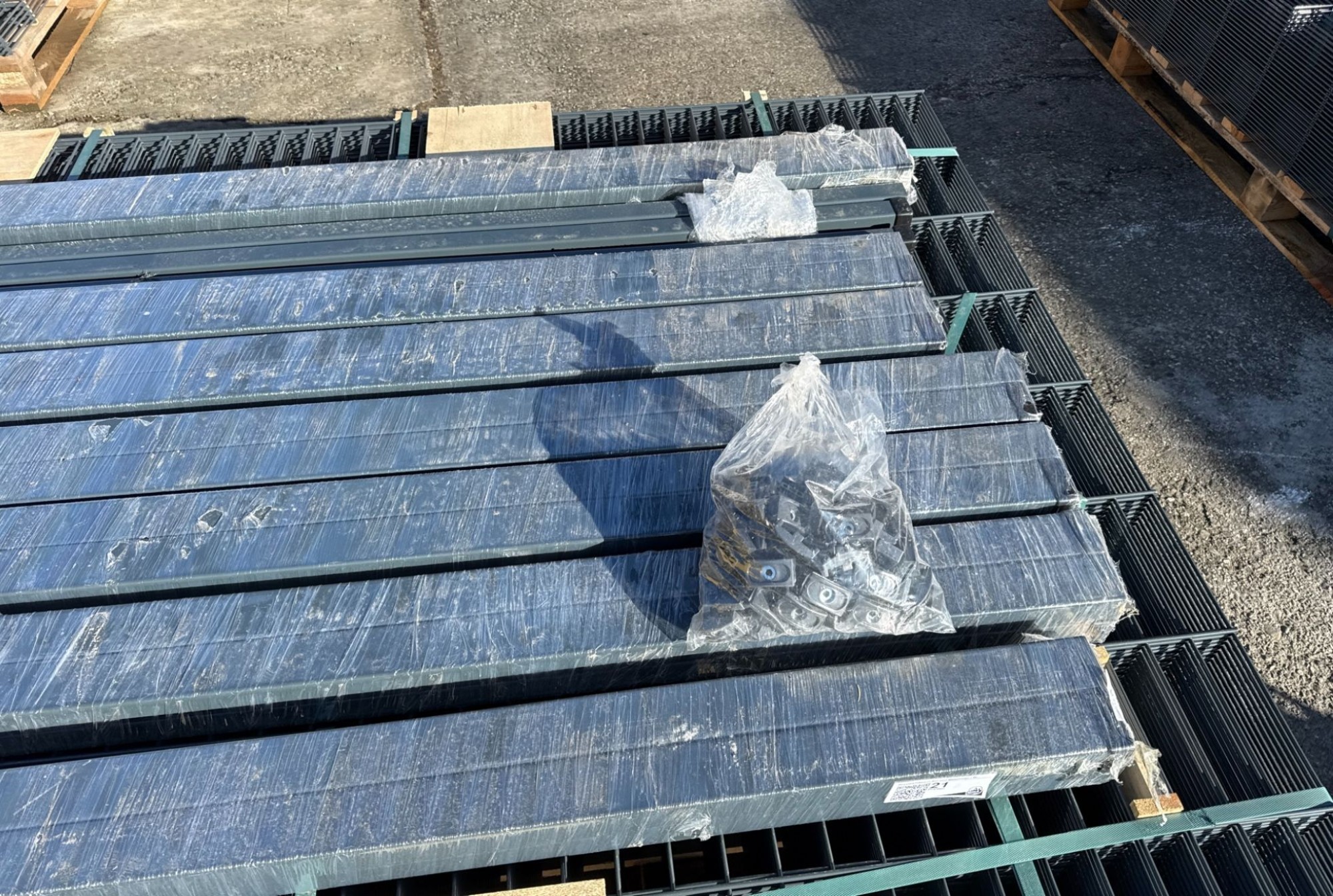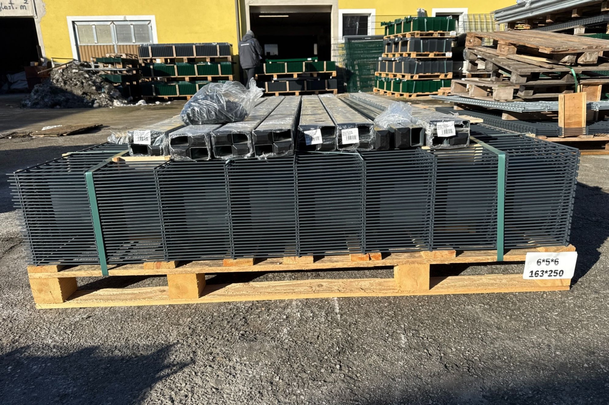 bestehend aus: 30 Doppelstabmatten je ca. 251/163 cm, 31 Stehern je ca. 220 cm hoch, 31 PVC Steckkappen, 93 Montagehalterungen inklusive selbstschneidenden Schrauben, Farbe: Ral 7016 Anthrazit, UVP: € 2.800,00