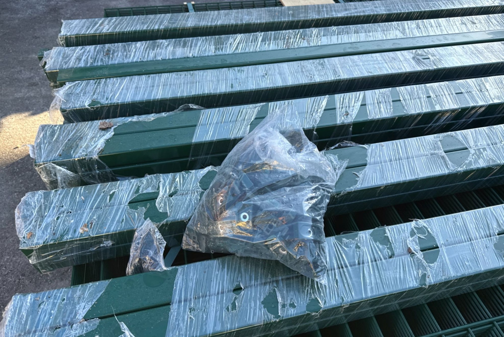 bestehend aus: 30 Doppelstabmatten je ca. 251/203 cm, 31 Stehern je ca. 260 cm hoch, 31 PVC Steckkappen, 124 Montagehalterungen inklusive selbstschneidenden Schrauben, Farbe: Ral 6005 Moosgrün, UVP: € 3.426,00