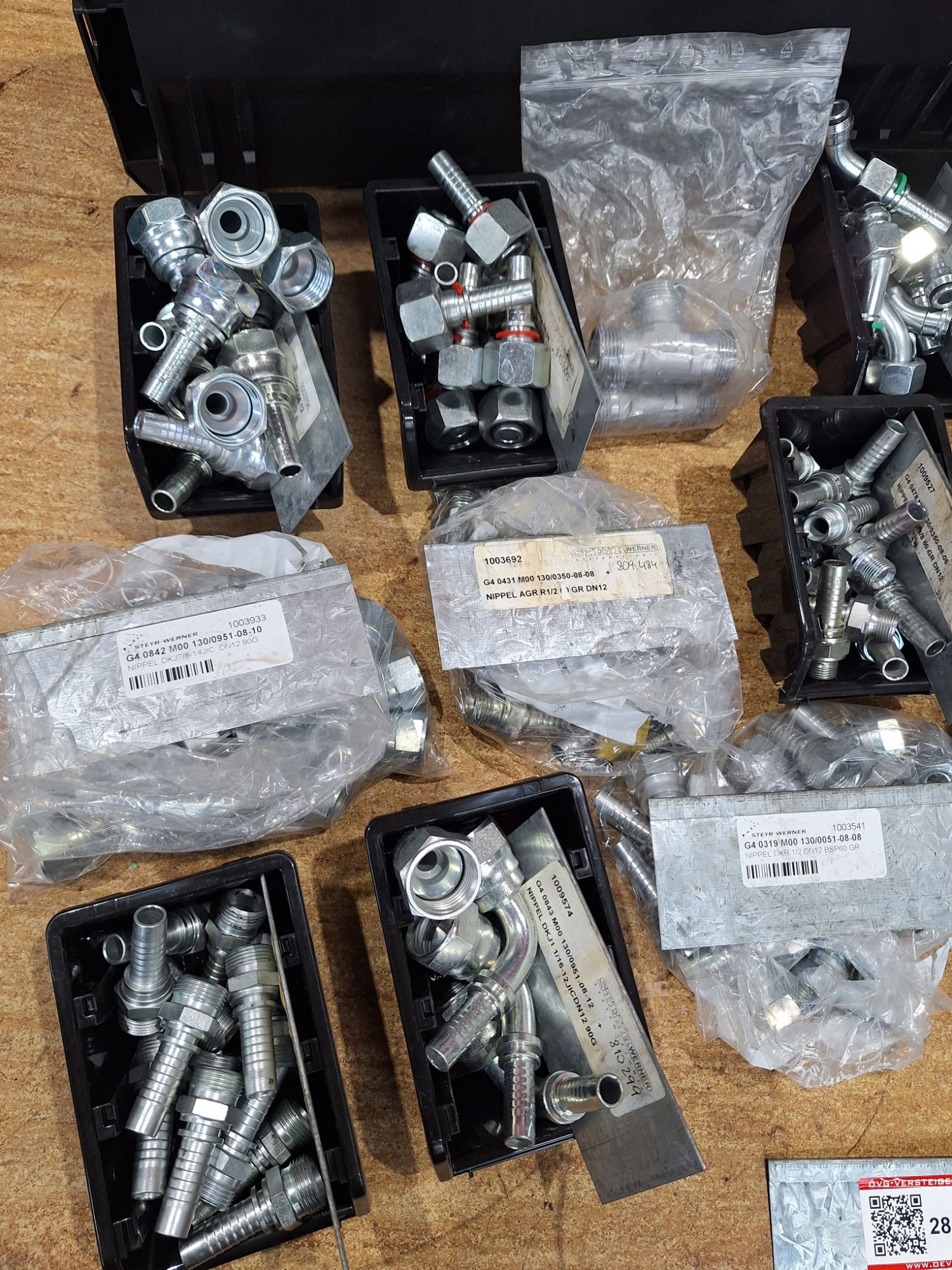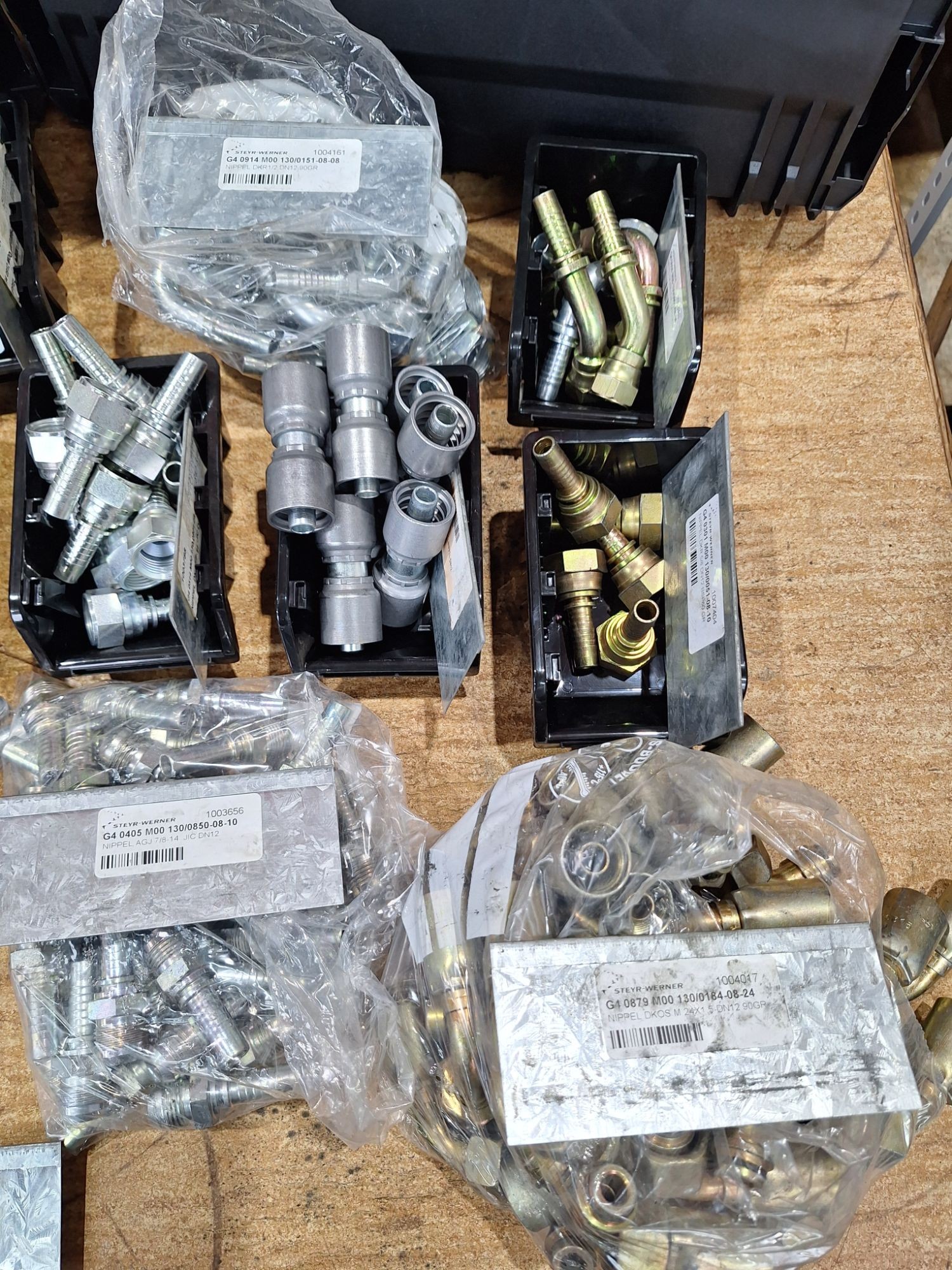 Ladeninhalt Hydraulikarmaturen, Pressnippel, gerade und 90 Grad, verschiedene Armaturen, Doppelpressarmaturen, neu, sortiert und beschriftet