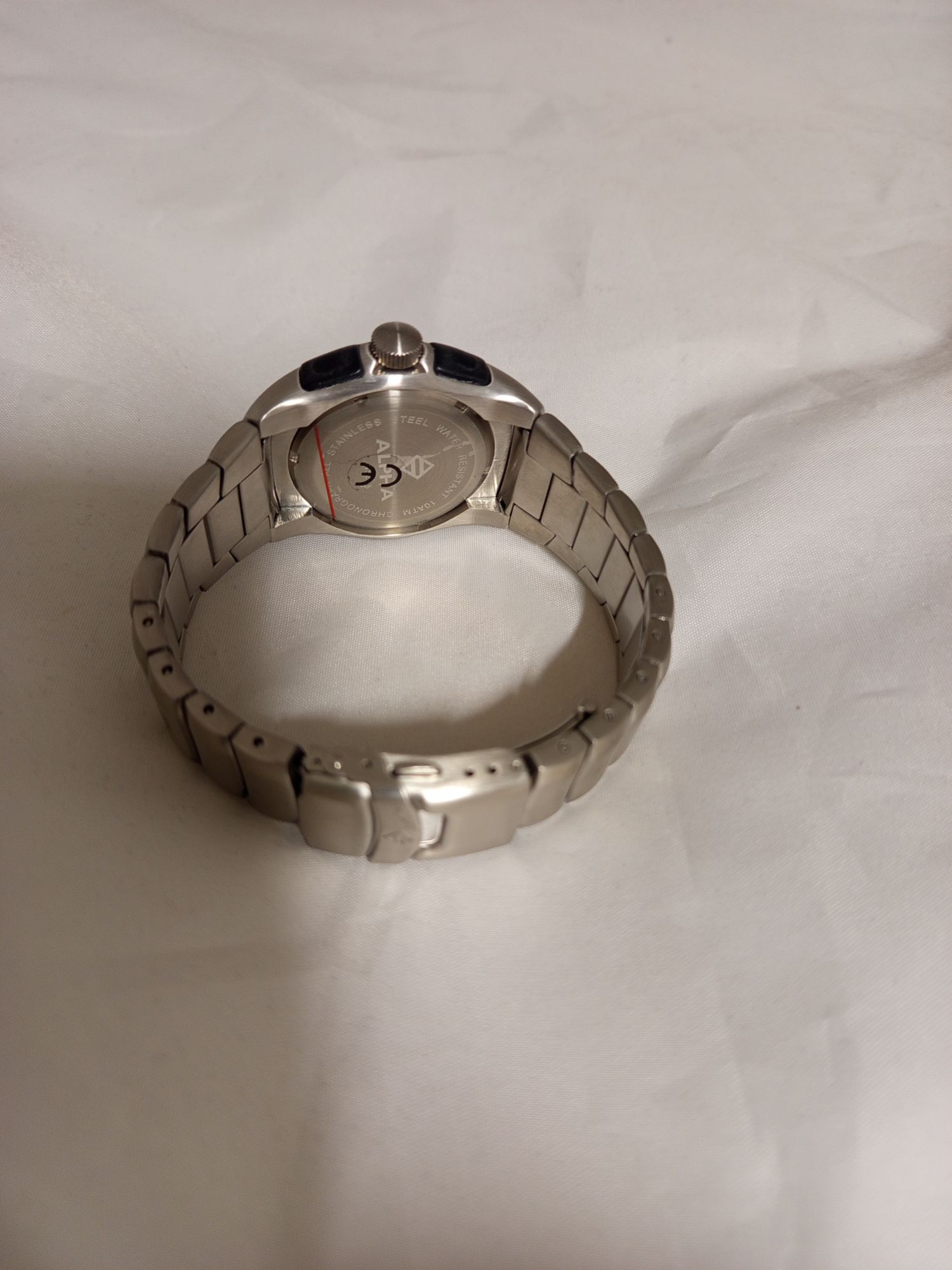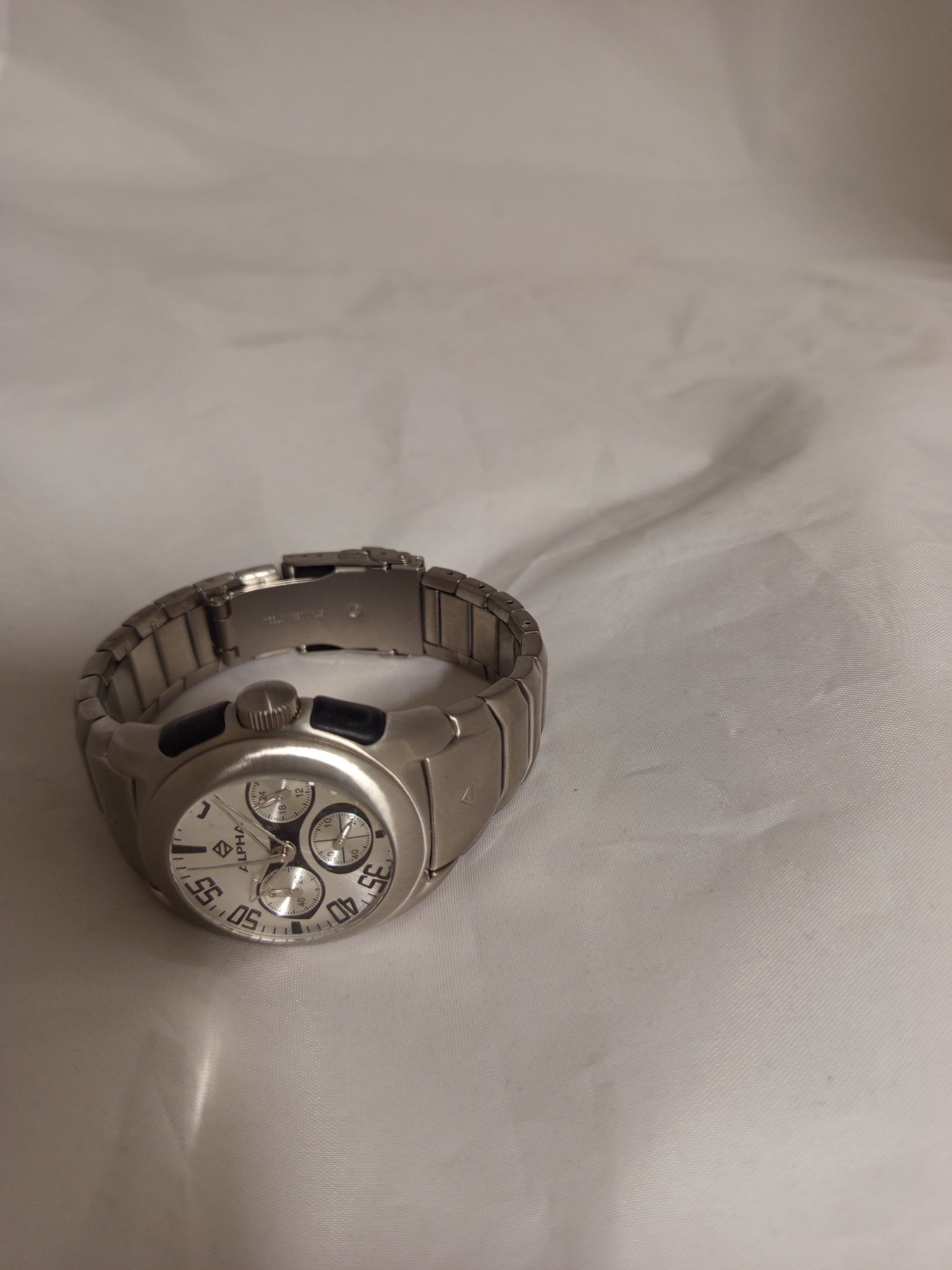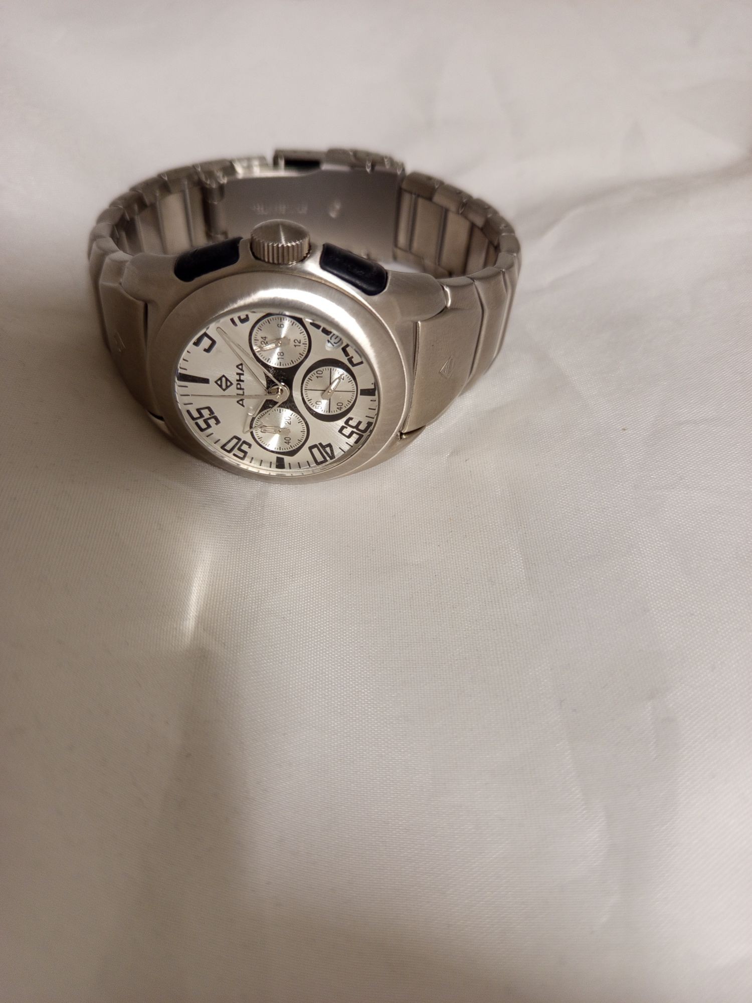 D24 Ausstellungsstück ohne Verpackung Batterie leer. Alpha Saphir Chronograph – Sportliche Eleganz in Edelstahl. Erleben Sie einen Zeitmesser, der durch sein massives Erscheinungsbild und seine technische Präzision besticht. Dieser Chronograph von Alpha Saphir ist der ideale Begleiter für Männer, die ein ausdrucksstarkes Accessoire für den Alltag und Freizeitaktivitäten suchen. Design-Highlights: Gehäuse & Armband: Die Uhr verfügt über ein robustes Gehäuse aus gebürstetem Edelstahl, das nahtlos in ein passendes Edelstahl-Gliederarmband mit Sicherheitsfaltschließe übergeht. Zifferblatt: Das helle, silberfarbene Zifferblatt ist mit drei kontrastreichen Totalisatoren (Hilfszifferblättern) ausgestattet, die der Uhr ihren typischen Chronographen-Look verleihen. Markante Lünette: Die breite Lünette mit gravierten Ziffern (5 bis 55) betont den sportlichen Charakter und sorgt für zusätzliche Tiefe im Design. Saphirglas: Zum Schutz vor Kratzern ist die Uhr mit einem hochwertigen, leicht gewölbten Glas ausgestattet. Technische Merkmale: Chronographen-Funktion: Die drei Hilfszifferblätter dienen der Zeitmessung (Stoppuhr-Funktion) und zeigen beispielsweise Minuten und Sekunden separat an. Präzisionswerk: Im Inneren arbeitet ein zuverlässiges Quarzwerk für höchste Ganggenauigkeit. Wasserdichtigkeit: Mit einer Wasserdichtigkeit von bis zu 100 Metern (10 ATM) ist die Uhr bestens gegen Spritzwasser geschützt und kann auch beim Schwimmen getragen werden. Bedienung: Seitliche Drücker ermöglichen eine einfache Steuerung der Stoppfunktionen, während die geriffelte Krone das Einstellen der Uhrzeit erleichtert. Produktdetails auf einen Blick: Gehäusedurchmesser: ca. 42 mm. Material: Edelstahl (Stainless Steel). Glas: Kratzfest. Anzeige: Analog mit Chronographen-Funktion. Besonderheit: Datumsscheibe für zusätzliche Alltagstauglichkeit.
