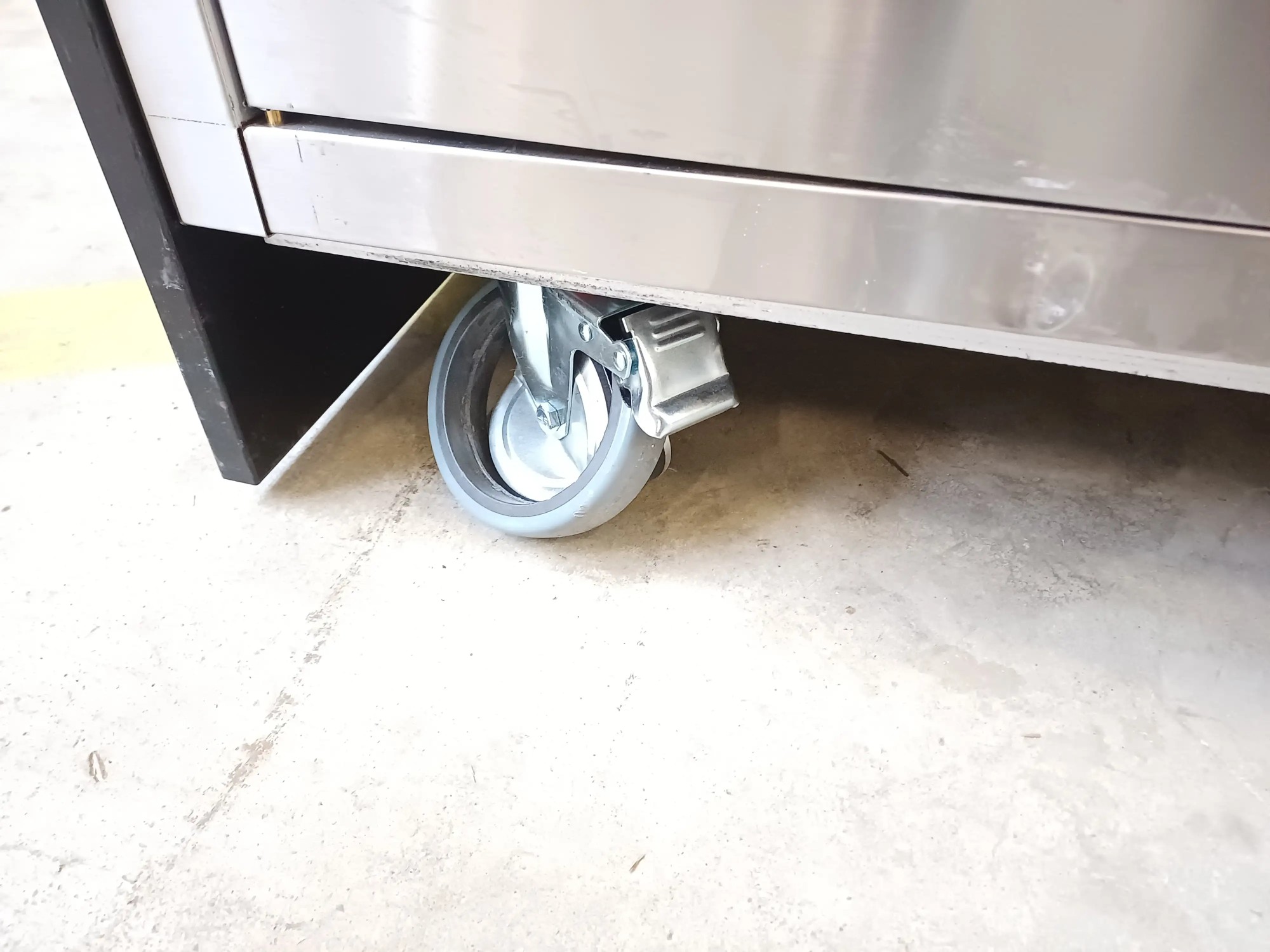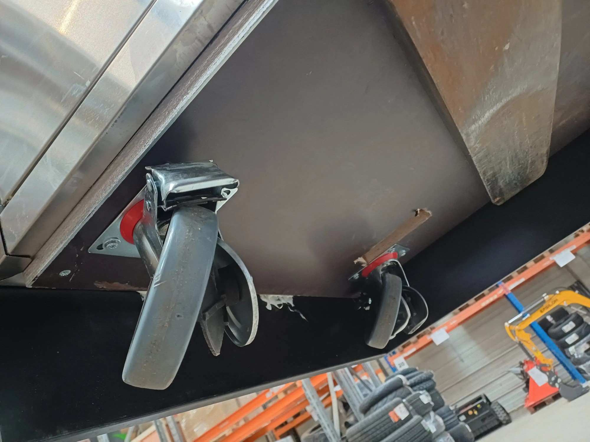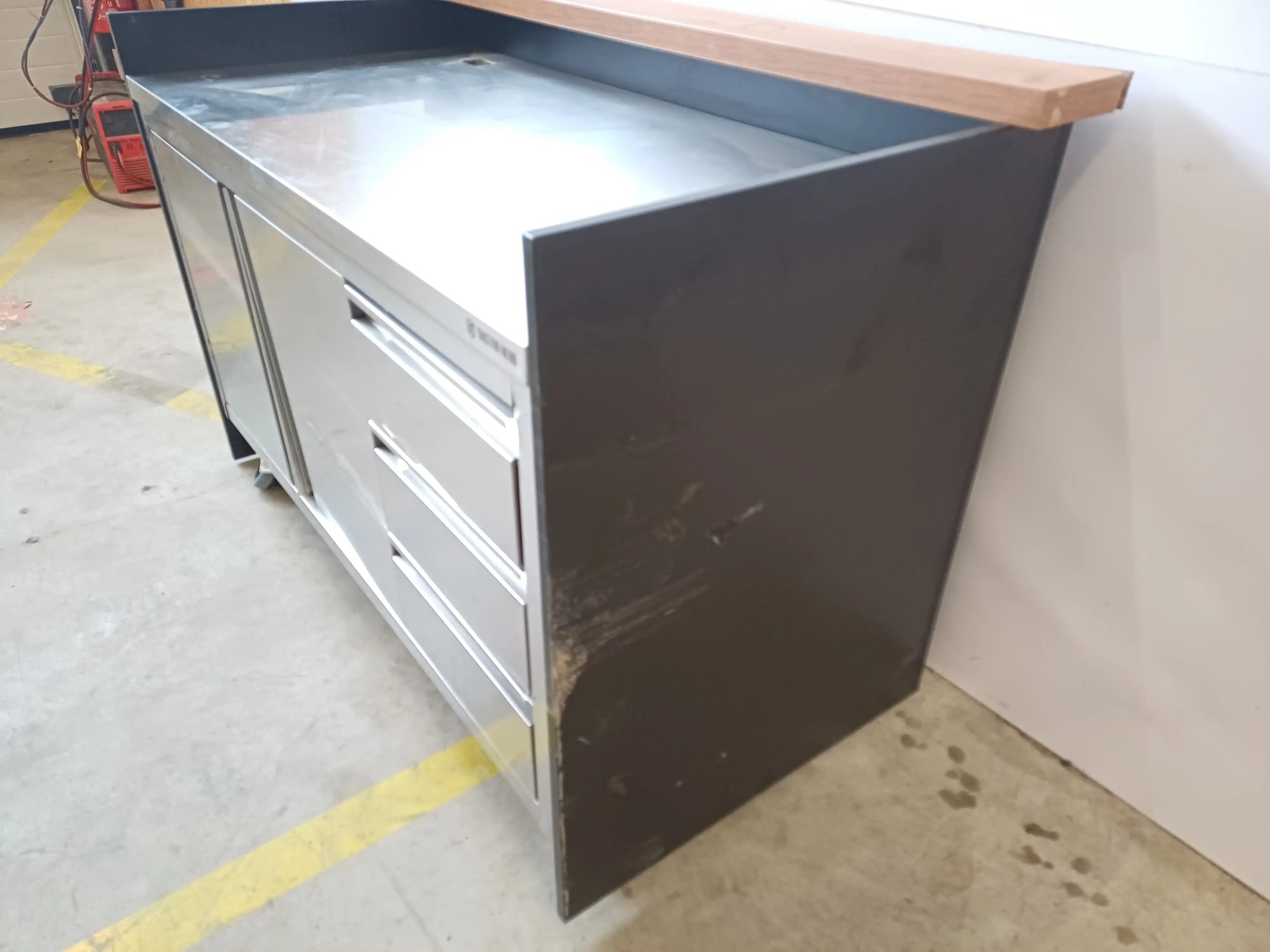 Arbeitspult aus Edelstahl, 145x72x97 cm, defekte Räder und Abschürfungen an der Seitenwange, siehe Fotos