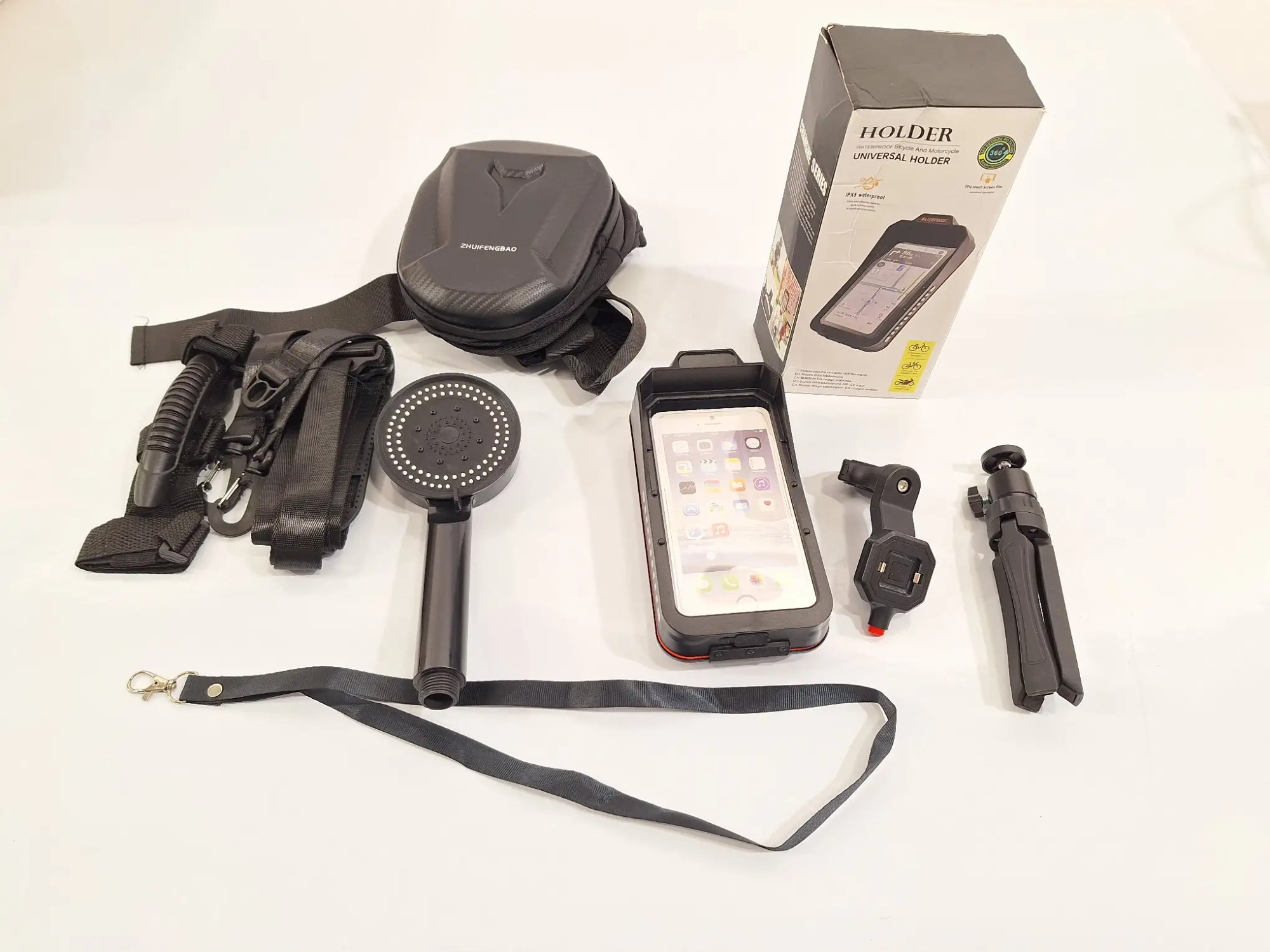 1x­Han­dy­hal­te­rung für Mo­tor­rad & Fahr­rad, 1x­Dusch­kopf, 1x­klei­ner Ruck­sack (ZHUI­FEN­G­BAO)