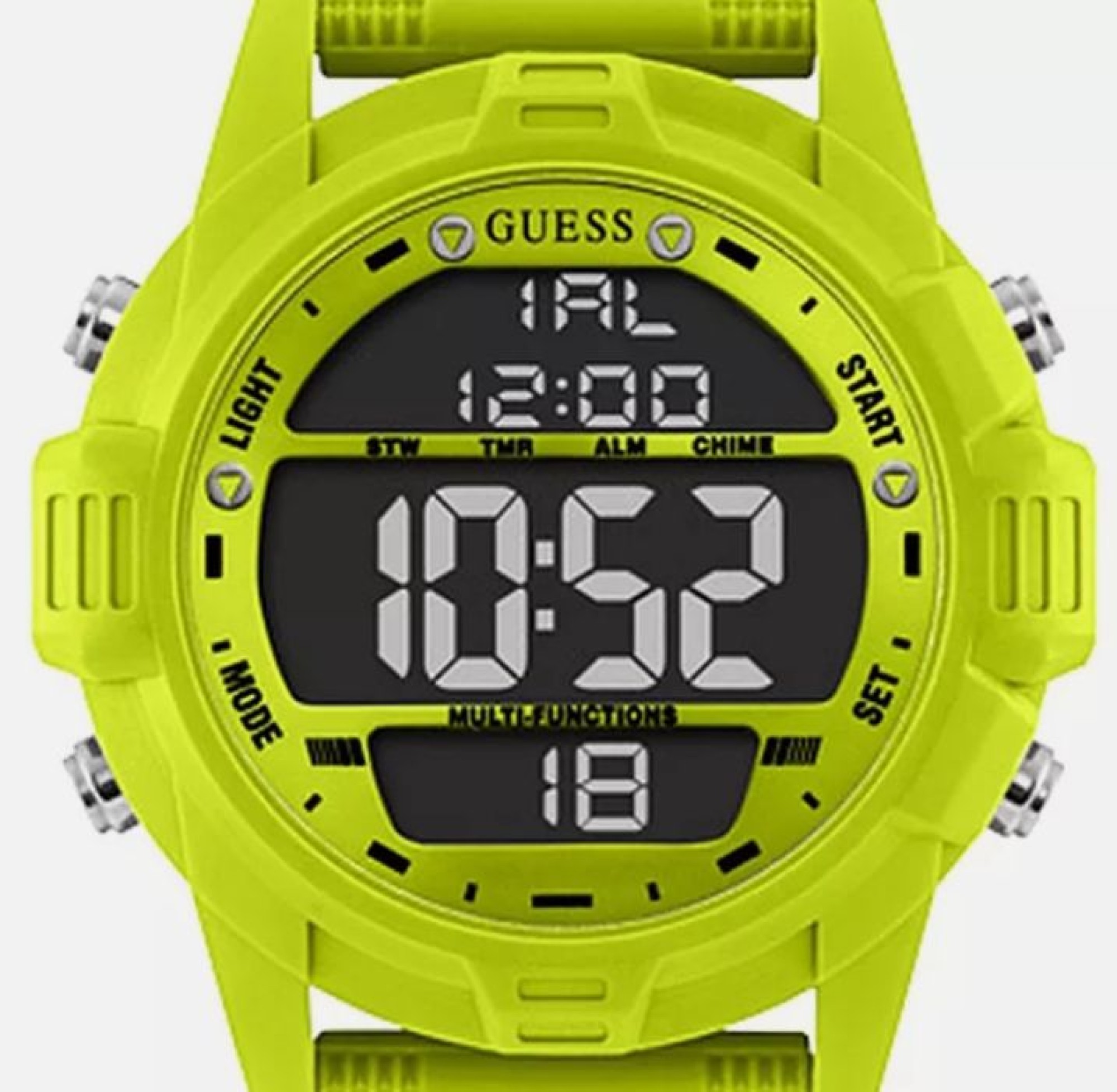 NEU OVP grün GW0050G2 Batterie leer. Guess Chronograph. Sportiver Chronograph, Kunststoffgehäuse, Ø ca. 40 mm, Armband aus weichem Silikon, mit Stoppfunktion 1/100 Sek., mit 12/24-Std.-Anzeige. Die Marke Guess ist bekannt für ihr modisches und trendiges Design. Guess legt großen Wert auf aktuelle Trends und setzt diese in ihren Uhrenkollektionen um. Die Uhren zeichnen sich durch ihre modernen Formen, auffällige Details und stilvolle Farbkombinationen aus. Mit einer Guess-Uhr kannst du deinem Outfit einen modischen und trendigen Touch verleihen. Antrieb Quarz, Anzeige digital, Displaytechnologie LCD, Zusatzfunktionen 12/24-Std.-Anzeige, 2. Zeitzone, wasserdicht spritzwassergeschützt, Datumsfunktionen Monat, Tag, Wochentag, Stoppfunktionen 1/100 Sekunde, Zwischenzeit, Gehäusefarbe grün, Armbandfarbe grün, Gehäusematerial Kunststoff, Armbandmaterial Silikon, Gehäusedurchmesser (ohne Krone) 40 mm, Glas Mineralglas, Verschluss Armband Dornschließe