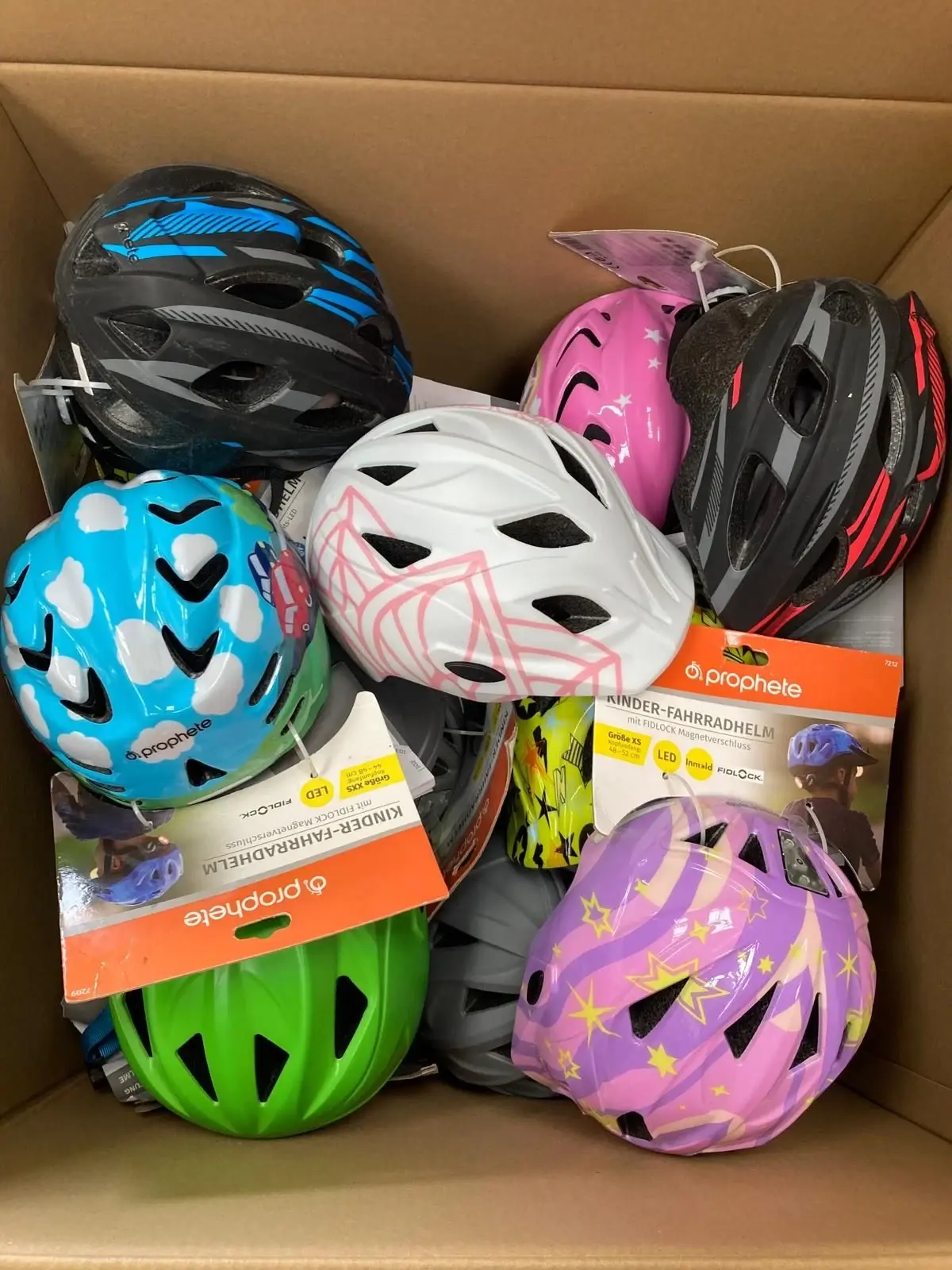 In dieser Box finden Sie 7 Fahrradhelme in verschiedenen Größen von Prophete (Musterfoto) UVP: 200€