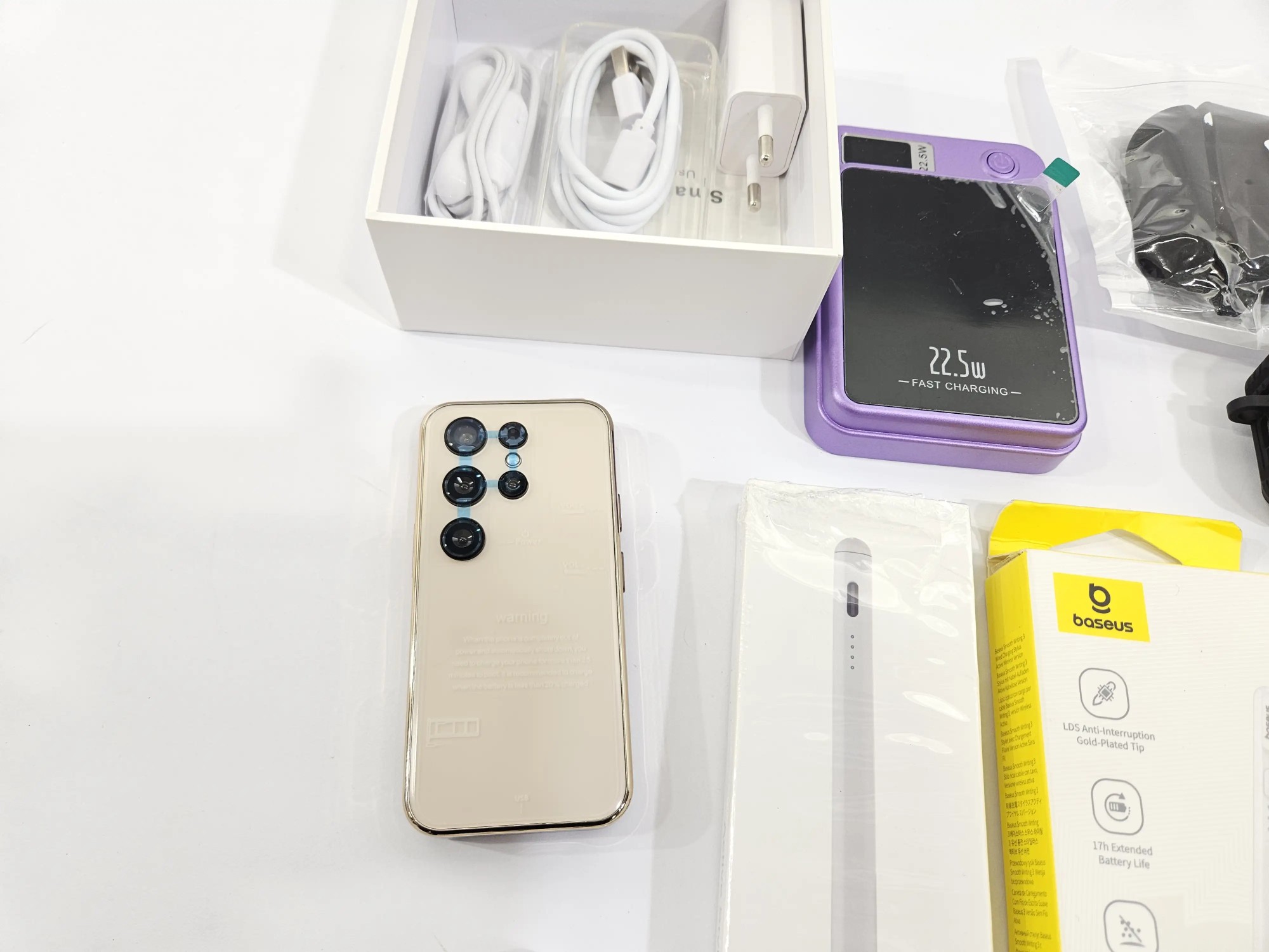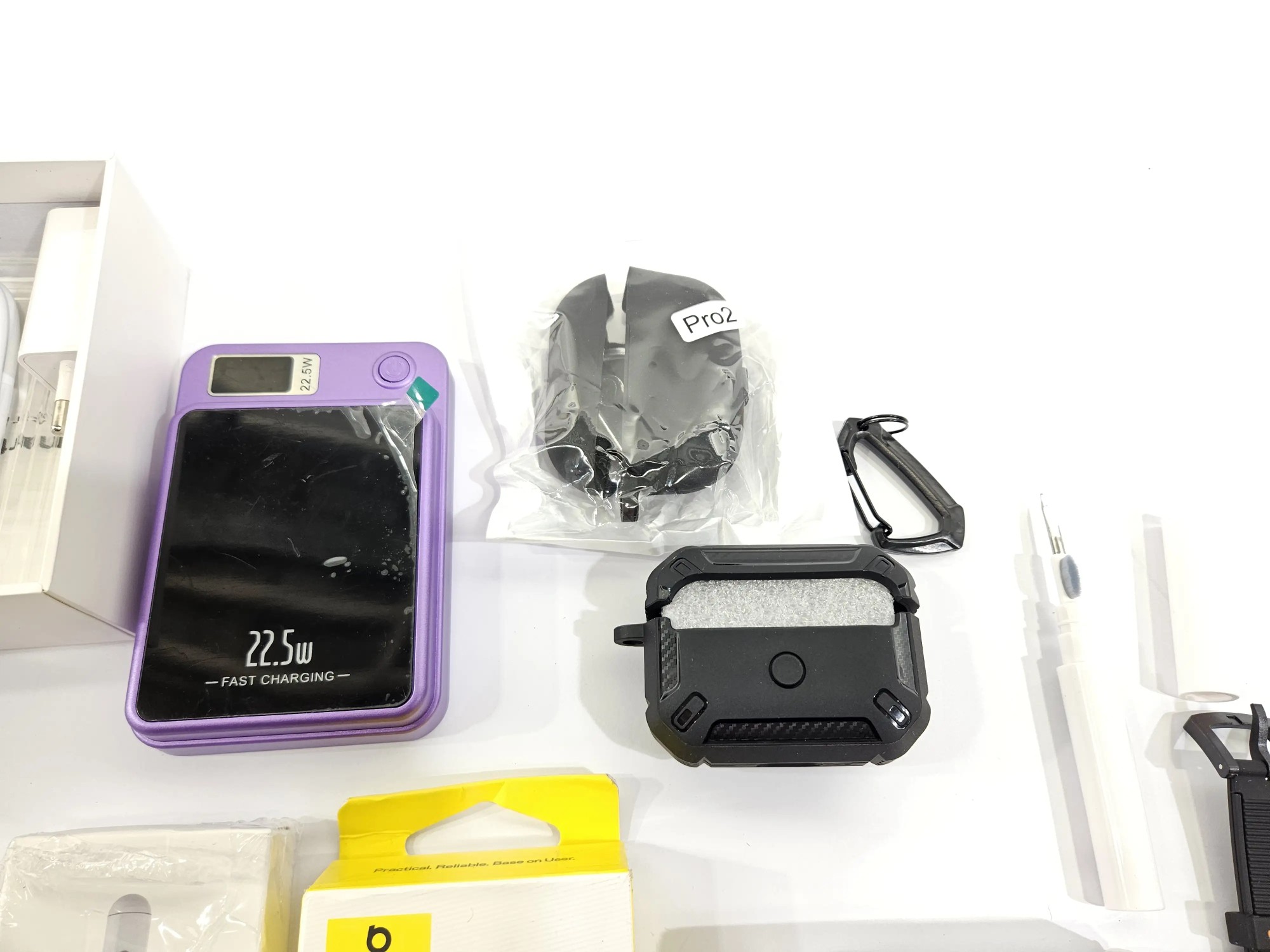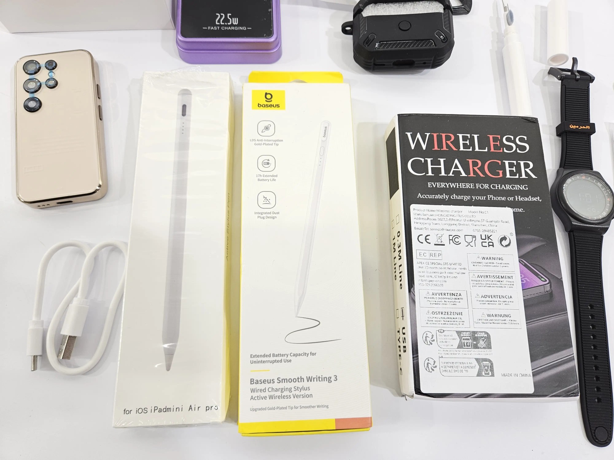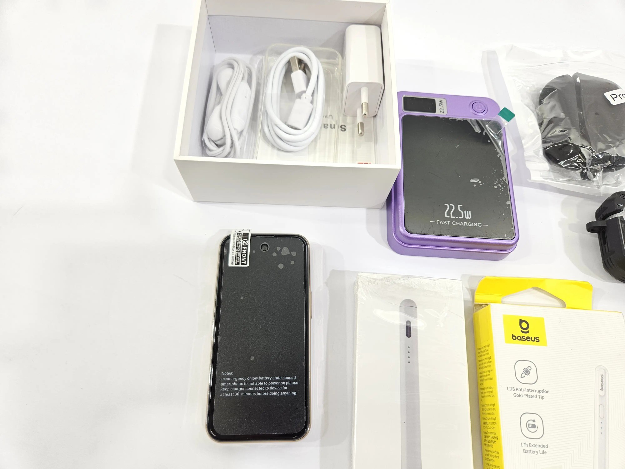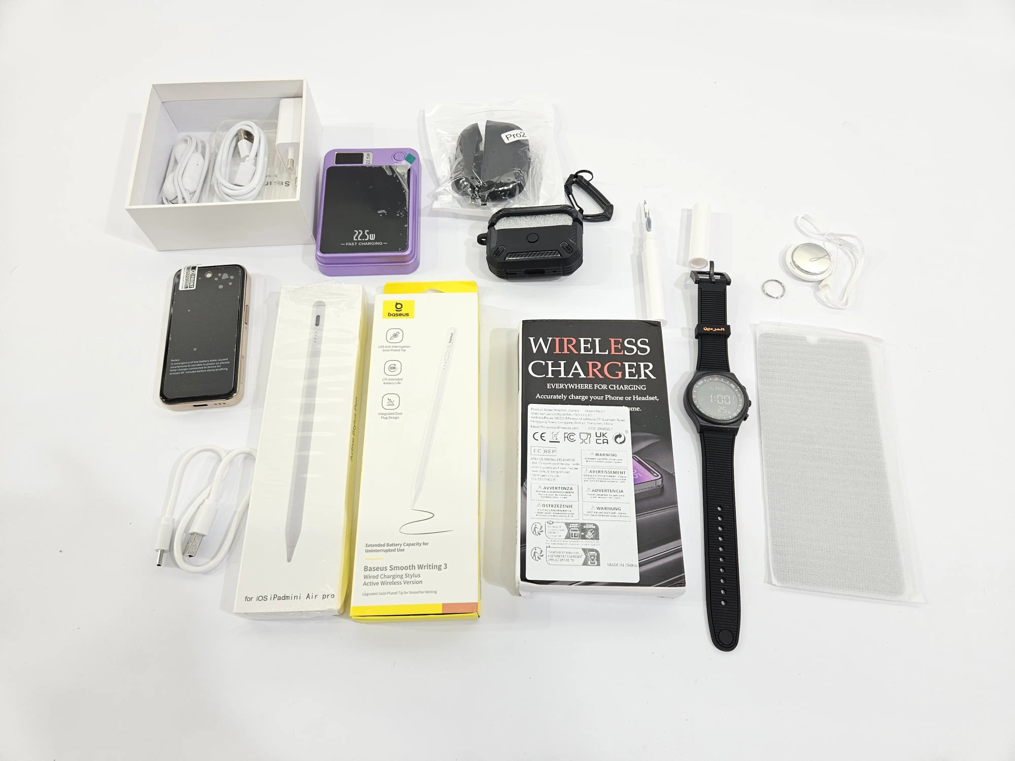 Mi­ni Han­dy, 2 x Wire­less Power­bank, 2 x Di­gi­ta­ler Stift, Schutz­hül­le für Kopf­hö­rer, Uhr, Pan­zer­glas, Tra­cker