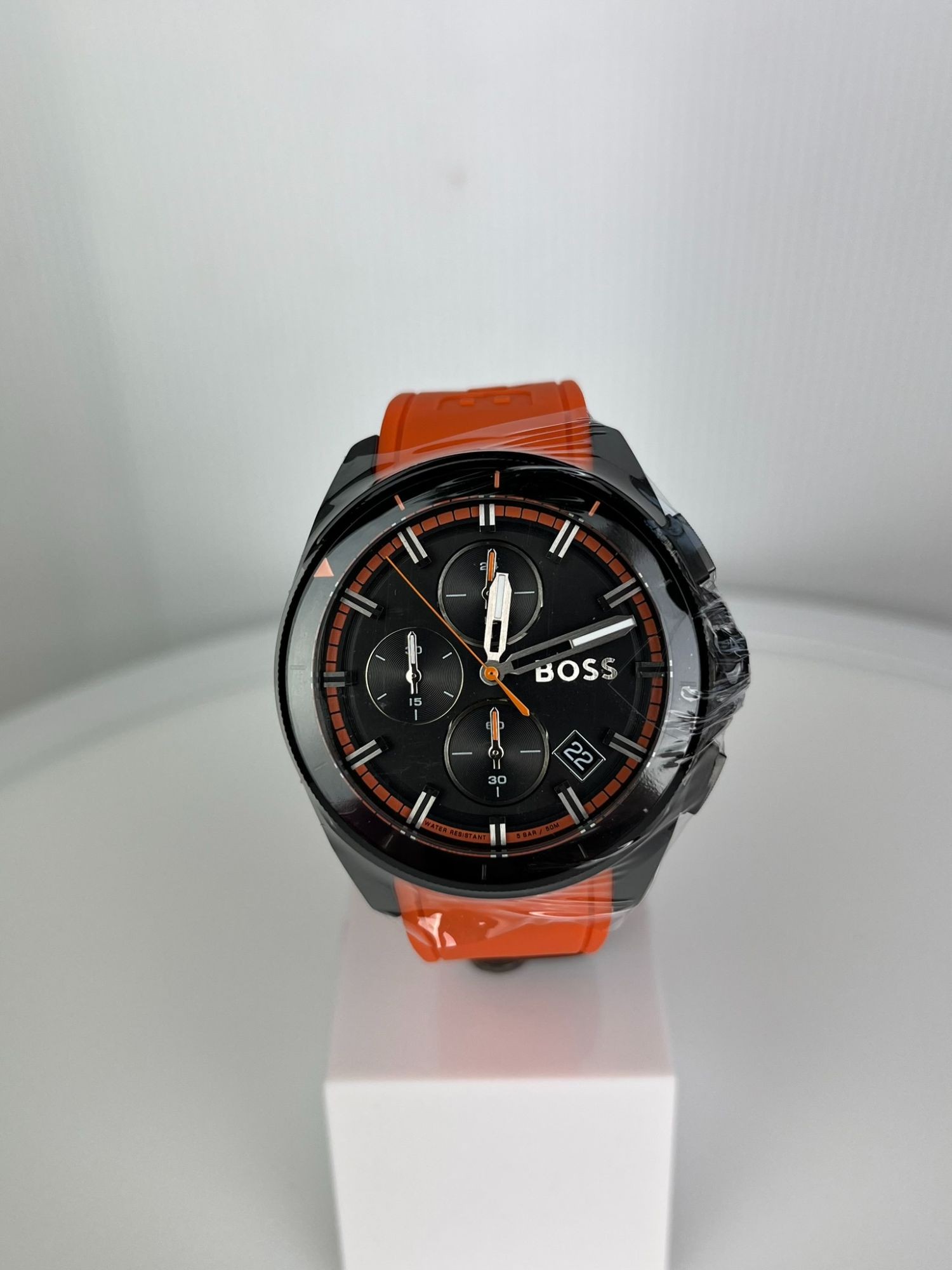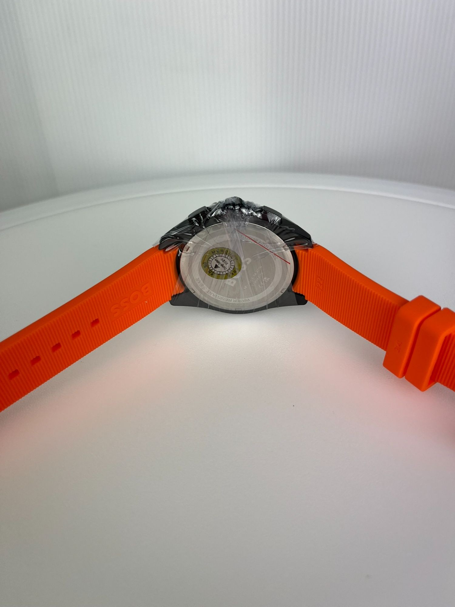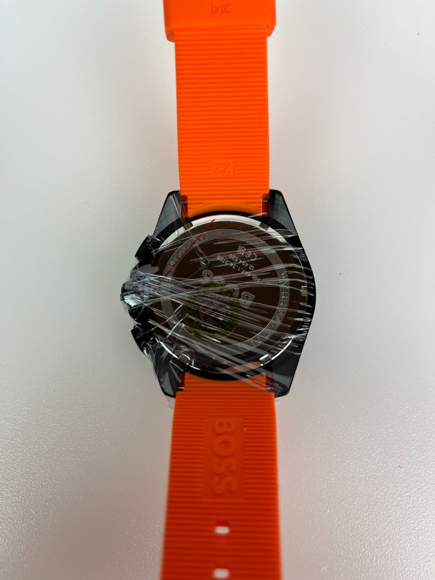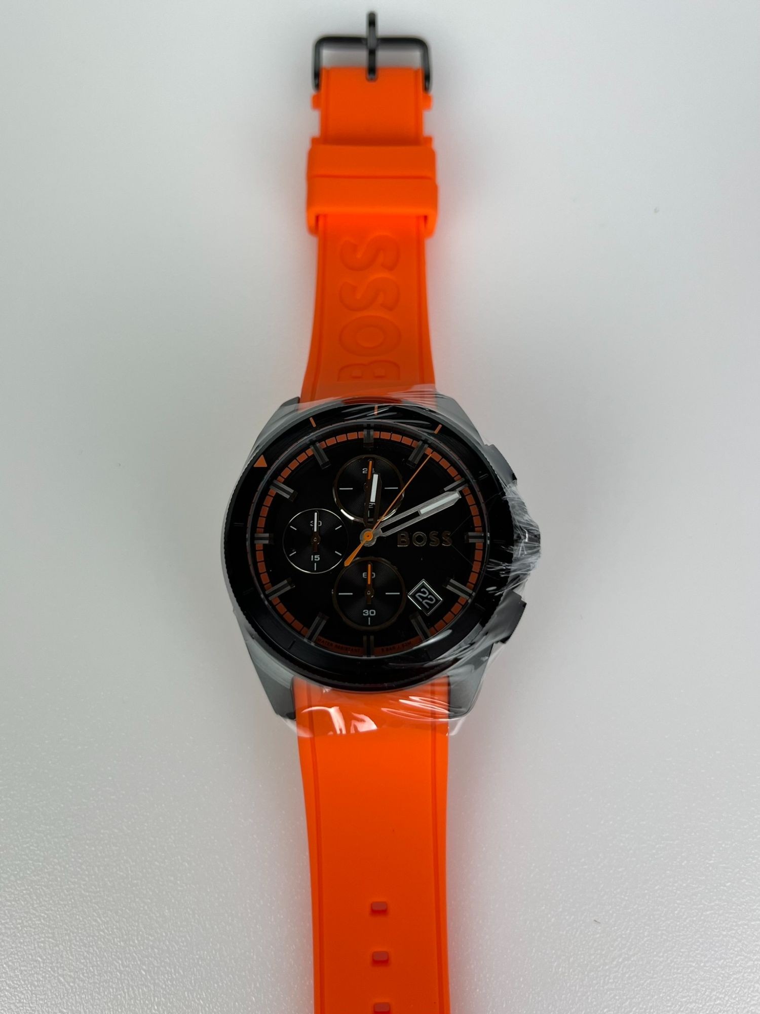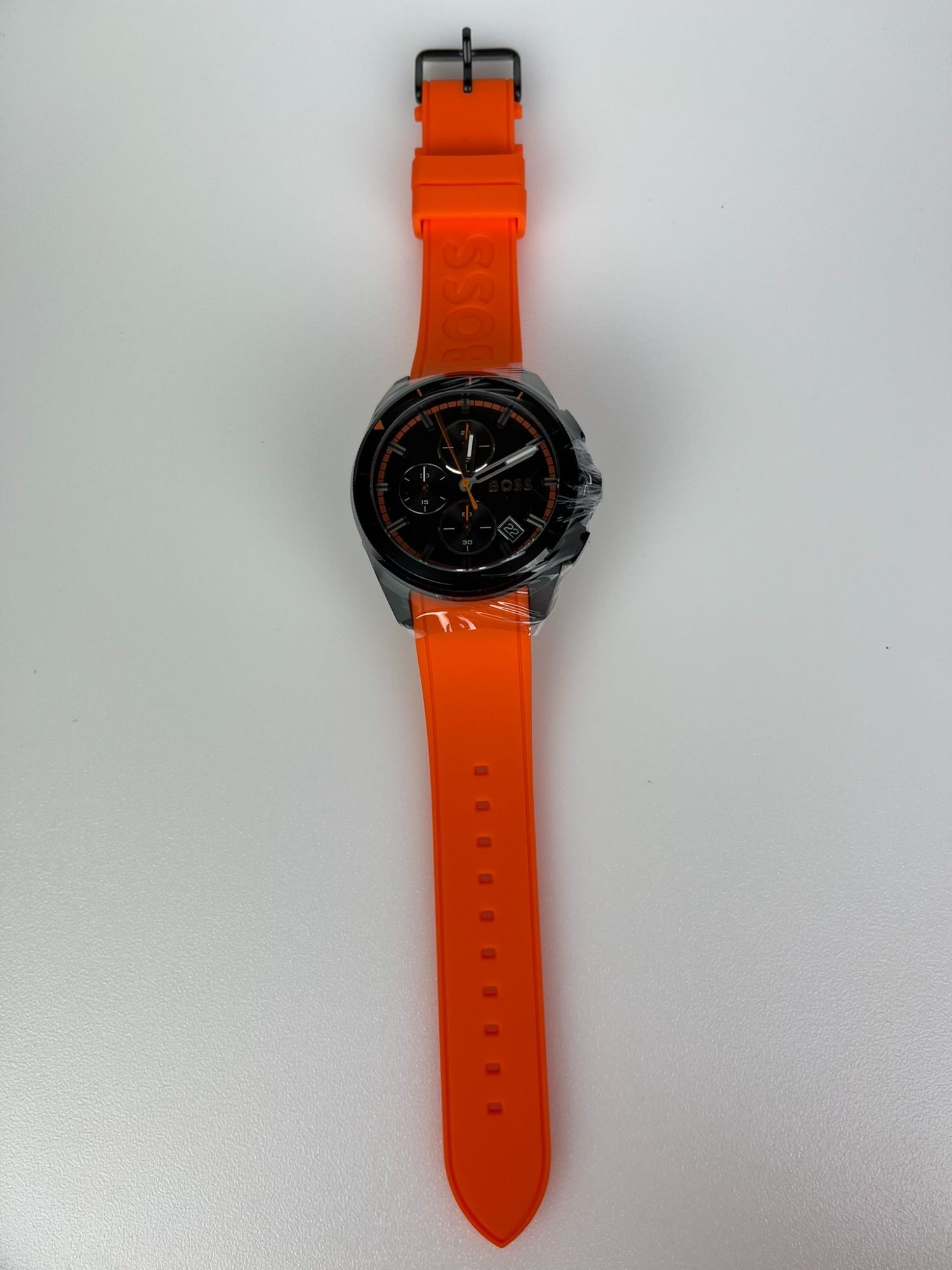 Neu OVP 1513957. Ge­schlecht: Her­ren. Uh­ren­typ: Sportuhr. Quarz-Chro­no­gra­ph­werk mit Da­tums­funk­ti­on. Ge­häu­se­di­cke: 11,45 mm / Durch­mes­ser des Ge­häu­ses: 44 mm. Schwar­zes Son­nen­strah­len-Zif­fer­blatt, oran­ges Si­li­kon­arm­band. Was­ser­ab­wei­send bis 5 Bar. Sie kann beim Du­schen oder Schwim­men ge­tra­gen wer­den, je­doch nicht beim Tau­chen.