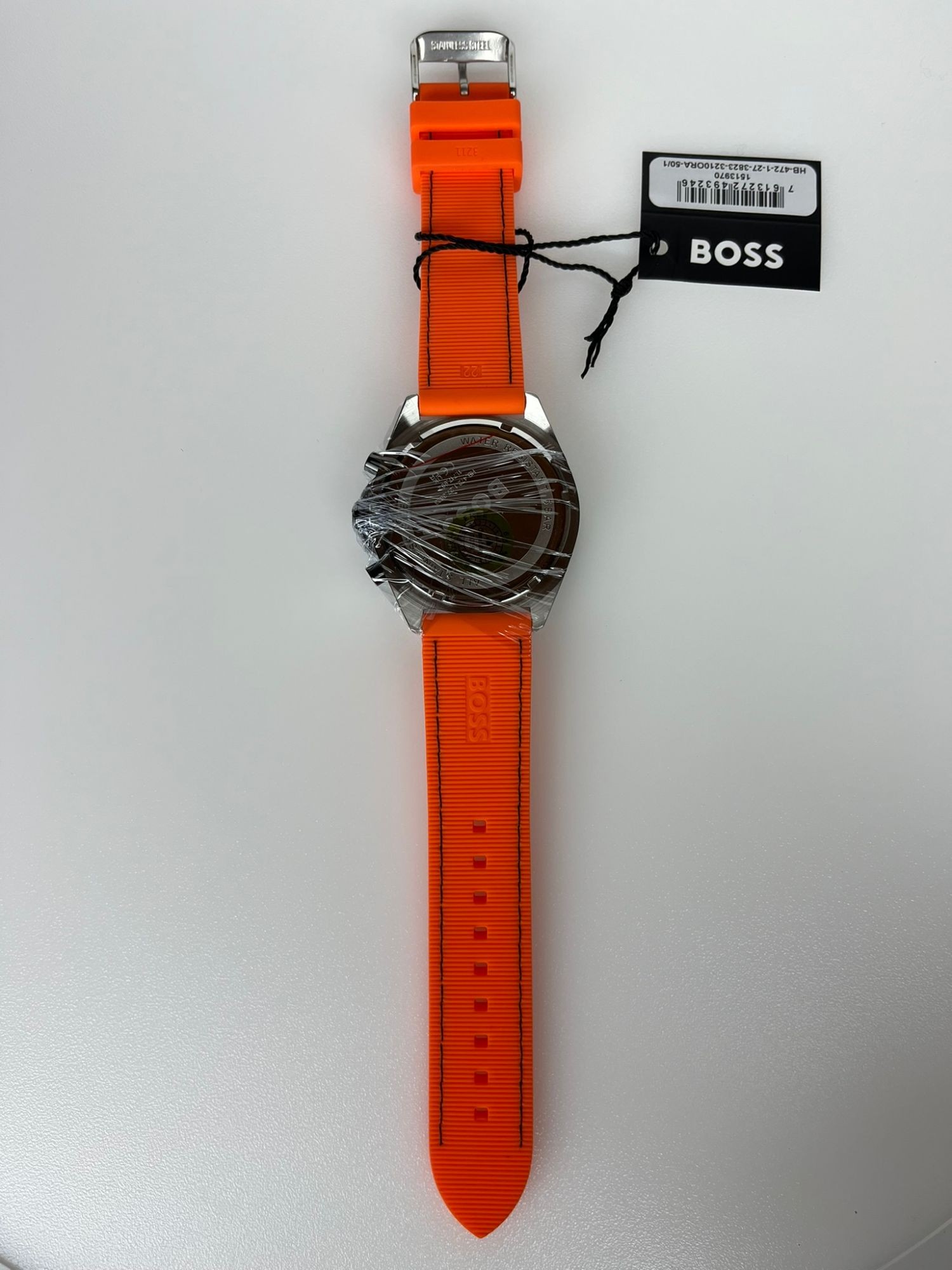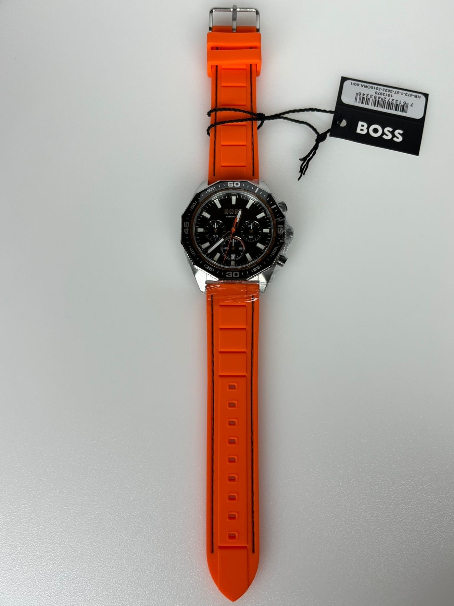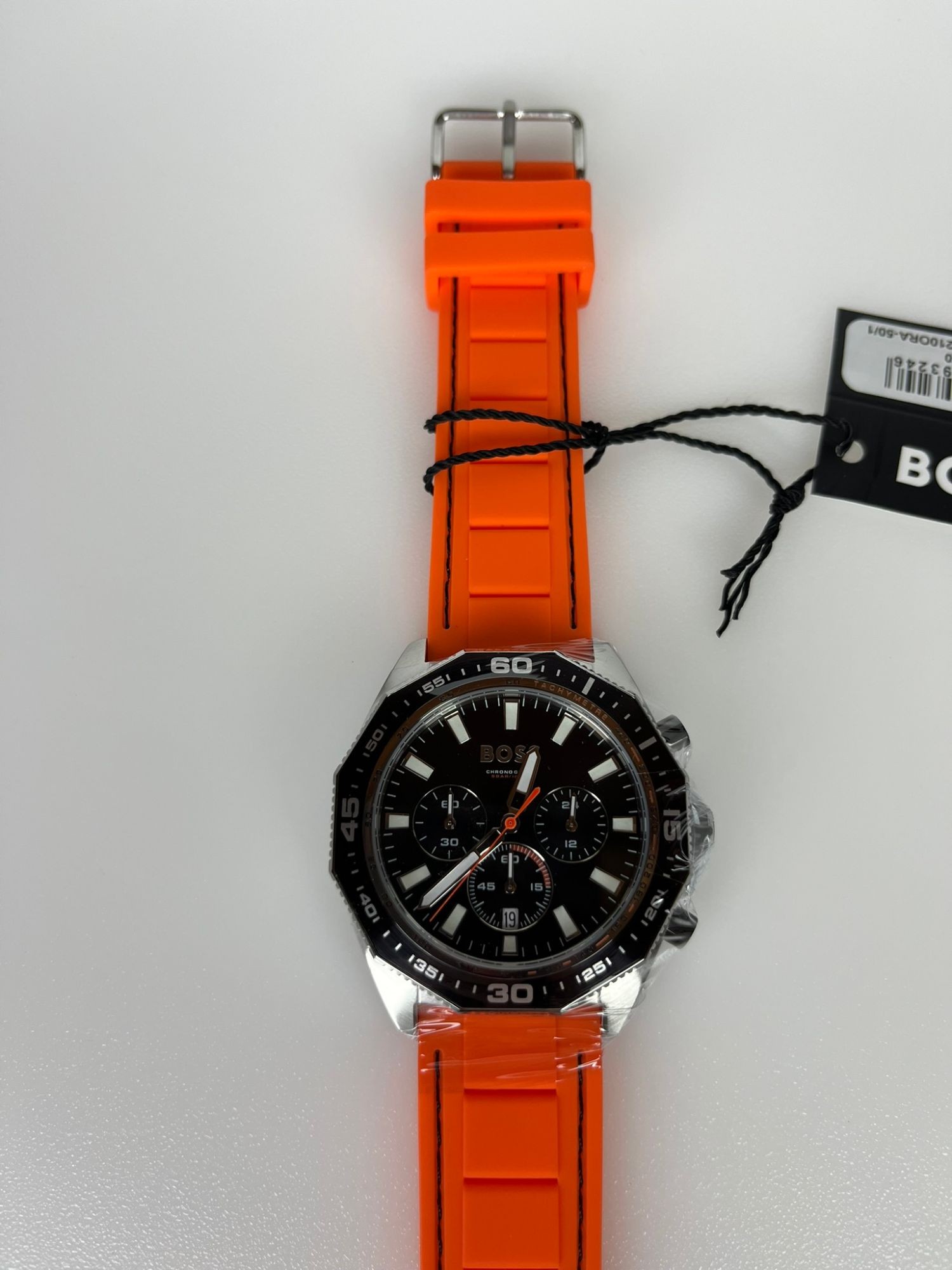 Neu OVP 1513970 GE­HÄU­SE - Ge­häu­se aus: Edel­stahl - Form des Ge­häu­ses: Rund - Far­be des Ge­häu­ses: Sil­ber - Glas: Mi­ne­ral­glas UHR­WERK - Art der An­zei­ge: Chro­no­graph - Uhr­werk: Quarz - Ka­len­der: Da­tum ZIF­FERN­BLATT - Far­be des Zif­fern­blatts: Schwarz ARM­BAND - Far­be des Arm­bands: Oran­ge - Schlie­ße: Dorn­schlie­ße - Arm­band aus: Si­li­kon WEI­TE­RE AN­GA­BEN - Pro­dukt: Uhr - Her­stel­ler: Boss - Ver­pa­ckung: Ori­gi­nal­ver­pa­ckung mit Do­ku­men­ten - Schlie­ße: Dorn­schlie­ße - TECH­NI­SCHE DA­TEN - Durch­mes­ser (oh­ne Kro­ne) in mm / Zoll: 44,00 / 1,73 - Hö­he in mm / Zoll: 10,00 / 0,39 - Was­ser­dicht bis (bar): 5,00 - Brei­te des Arm­bands in mm / Zoll: 22,00 / 0,87 - Ge­wicht in g / un­zen: 96,00 / 3,39