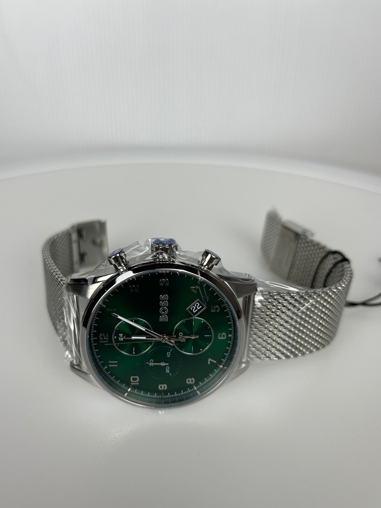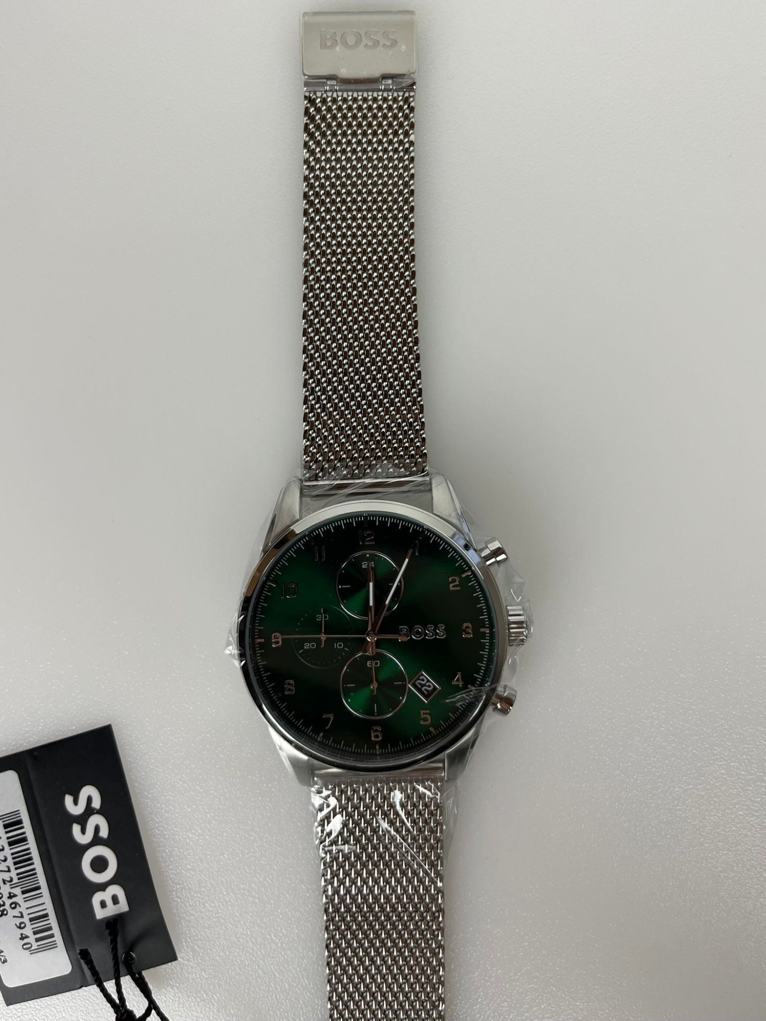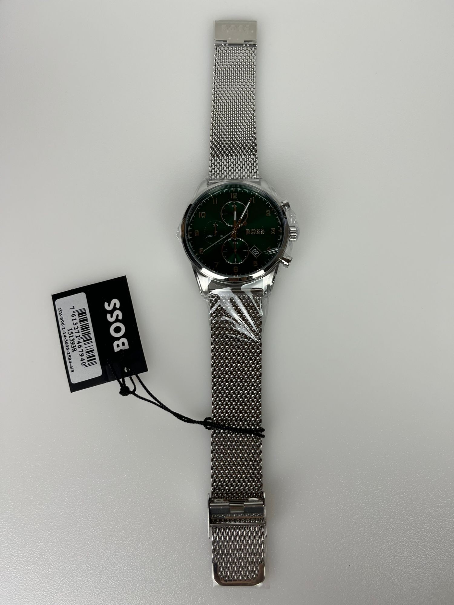 Neu OVP 1513938 Marke: BOSS Verschlussart: Druckknopf Produktmodell: Skymaster 1513938 Armbandmaterial: Stahl Gehäusematerial: Stahl Glas: Mineralglas Wasserdichte: 5 ATM Gehäusedurchmesser: 44 mm Armbandbreite: 22 mm Farbe: Silber Farbe des Uhrenarmbands: Silber Farbe des Zifferblatts: Grün Uhrwerk: Quarz