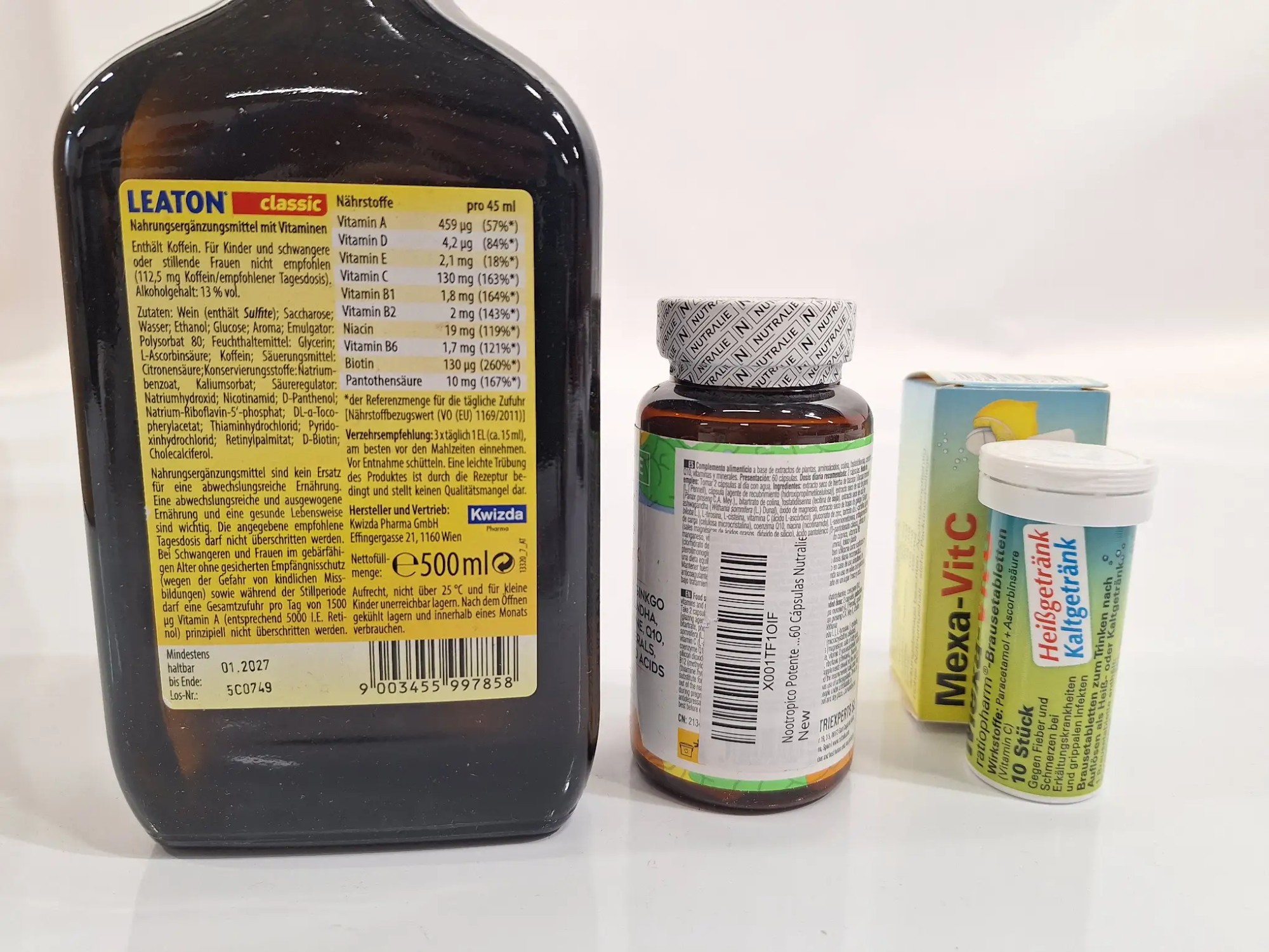 3x Nahrungsergänzungsmittel, 1x Leaton 500 ml, 1x Brain Complex 60 Kapseln, 1x Mexa-VitC 10 Stück, 1x ProMacula