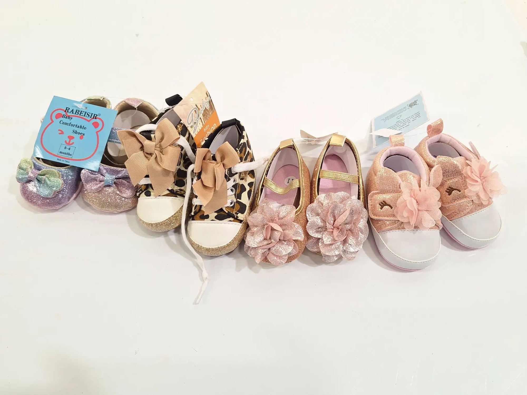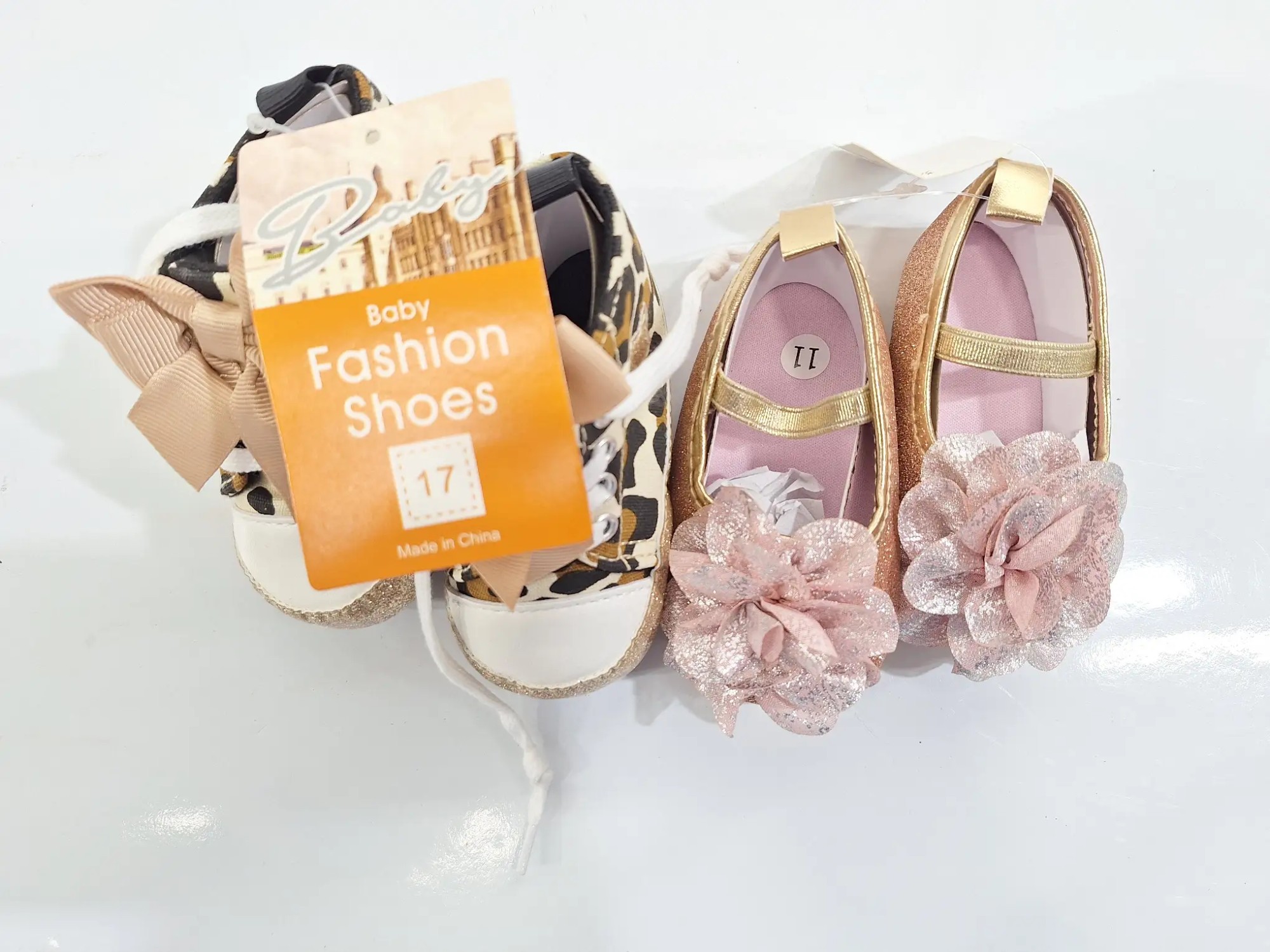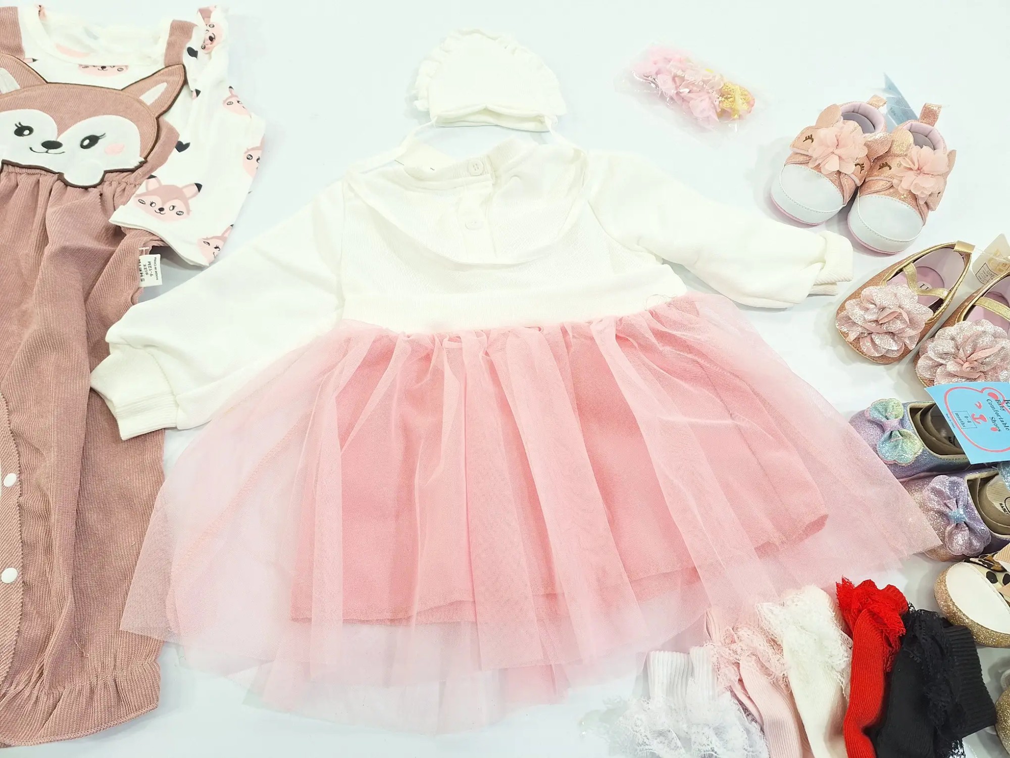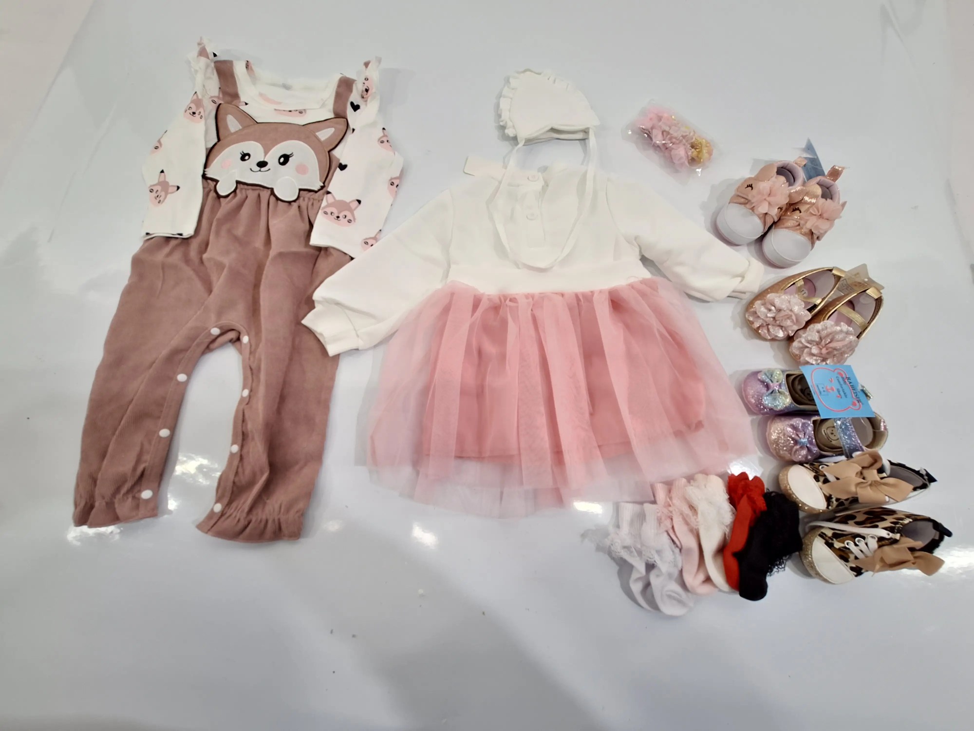 2x Schuhe Größe 0-6, 1x Schuhe Größe 17, 2x Schuhe Größe 11, 1x Packung Socken, 2x Kinderoutfit Größe 9-11