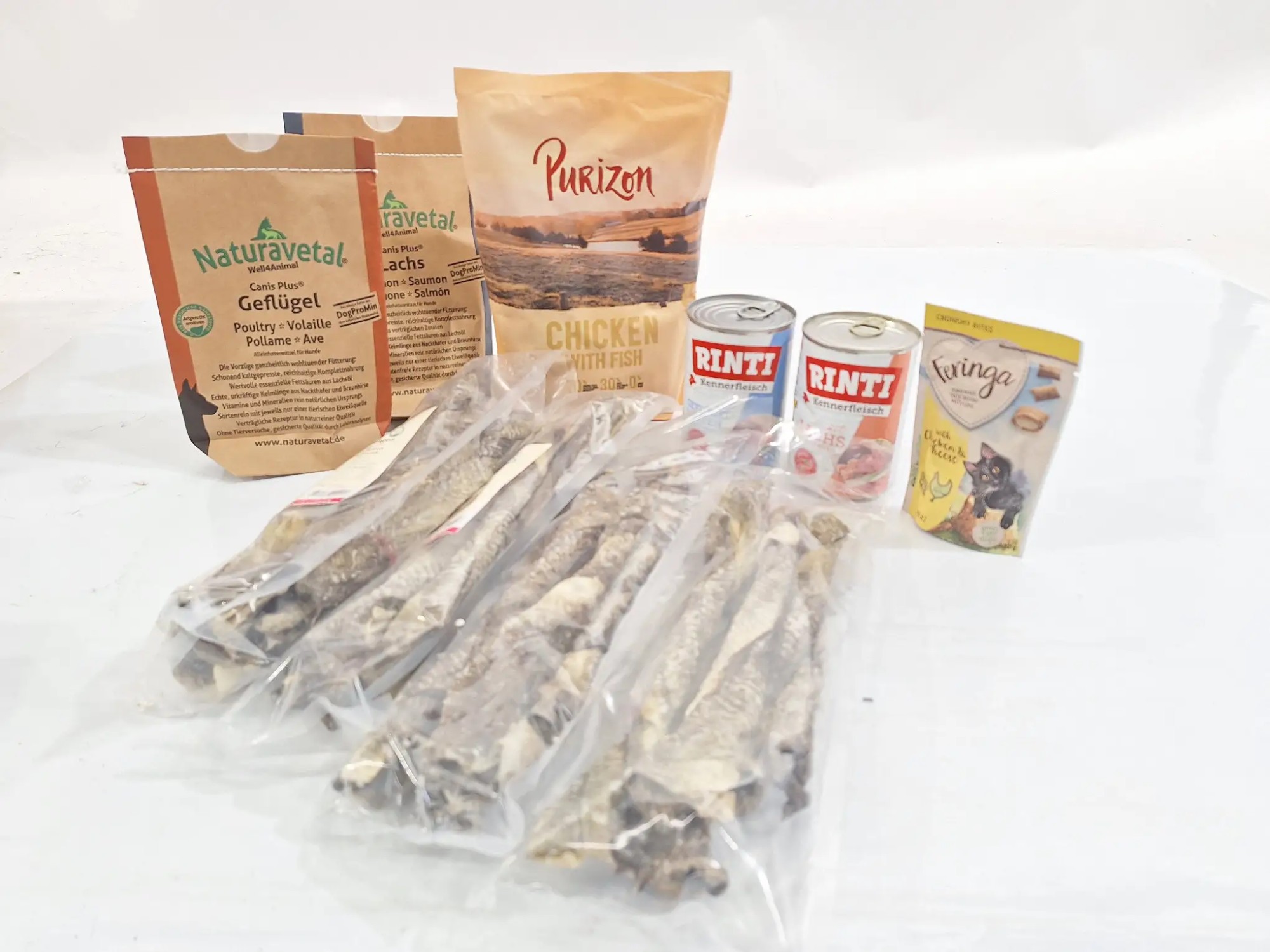 2x Hundefutterdosen je 400 g, 4x Packungen Katzenfutter (1x 400 g, 1x 30 g, ...) 1x Packung Fischhautstangen für Hunde je 5 Stück