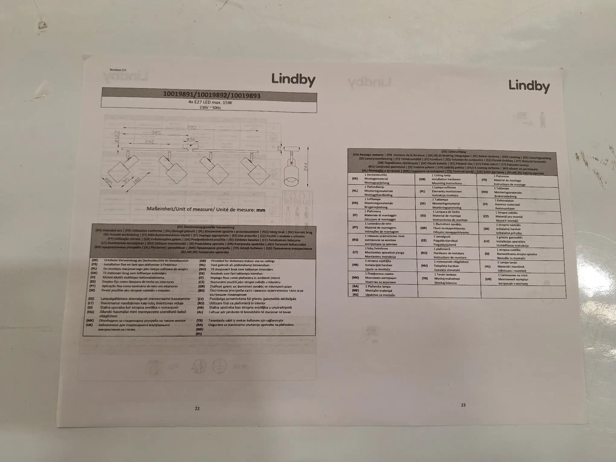 Länge79,5xmxBreite244cm, Art.Nr. 10019891/10019892/10019893, 4xE27 LED max. 15W, 230V~50Hz