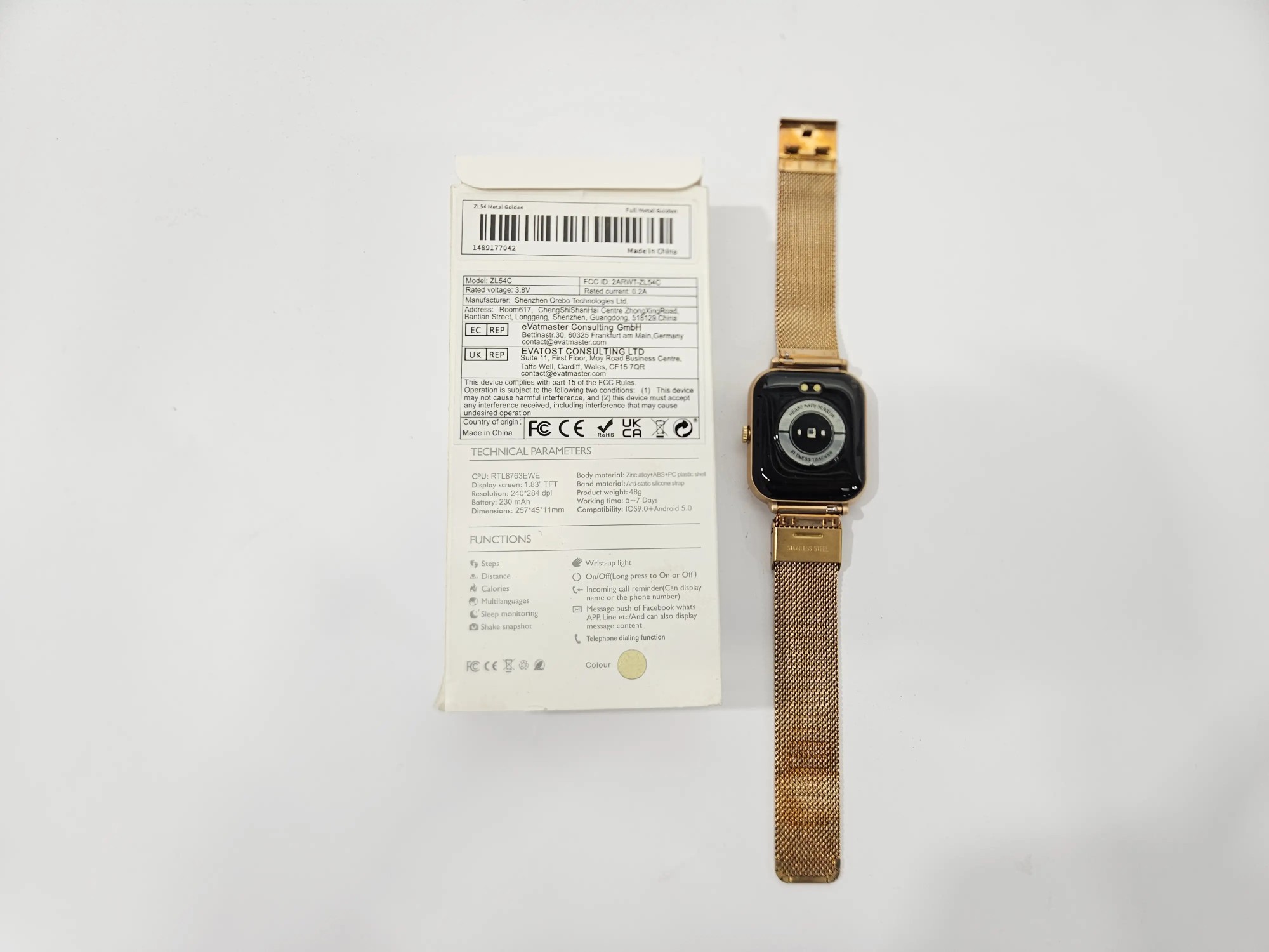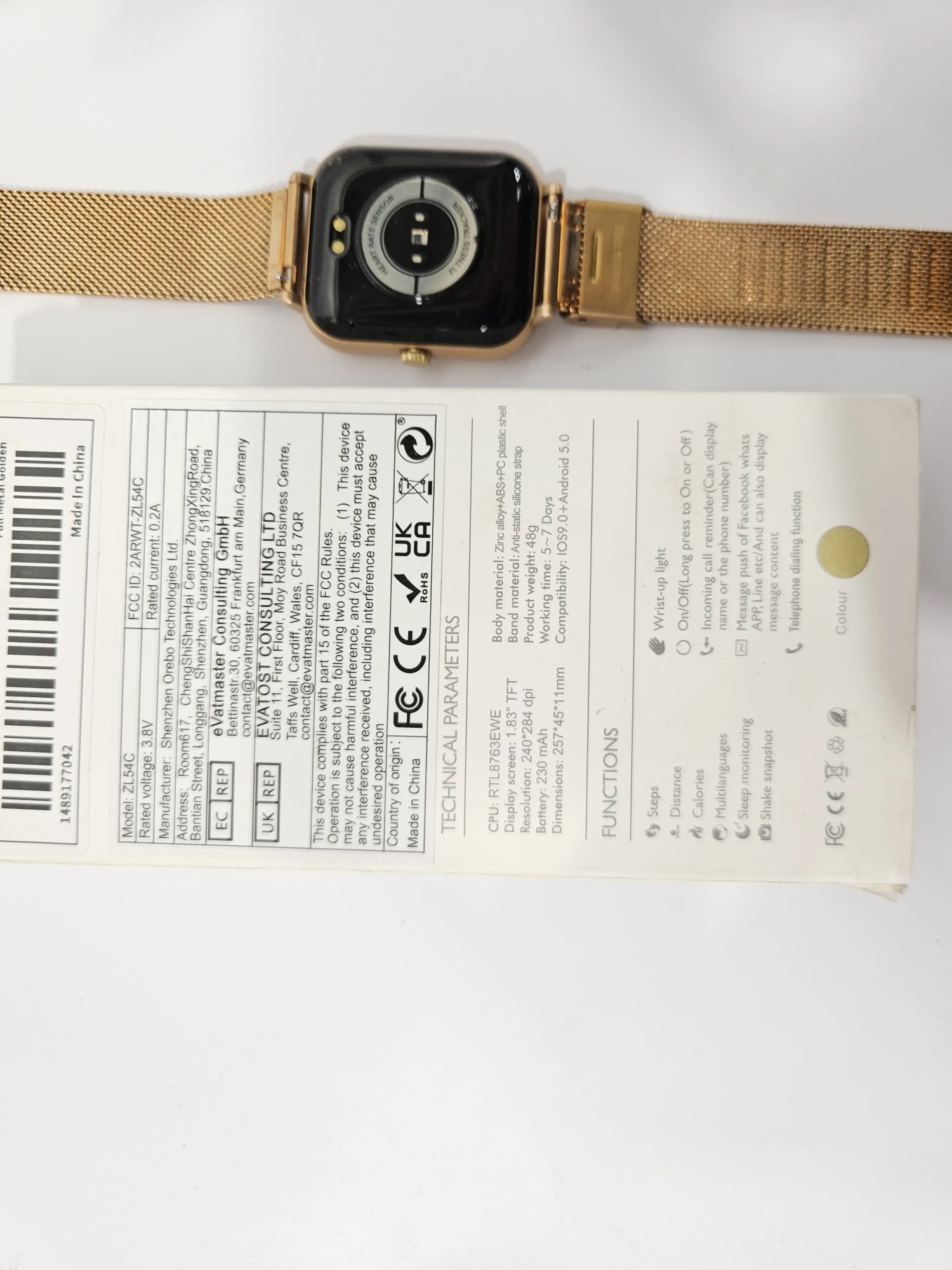 Farbe: Rose Gold Modell: ZL54C Dimension: 257*45*11 mm Schritte, Distanz, Kalorien, Schlafüberwachung, Nachrichten, Anrufe,