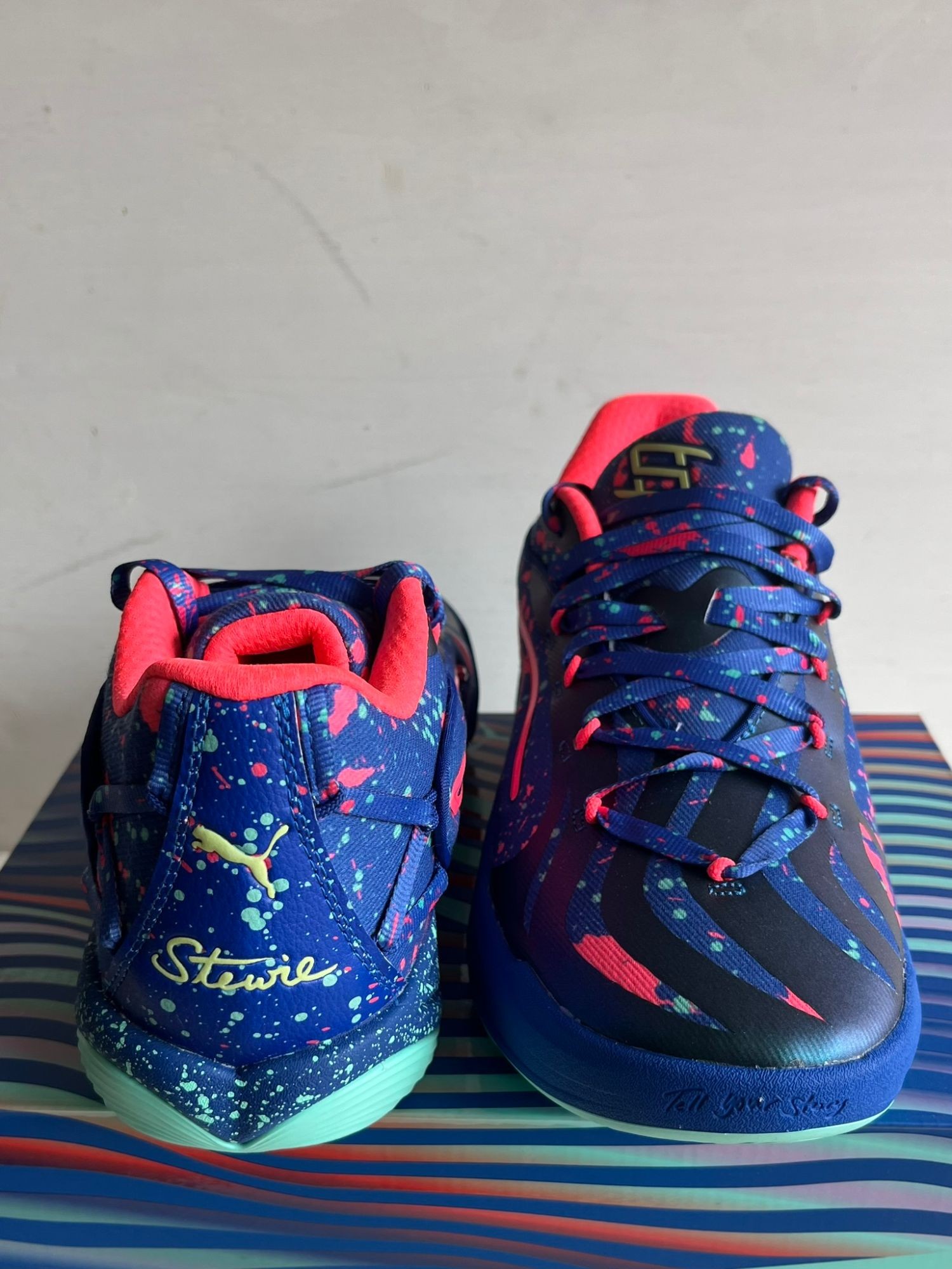 Unisex 311497-01 Neu OVP Der PUMA Stewie 4 Night Vision zeigt lebendige Farben, inspiriert von dem Phänomen des weißen Lichts, das durch ein Prisma gebrochen wird. Farbspritzer in Türkis und Fuchsia bedecken das blaue, technische Mesh-Obermaterial, das mit Schnürsenkeln gesichert ist, die durch kordierte Ösen geführt werden. Der Formstrip ist in Neonpink umrandet, passend zur textilen Krageninnenfütterung. Breanna Stewarts vierter Signature-Schuh ruht auf einer gesprenkelten PROFOAM-Mittelsohle, die aus einer hochprallen EVA-Verbindung besteht.